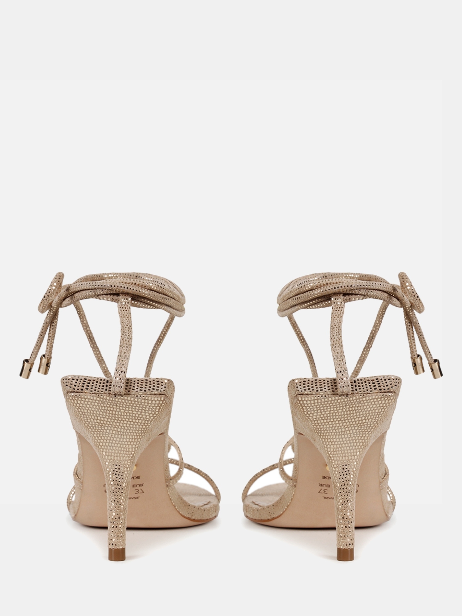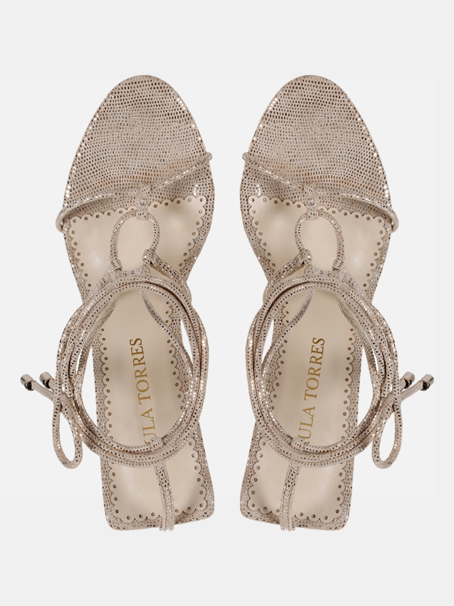 A Sandália Audrey é confeccionada em couro. Modelagem em bico arredondado e base traseira quadrada, conta com cabedal composto por finas tiras de couro e salto agulha. O desenho das tiras sob o peito do pé, criam uma estética contemporânea e sofisticada. O fechamento por amarração finalizada por ponteiras metálicas arremata a peça. A variação na cor bege tem como diferencial os detalhes brilhantes no couro, conferindo elegância.