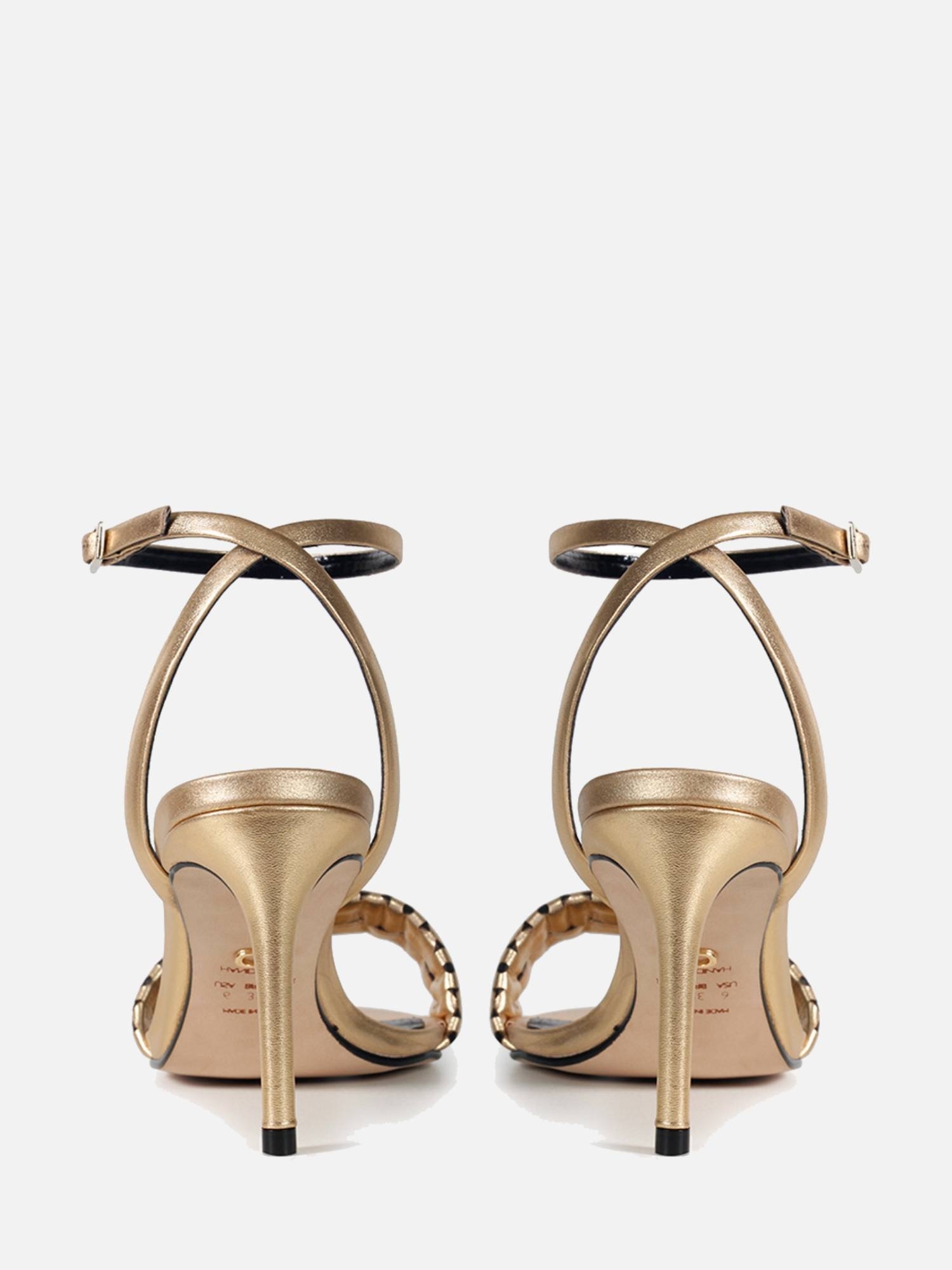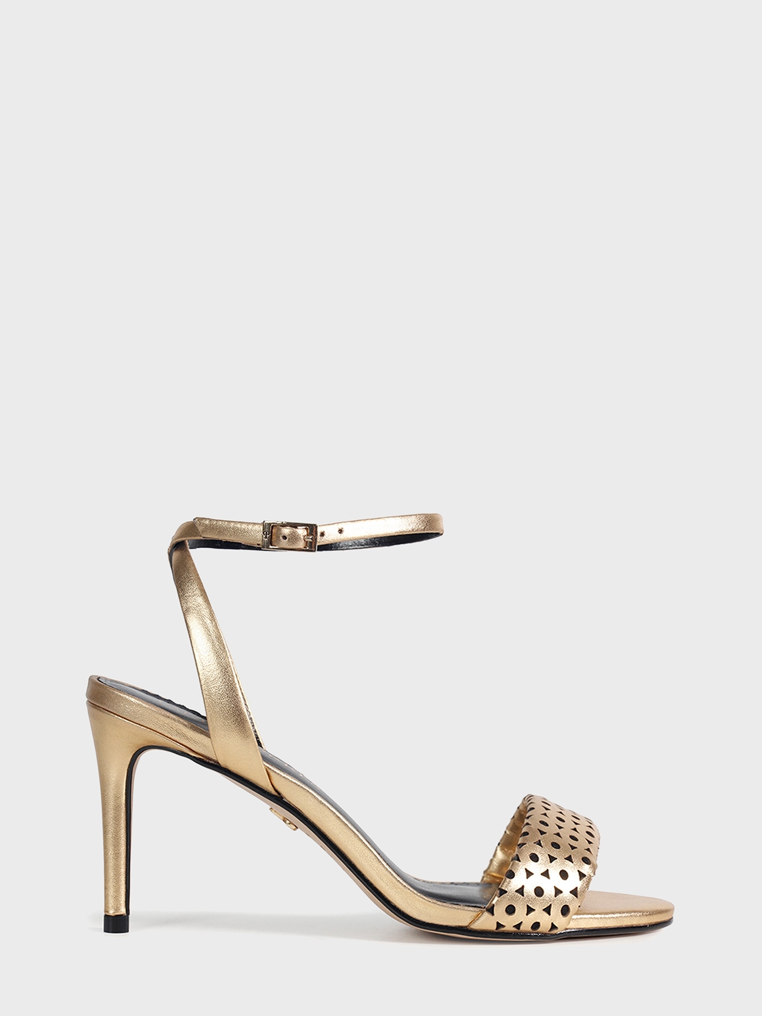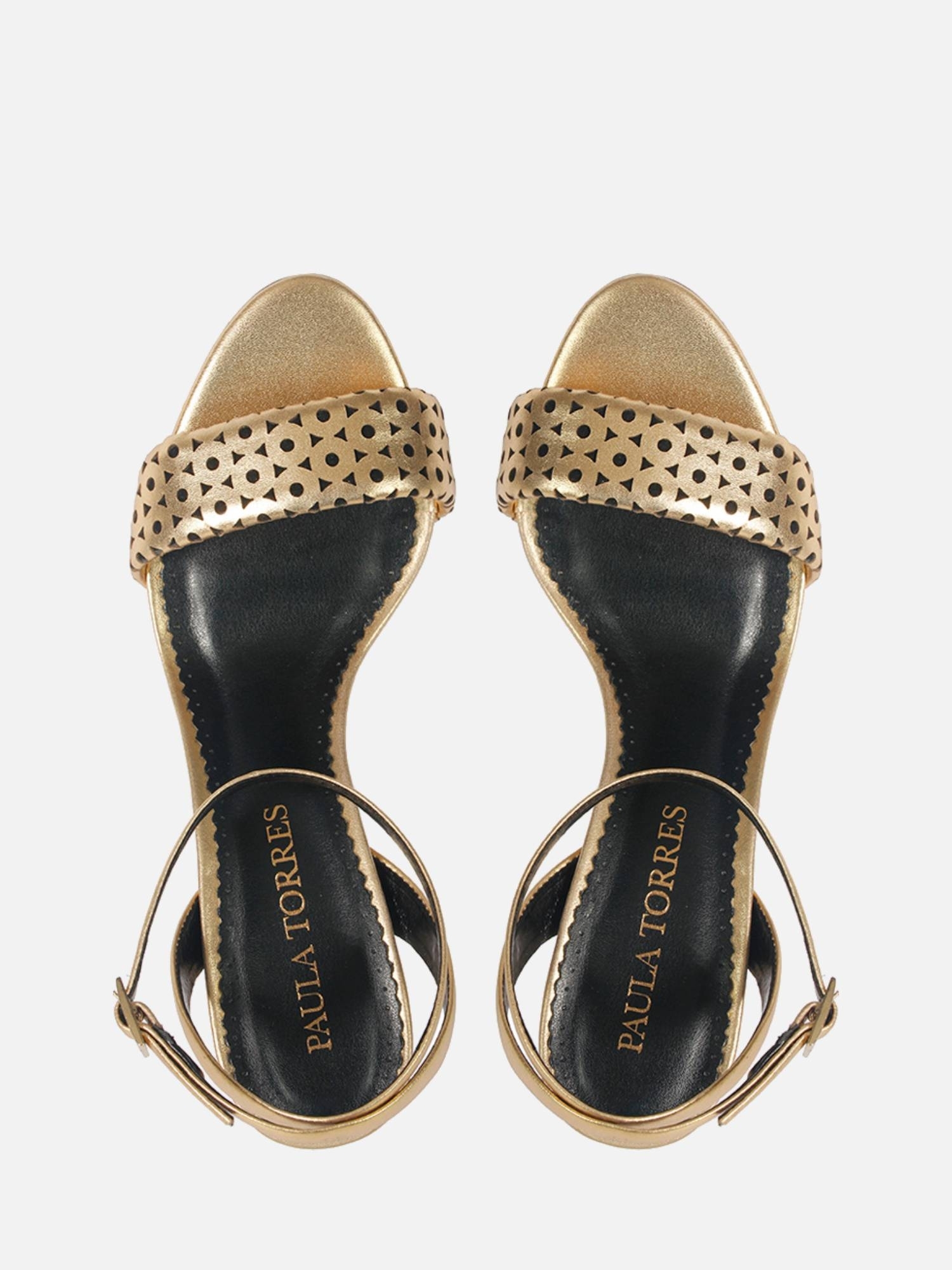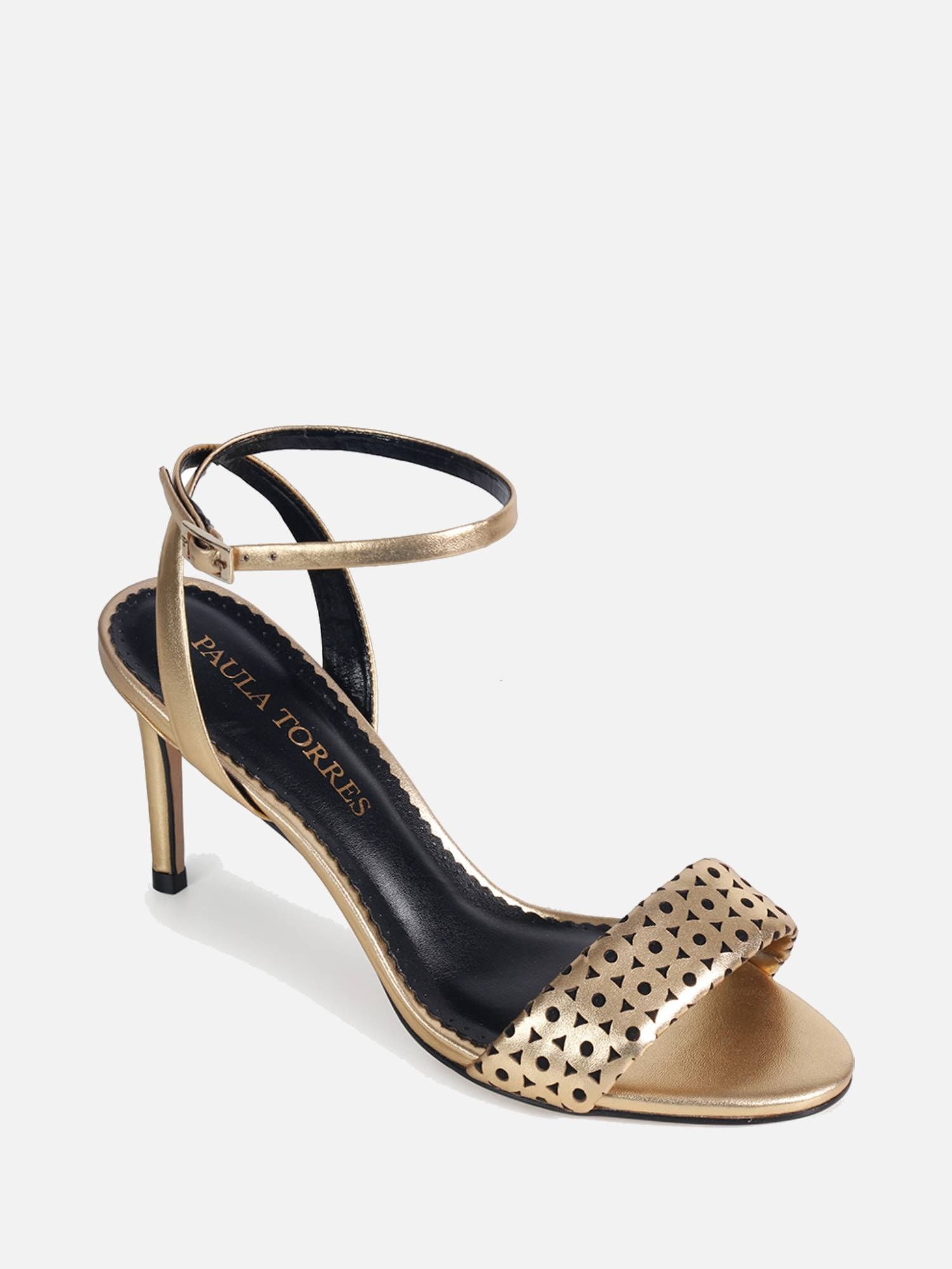 A Sandália Ávila é confeccionada em couro sintético na parte interna, com um salto médio e o bico arredondado. O cabedal em couro com desenho geométrico cortado a laser traz um ar de modernidade ao modelo clássico Paula Torres.