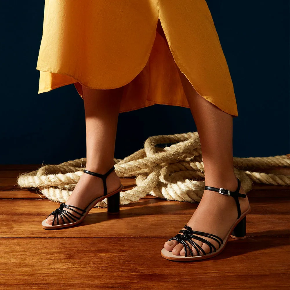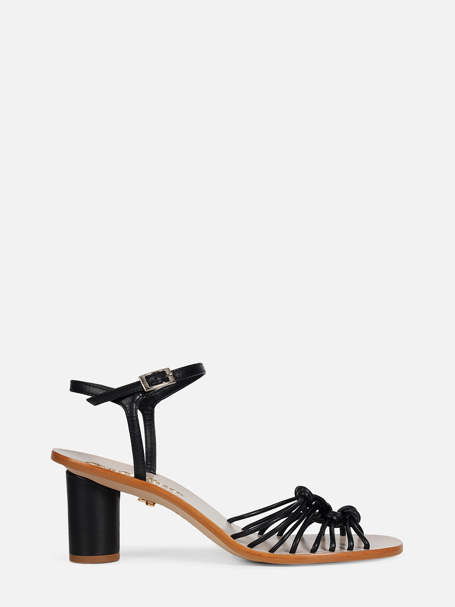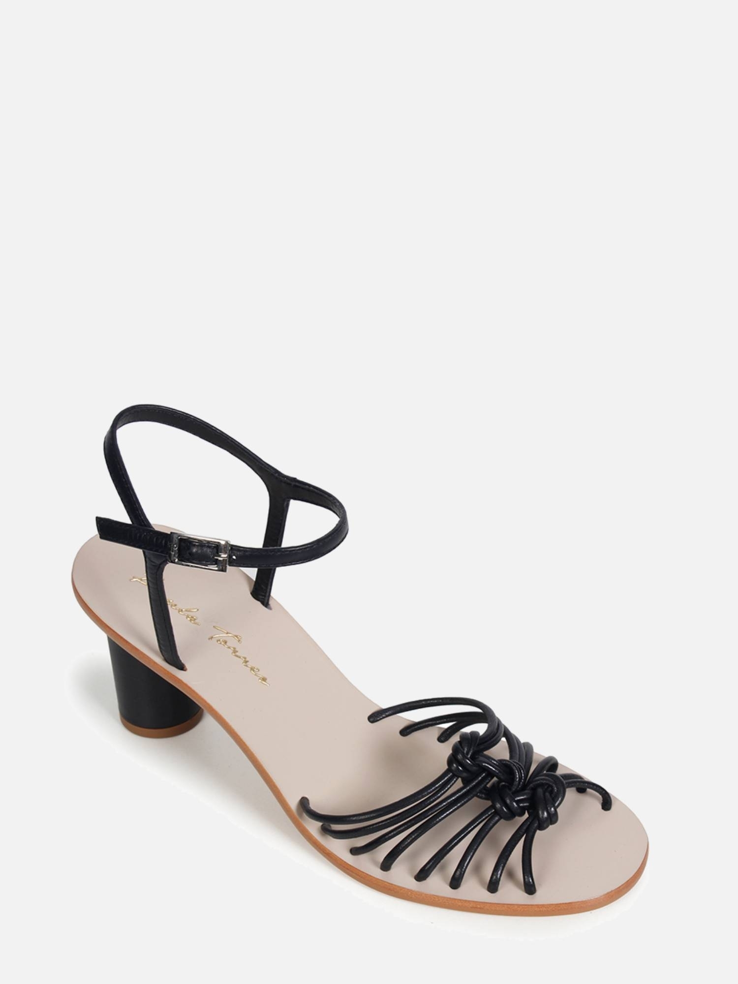 A Sandália Ayla é confeccionada em couro. Modelagem em bico redondo com salto grosso redondo. Cabedal formado por tiras finas com um nós encapadas em couro. Fechamento lateral por fivela. Parte inferior do solado e do salto em madeira, caracterizando este modelo Ayla de maneira tropical e elegante, nova tendência Verão 22 Paula Torres.