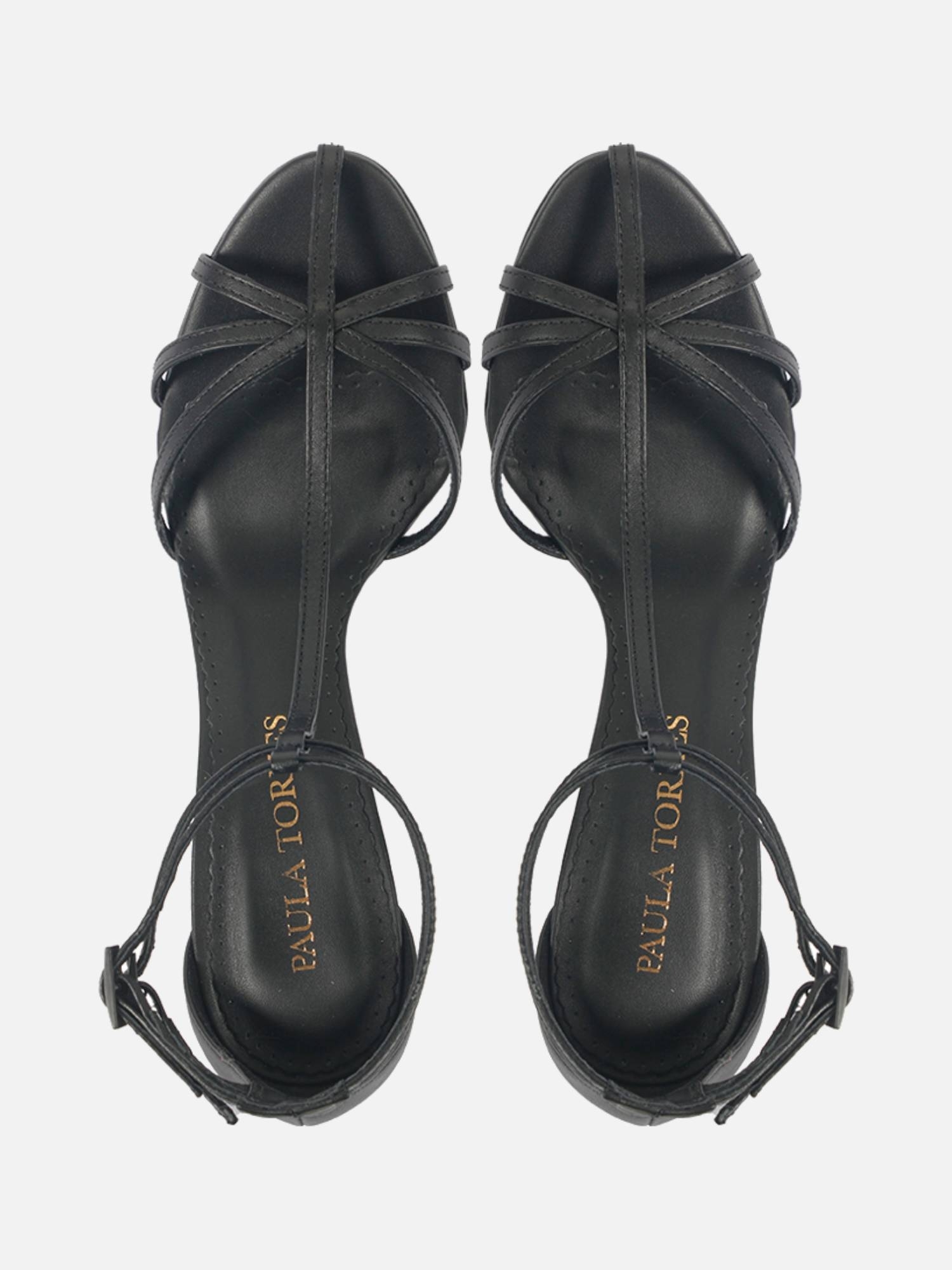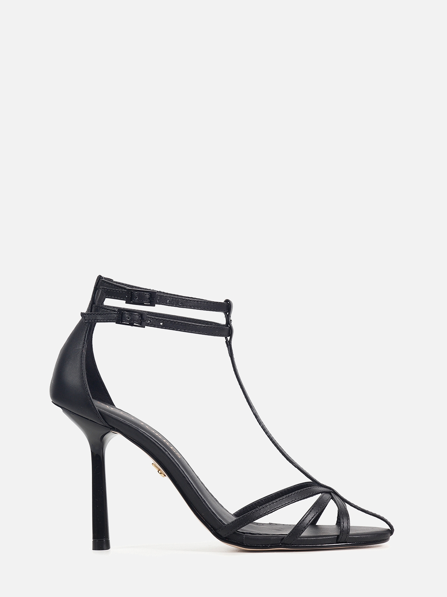 A Sandália Baden é confeccionada em napa. Modelo com bico arredondado e salto alto fino. Cabedal composto por tiras finas e delicadas e uma tira vertical do bico até o tornozelo. Detalhe para o fechamento por fivelas com o monograma da marca.
