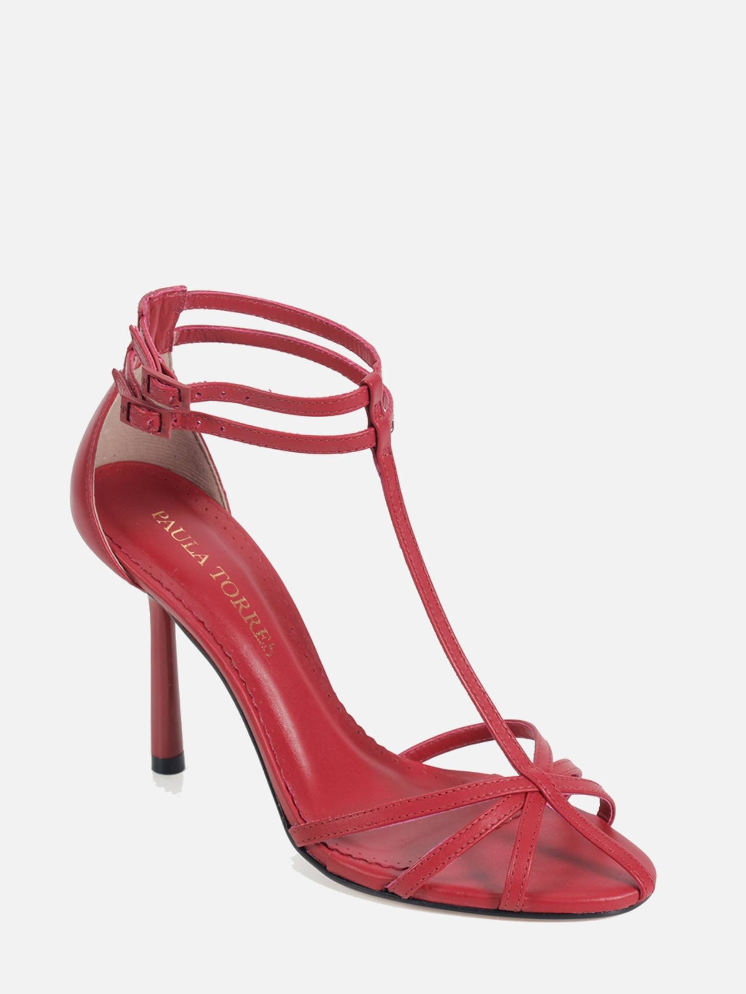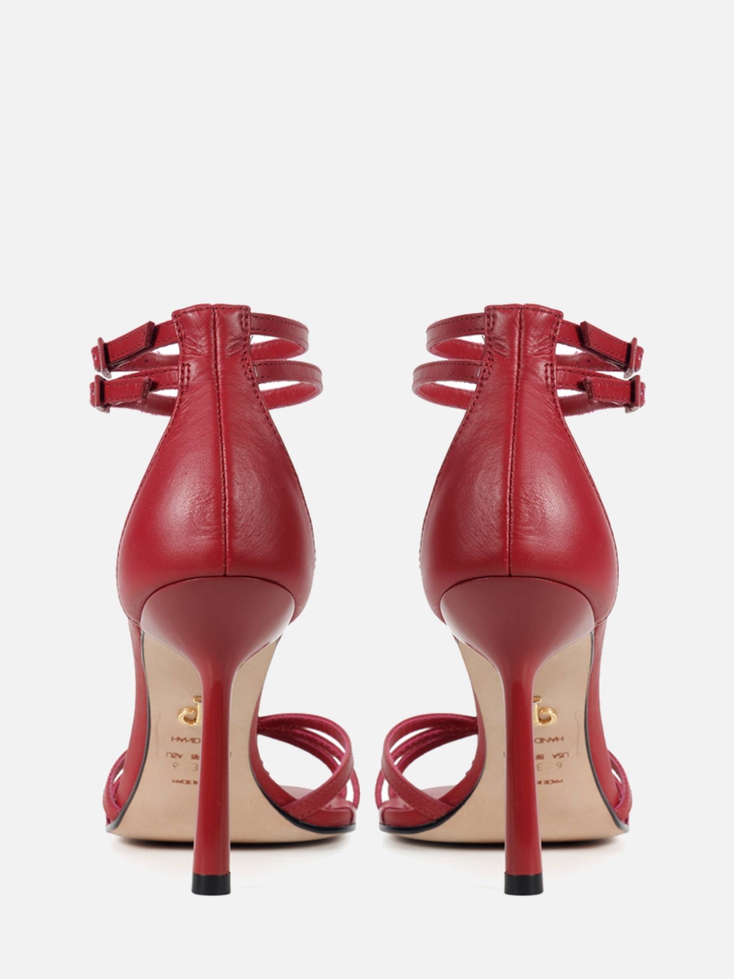 A Sandália Baden é confeccionada em napa. Modelo com bico arredondado e salto alto fino. Cabedal composto por tiras finas e delicadas e uma tira vertical do bico até o tornozelo. Detalhe para o fechamento por fivelas com o monograma da marca.