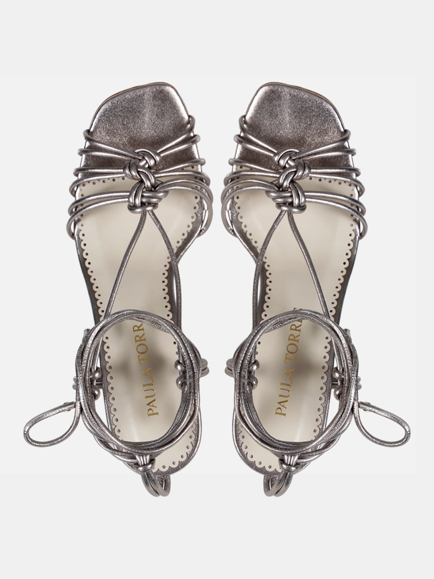 A Sandália Blanca é confeccionada em couro. Modelagem em bico quadrado, levemente arredondado nas extremidades, e salto alto taça. Construção do cabedal em finas tiras de couro, que se conectam por nós, criando uma estética sofisticada e delicada. O fechamento por amarração finalizada por ponteiras metálicas arremata a peça.