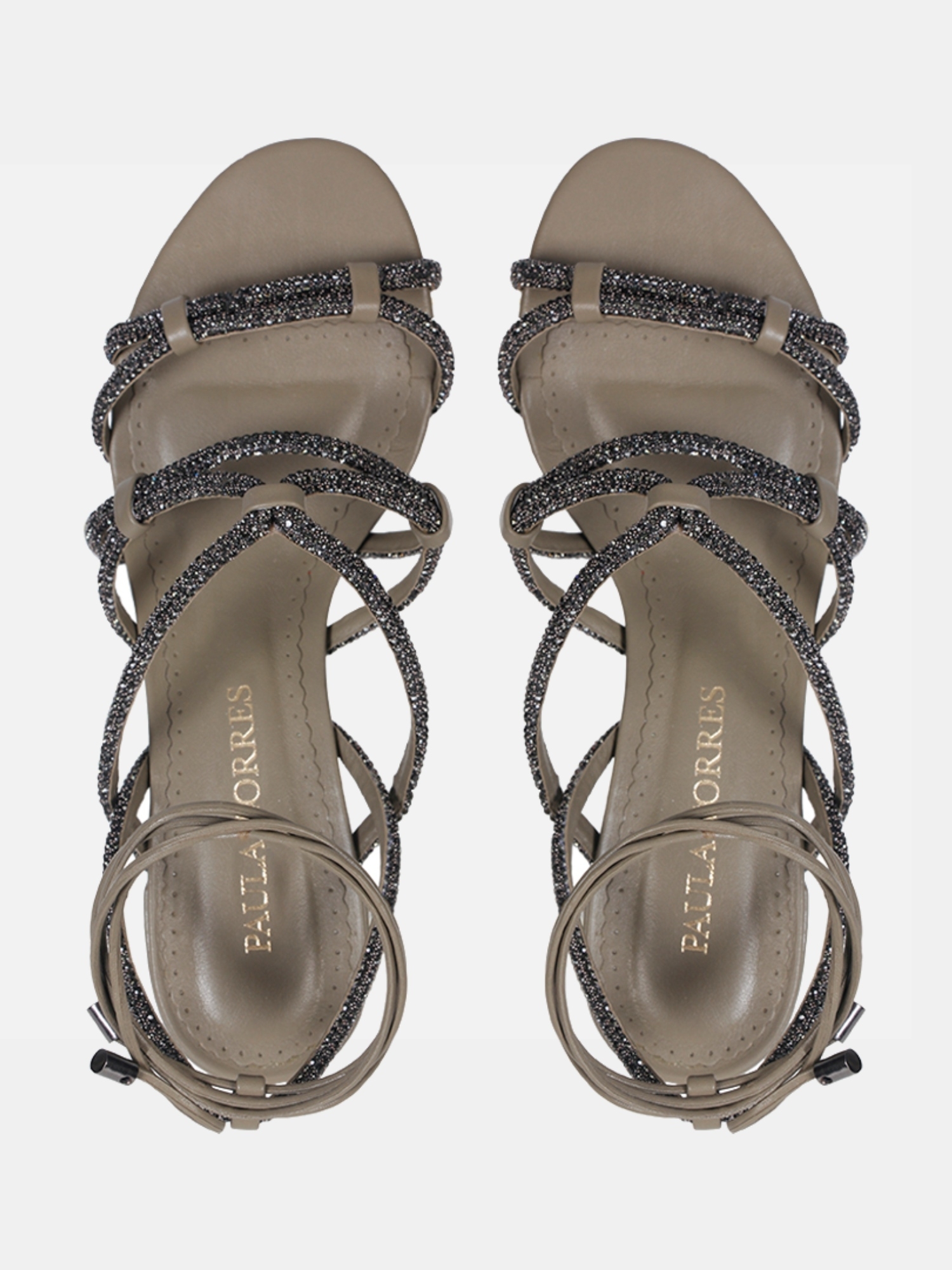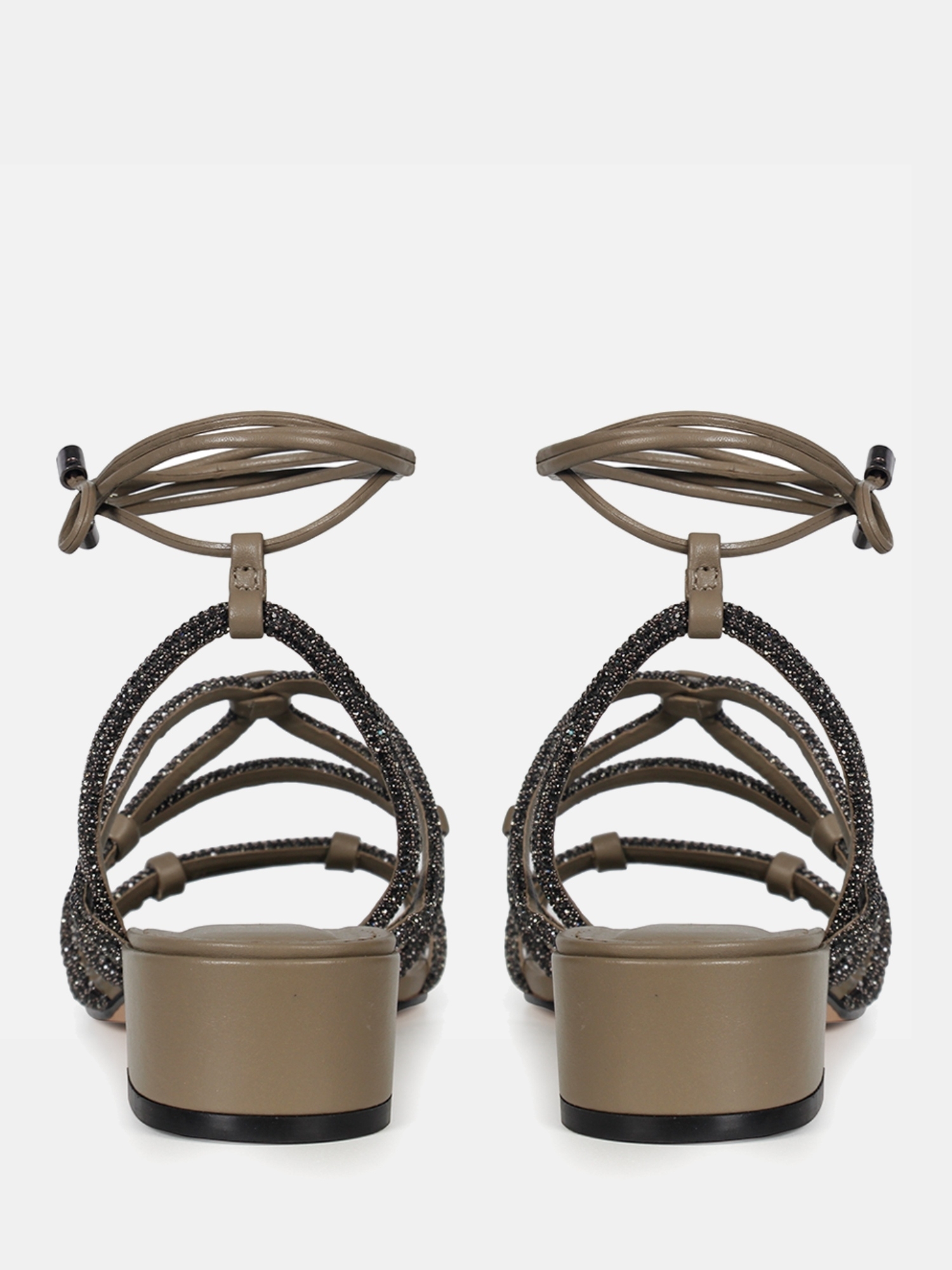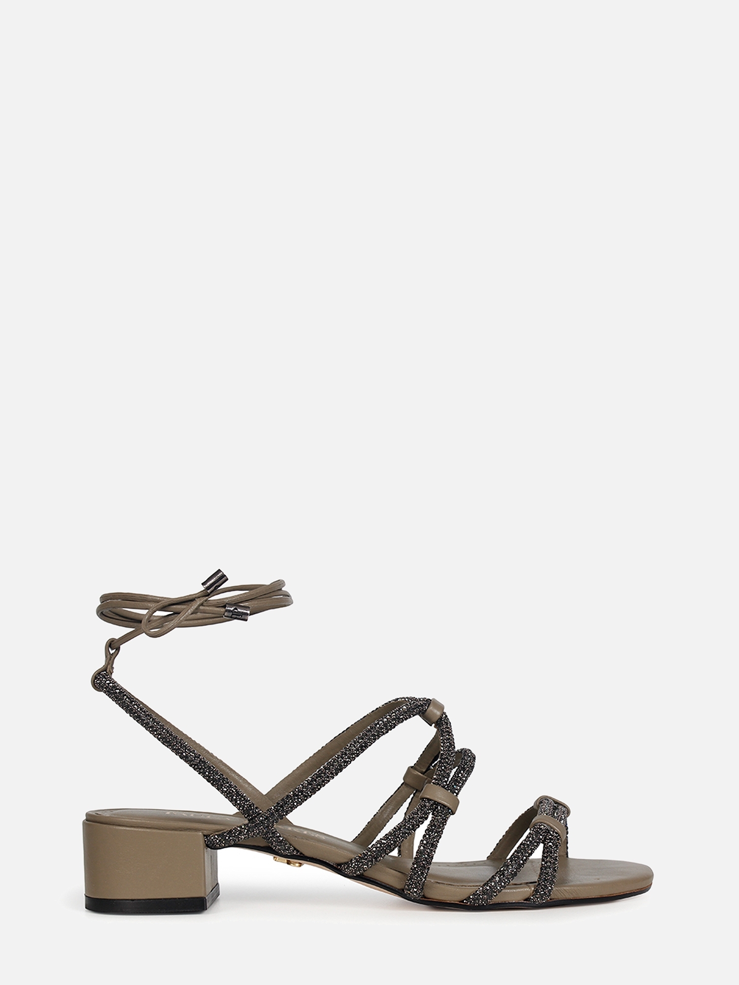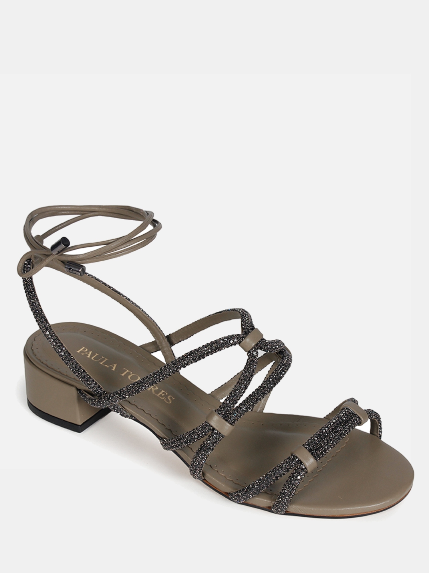 A Sandália Camile é confeccionada em couro. Modelagem em bico redondo e salto baixo bloco. O diferencial da peça são as tiras de couro com cristais embutidos, que se contrapõem com o couro na cor Olive. O design contemporâneo torna o calce sofisticado e confortável. Fechamento por amarração finalizada por ponteiras metálicas arremata a peça.