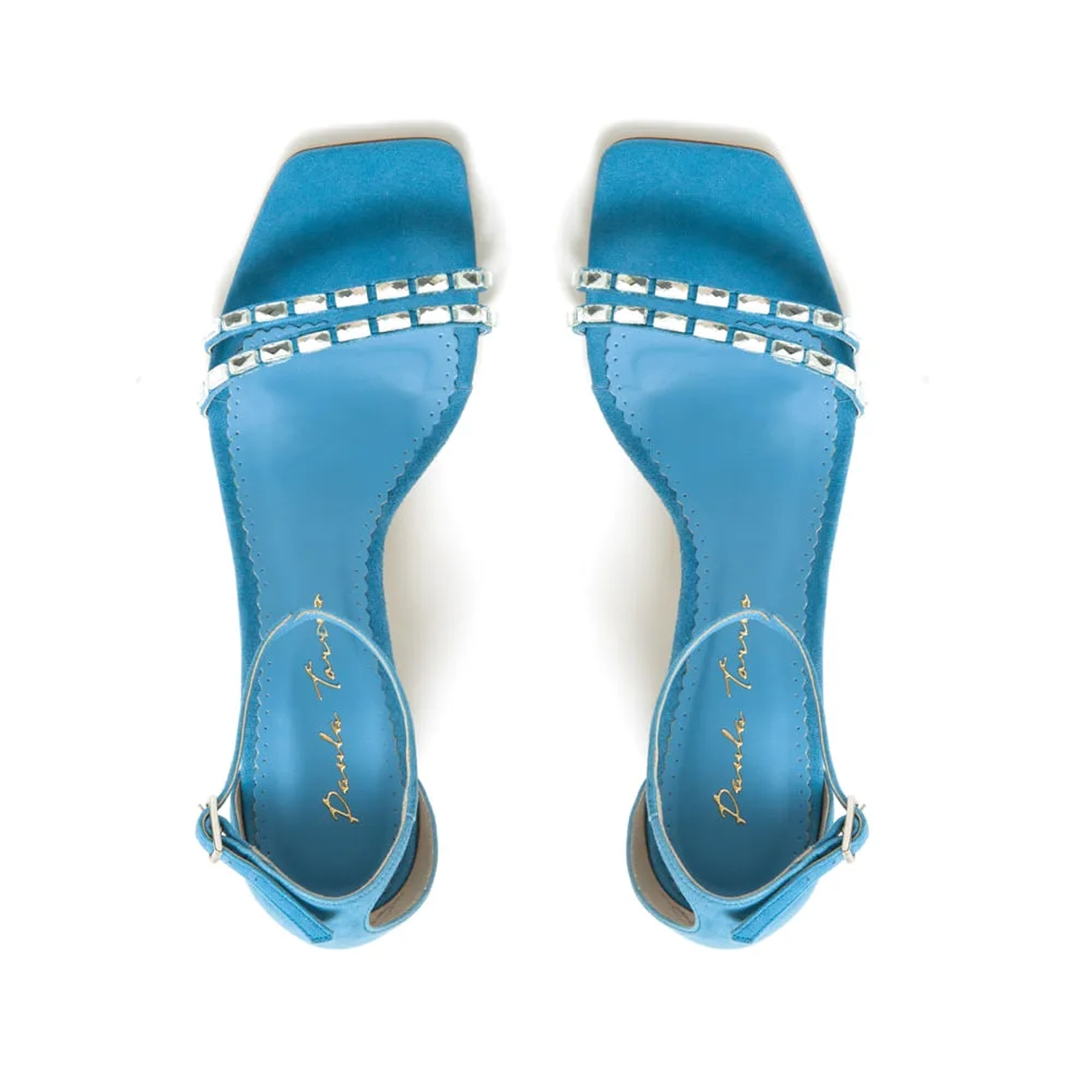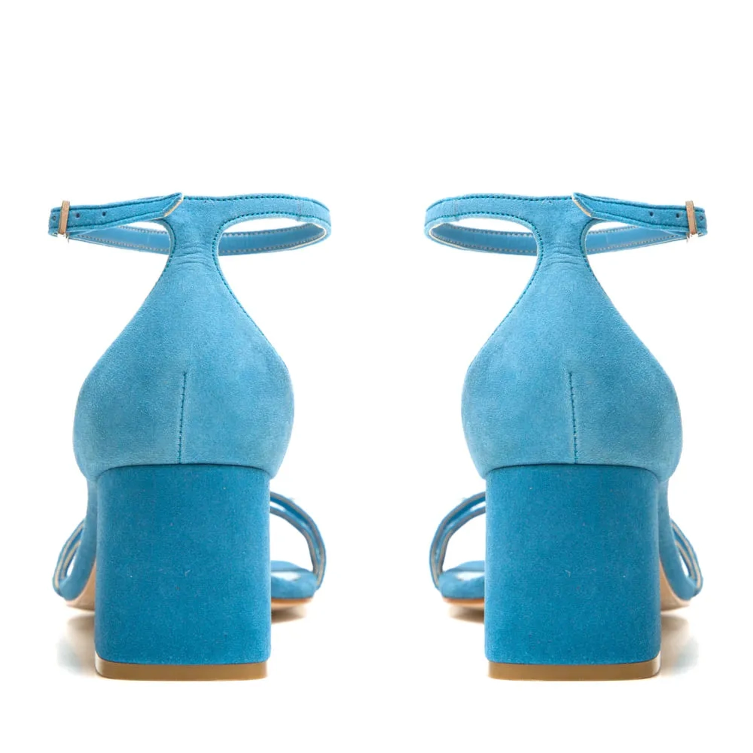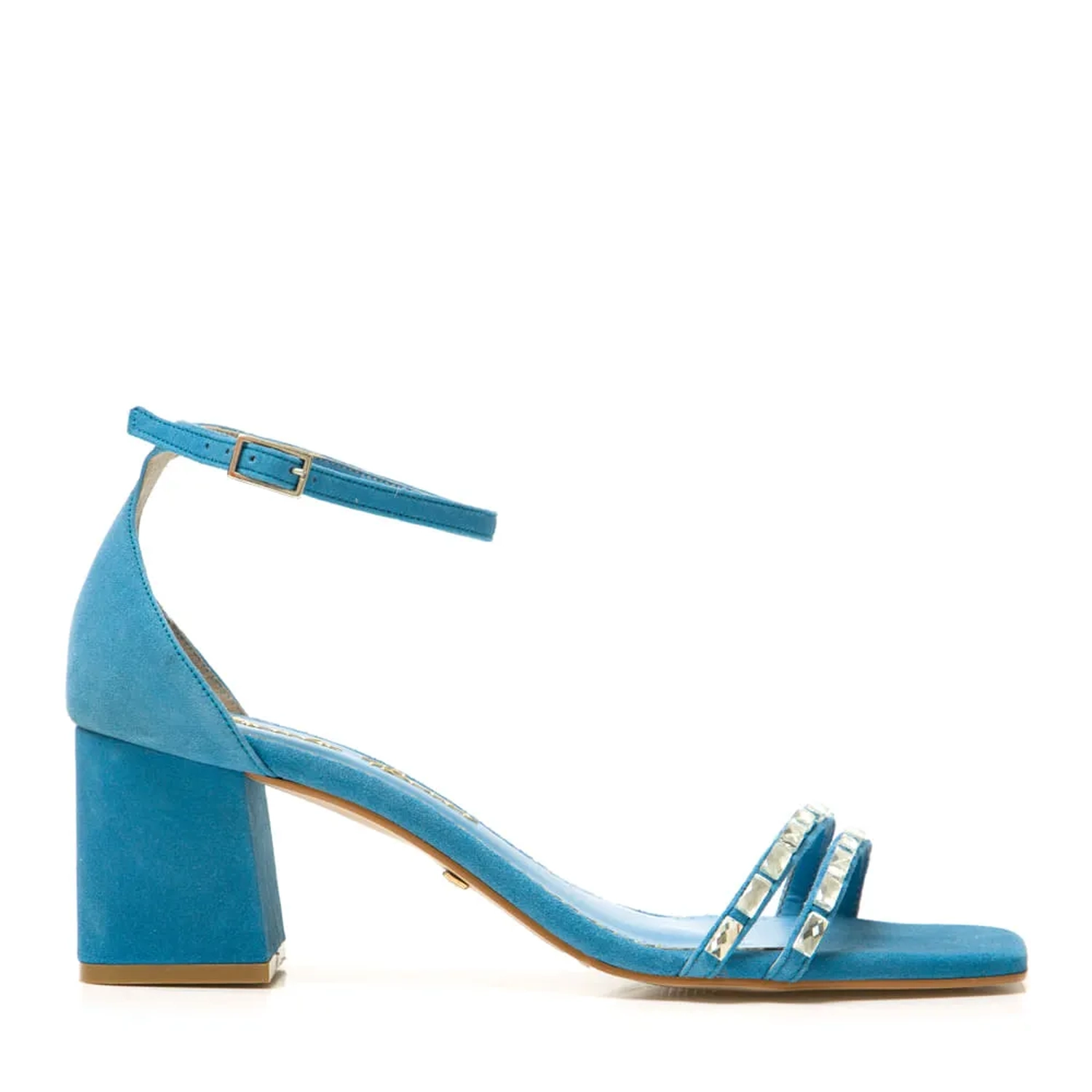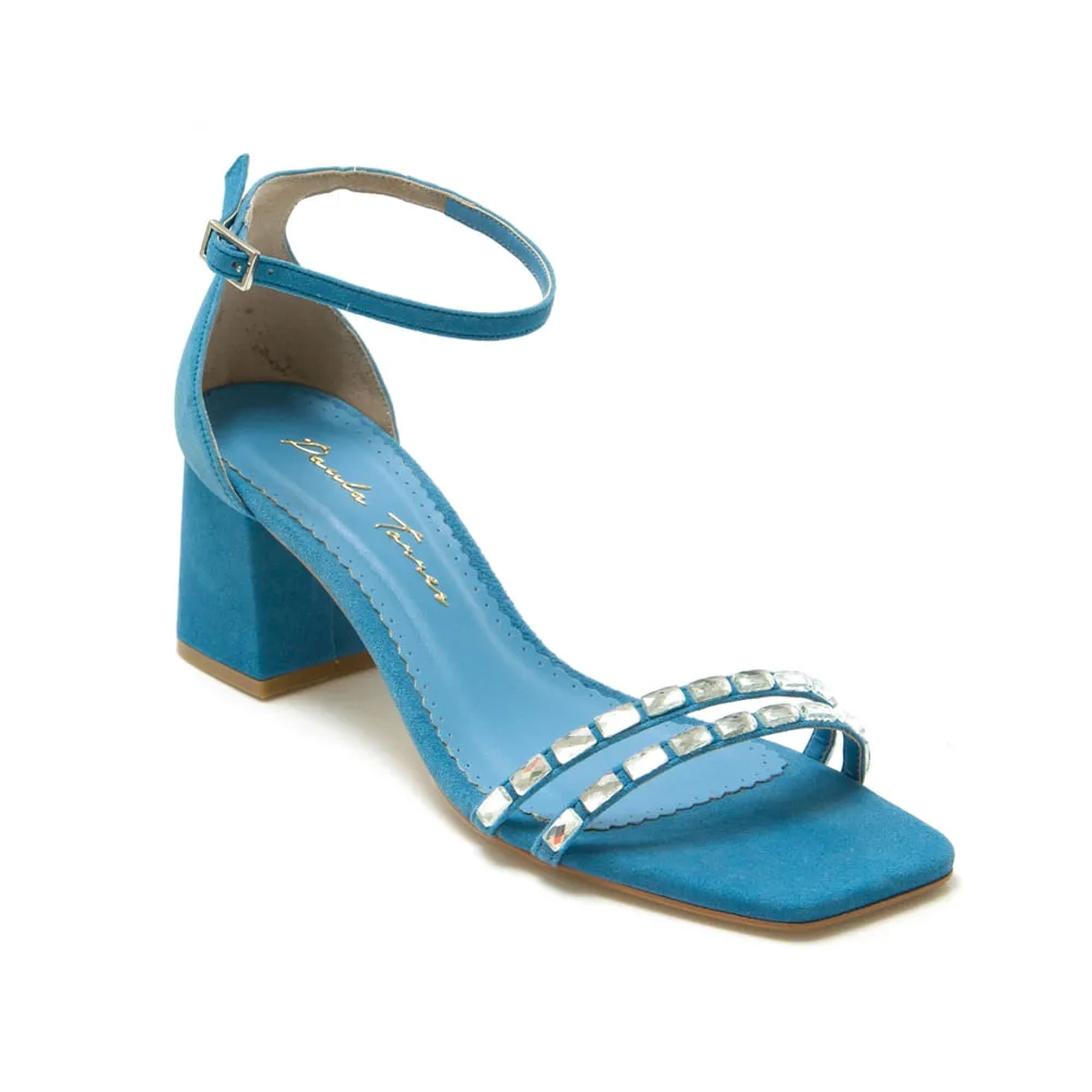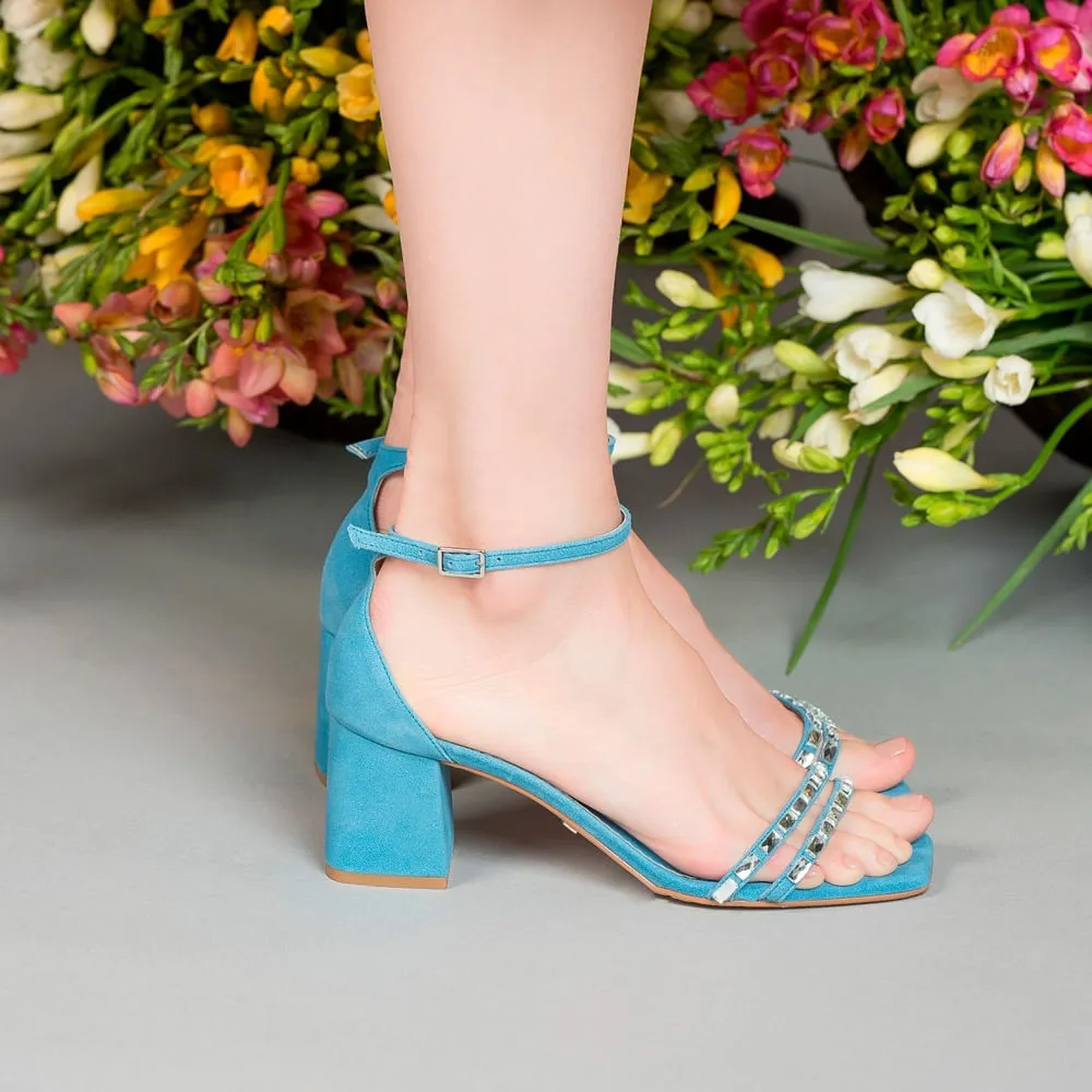 A Sandália Capri é produzida em camurça. A modelagem conta com tiras frontais finas com aplicação de cristais, salto bloco e fechamento por fivela lateral ajustável. Modelo cheio de estilo e conforto.