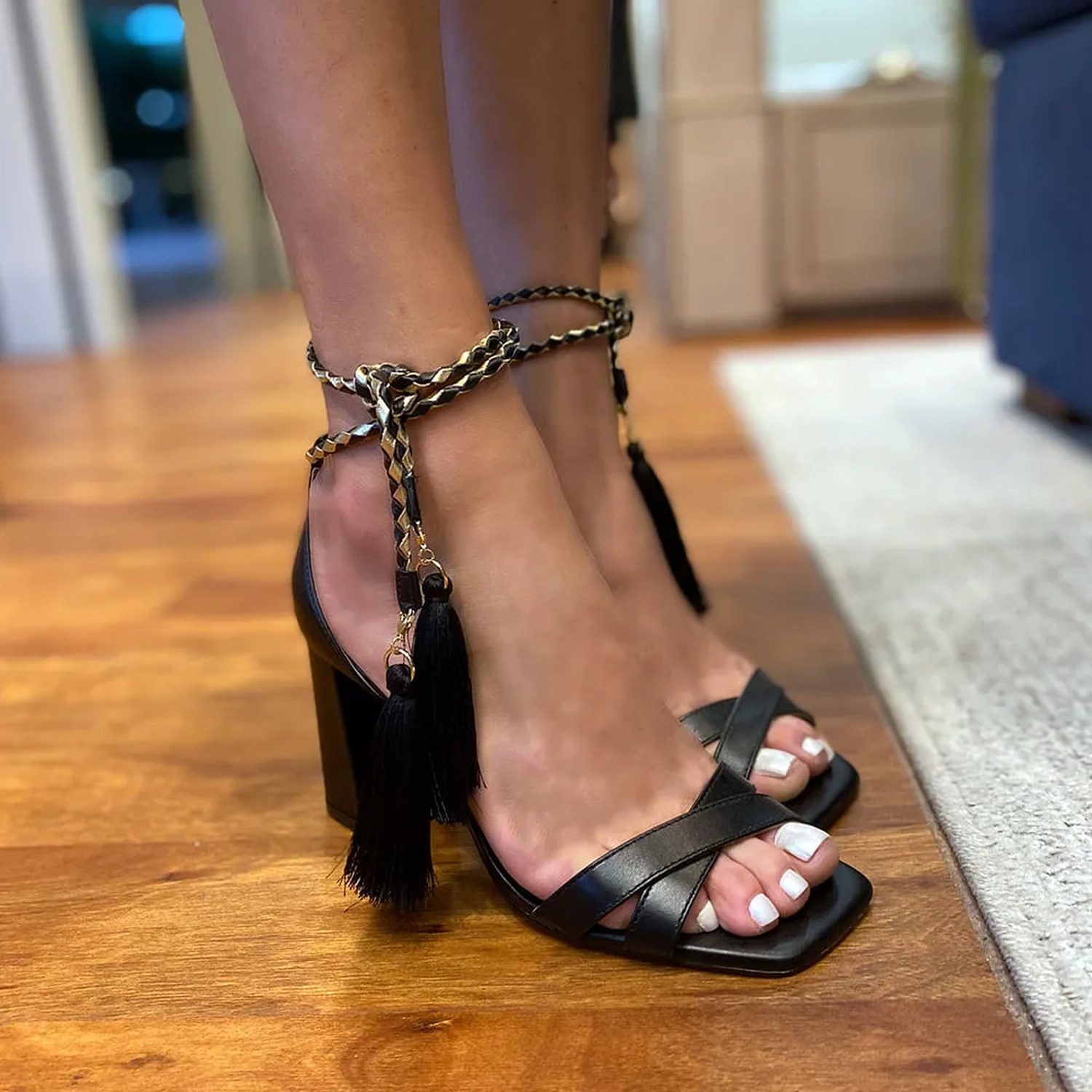 Um charme a parte! O detalhe da amarração com a tira trançada e o barbicacho na ponta já valoriza qualquer produção. O modelo coringa de salto alto e grosso que é um dos mais procurados por aqui, garante conforto absoluto para os seus pés. Esse não pode faltar no seu closet! ;) Cor: Preto Salto: 8.5 CM