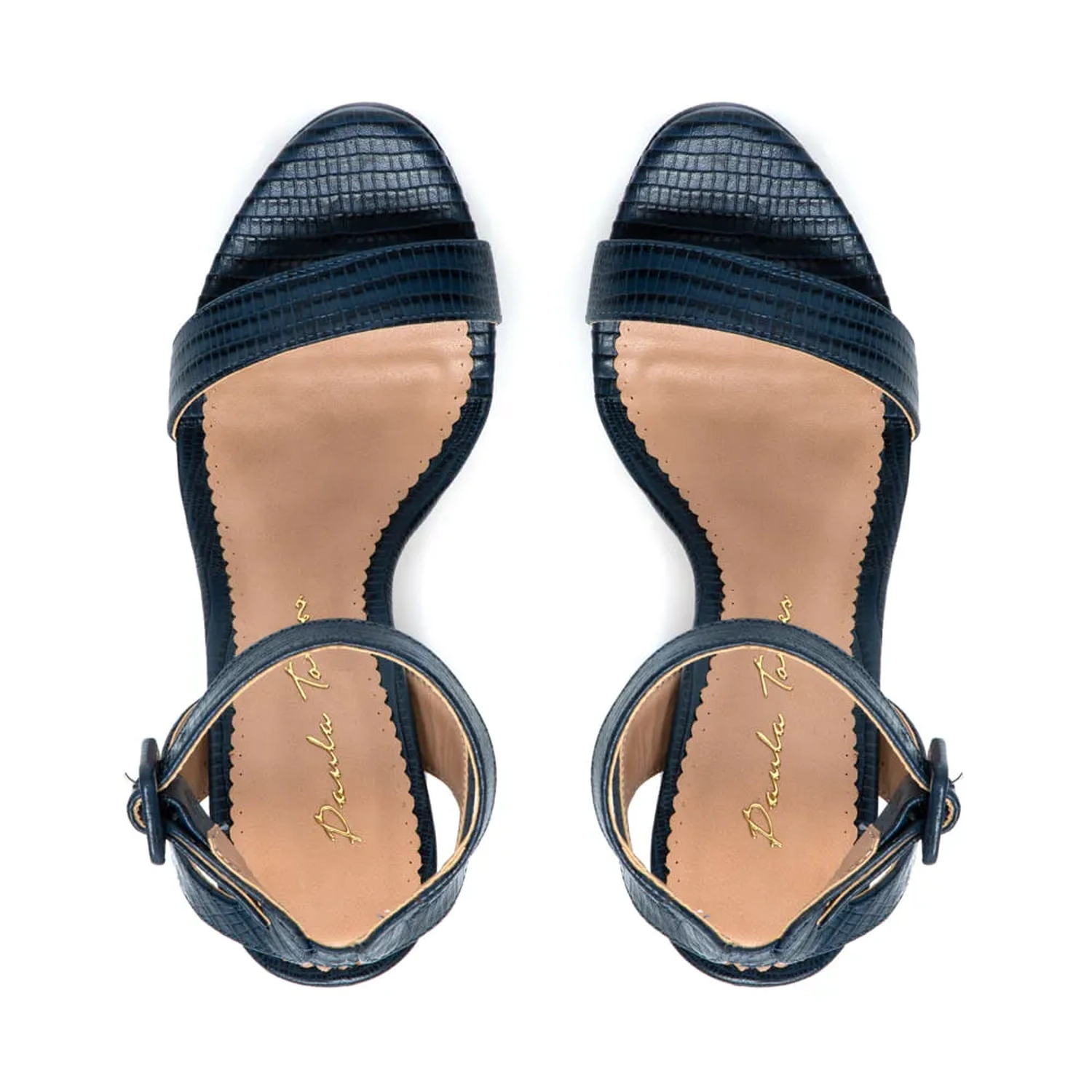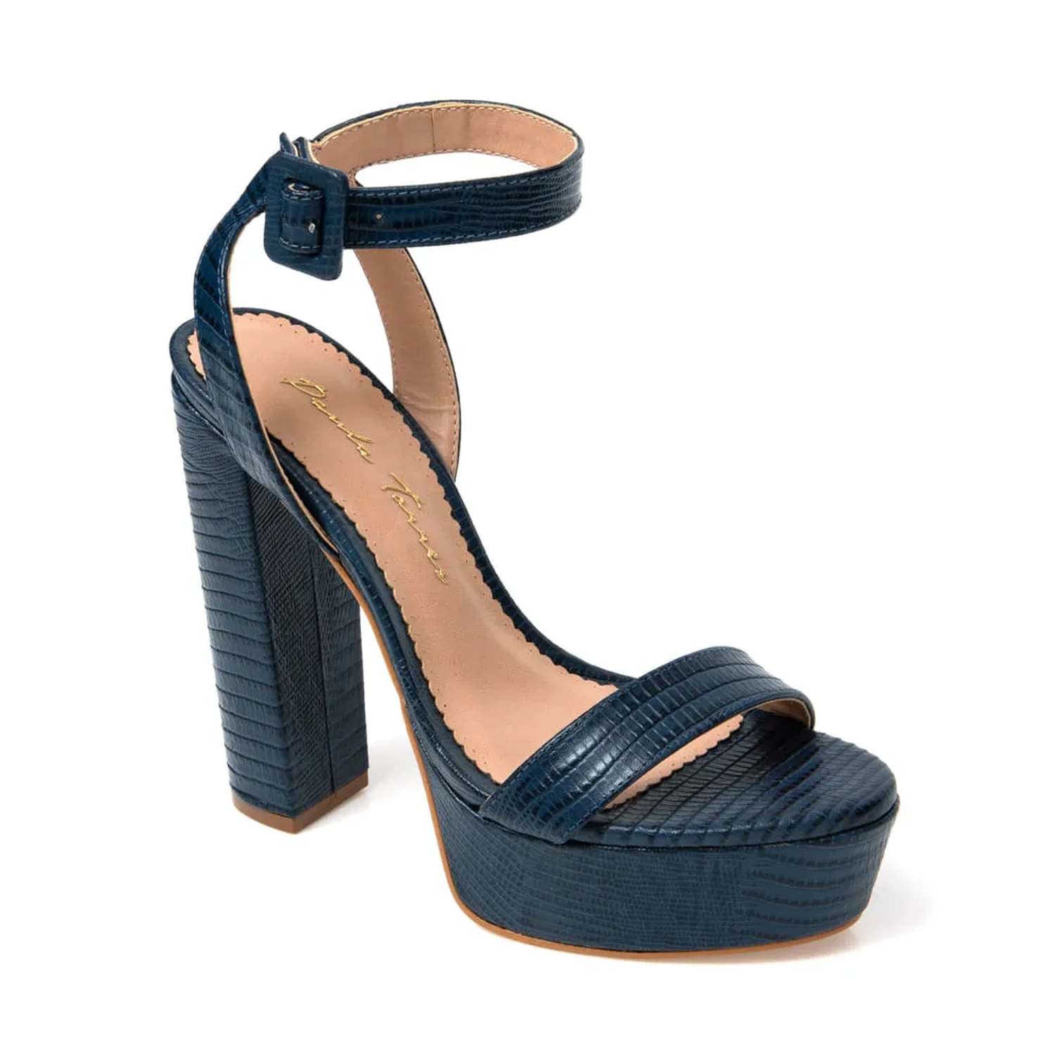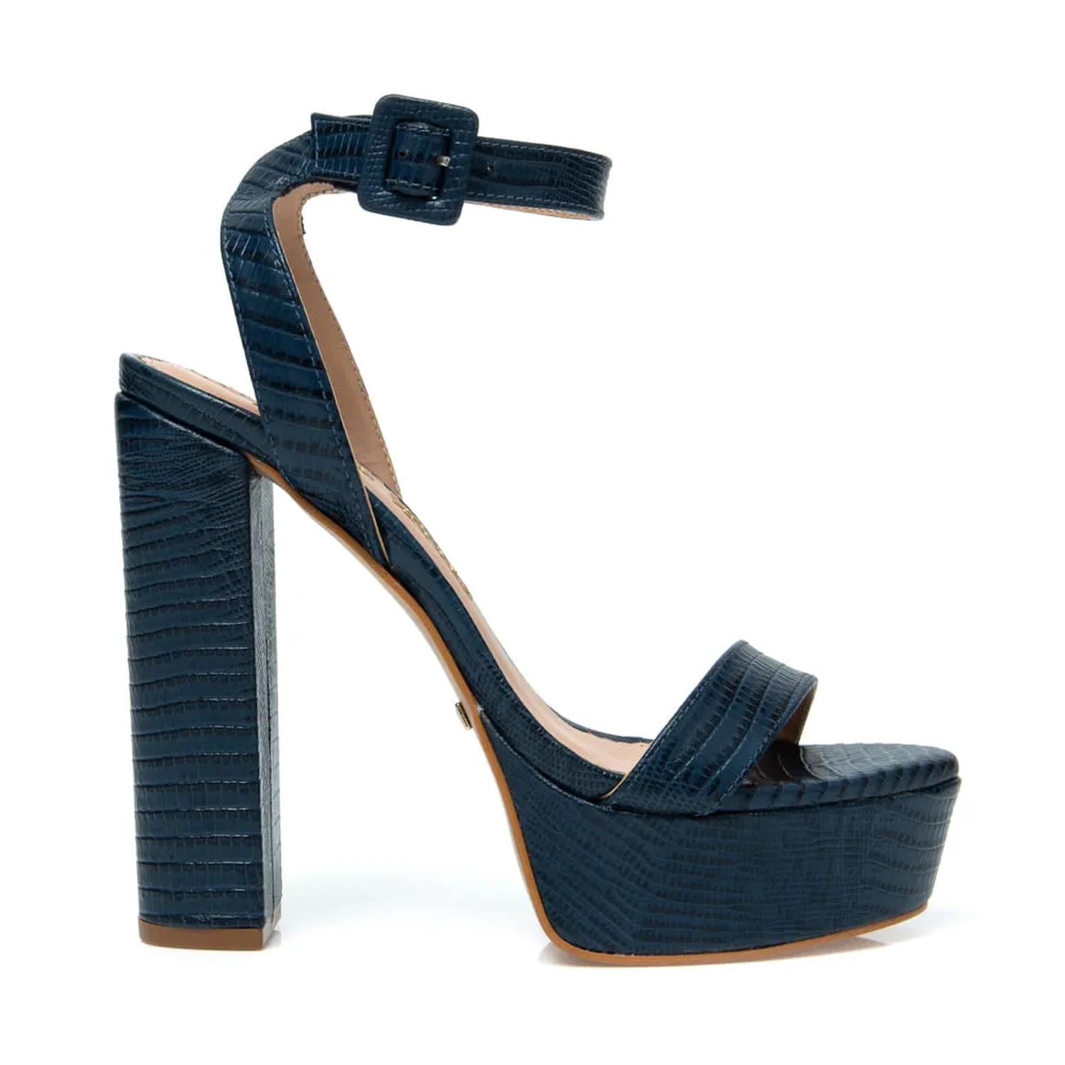 A Sandália Clarke é confeccionada em couro mini lezard. A modelagem é clássica, com salto meio pata. Possui uma tira no cabedal. Fechamento por tira com fivela encapada na lateral.