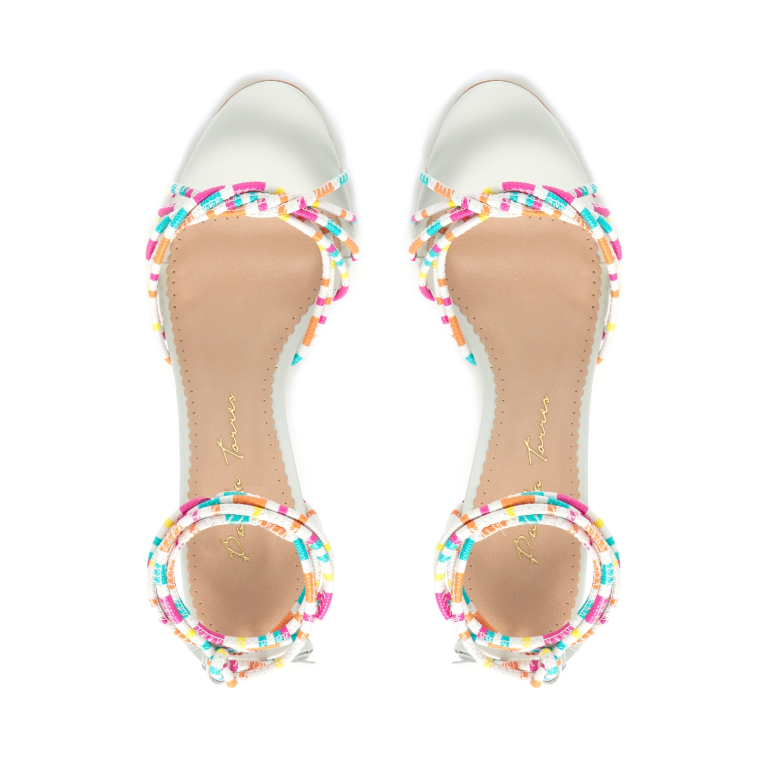 Sandália que promete ser a queridinha da coleção! com salto fino e tiras coloridas, possui charme de sobra e tira qualquer look do comum. combine com jeans ou com as pernas à mostra para valorizar cada parte da sandália que é rica em detalhes handmade.