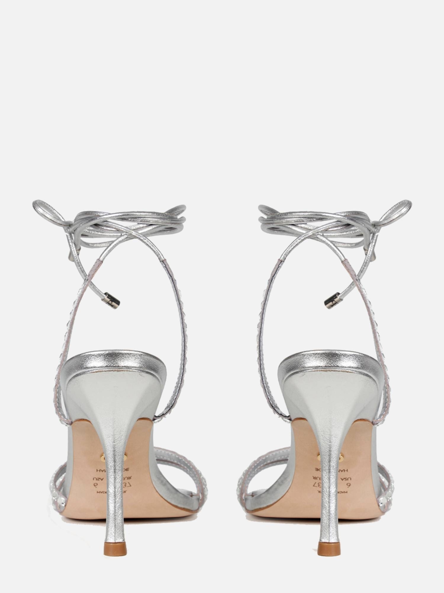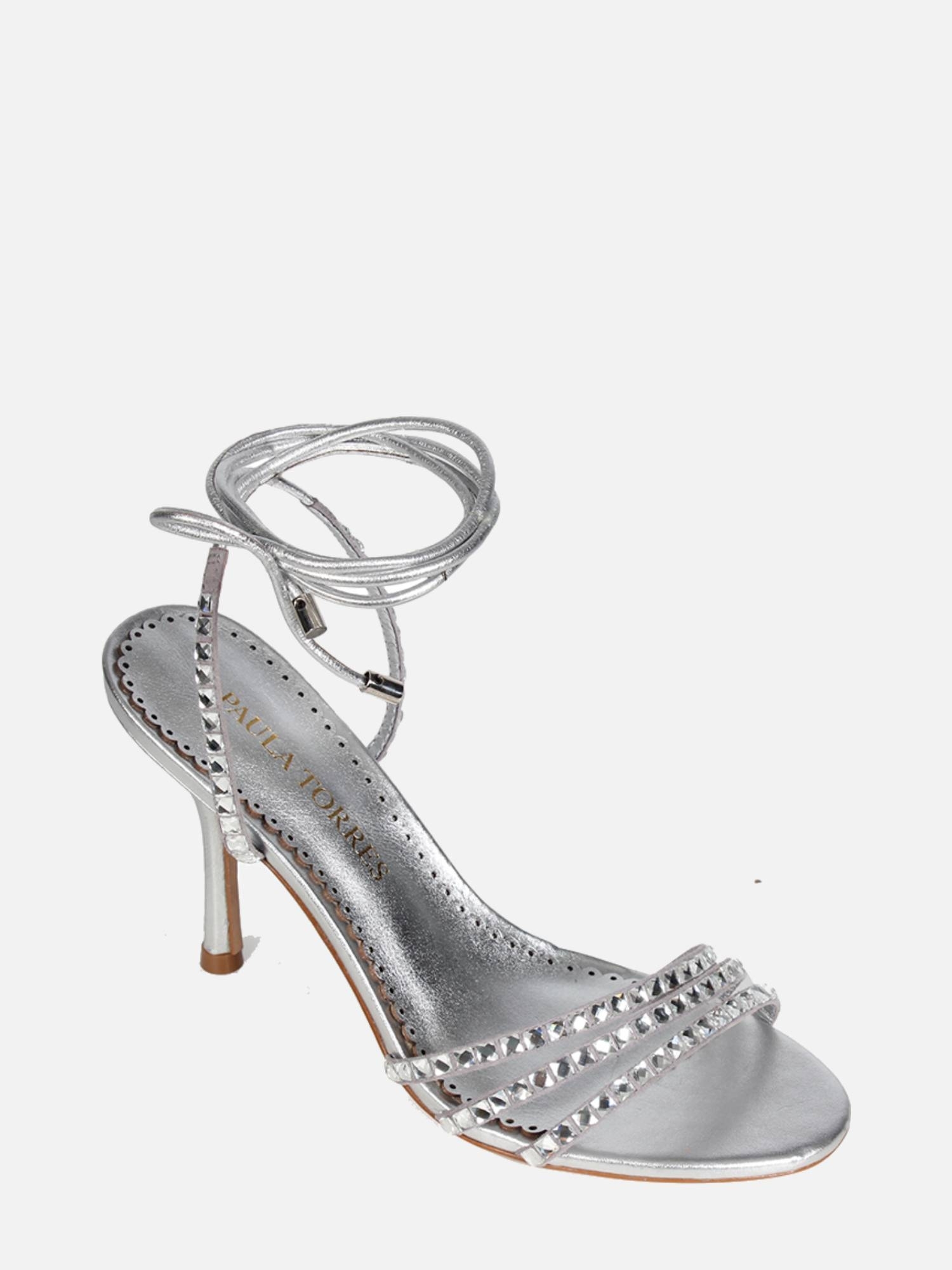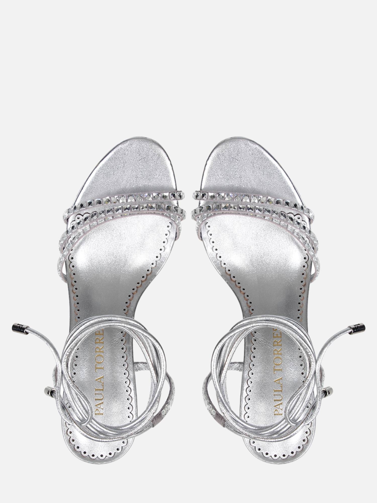A Sandália Cristal é confeccionada em couro. Modelagem em bico arredondado e salto alto agulha. O diferencial da peça são as aplicações de cristais na parte frontal e lateral do modelo, conferindo sofisticação e glamour de maneira delicada. O fechamento por amarração oferece charme com a finalização em ponteiras metalizadas carregando o monograma da Paula Torres.