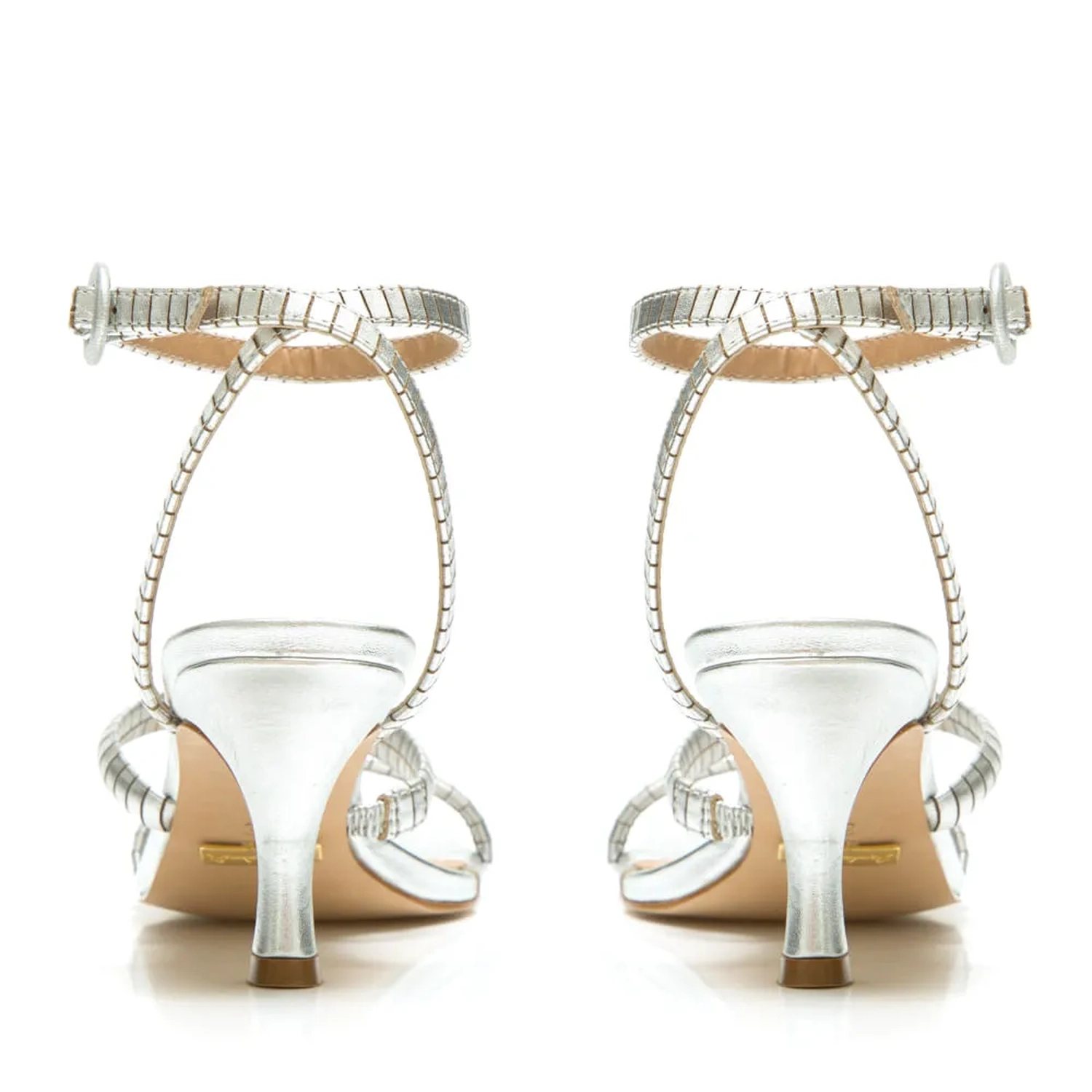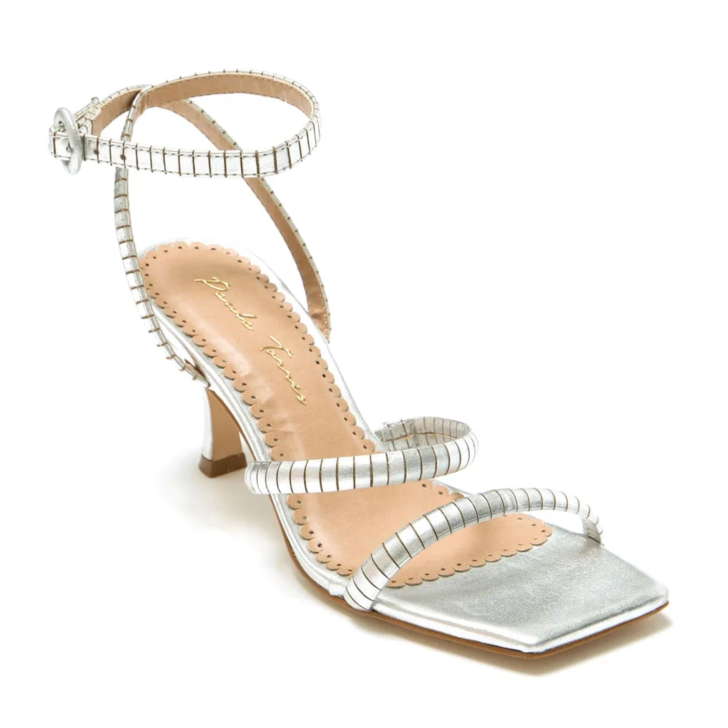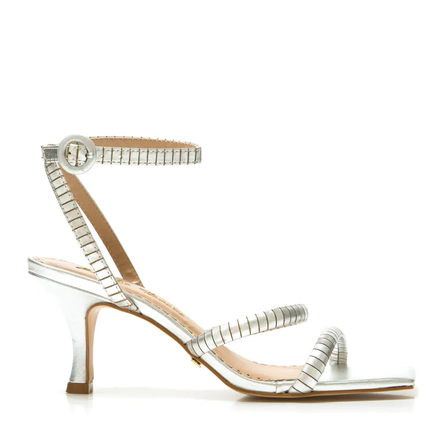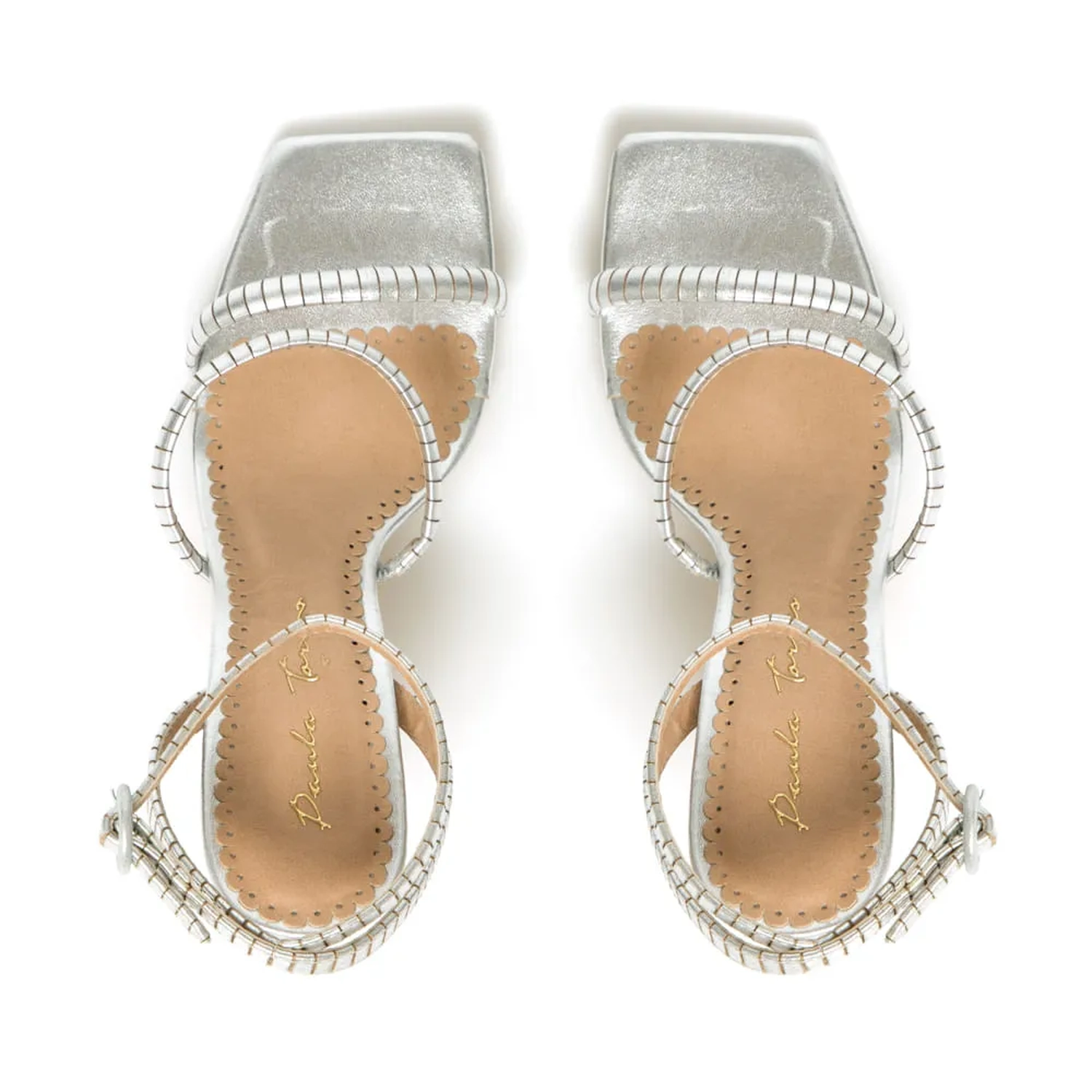 A Sandália Elis é confeccionada em couro. Sua modelagem em duas tiras ganha personalidade com tiras levemente acolchoadas com textura no couro, salto em formato carretel e fechamento por tira lateral com destaque para o cruzado no calcanhar.