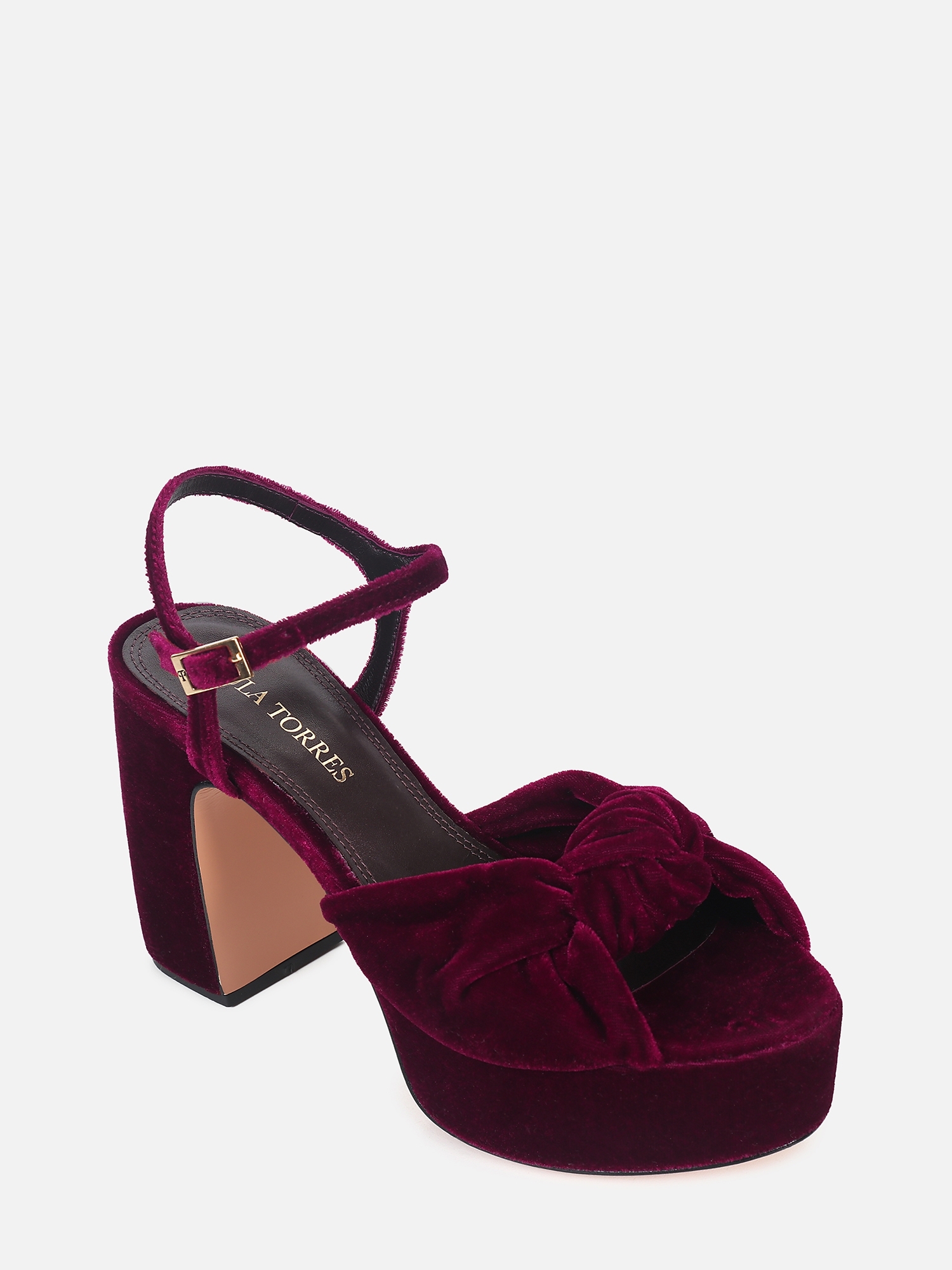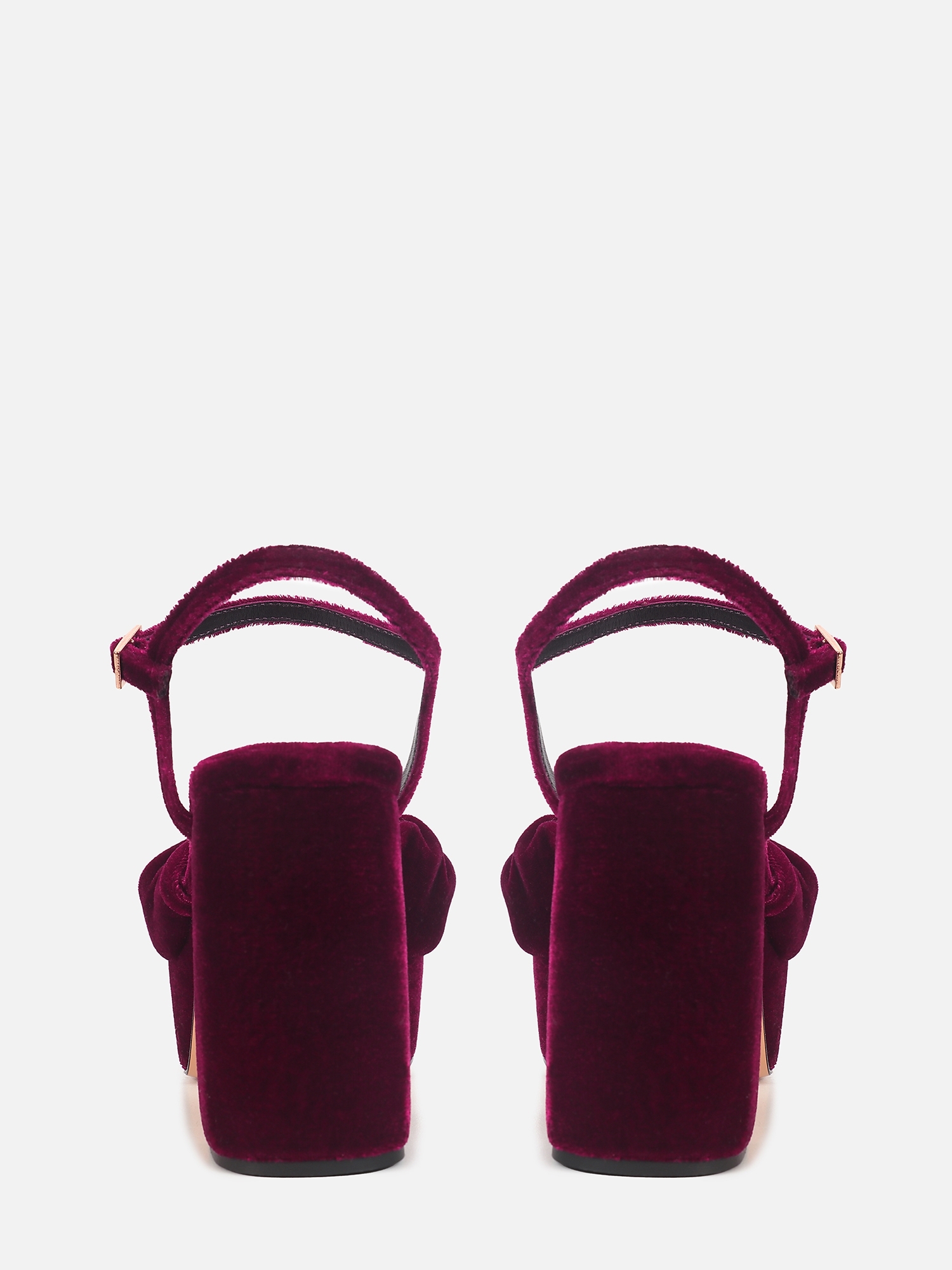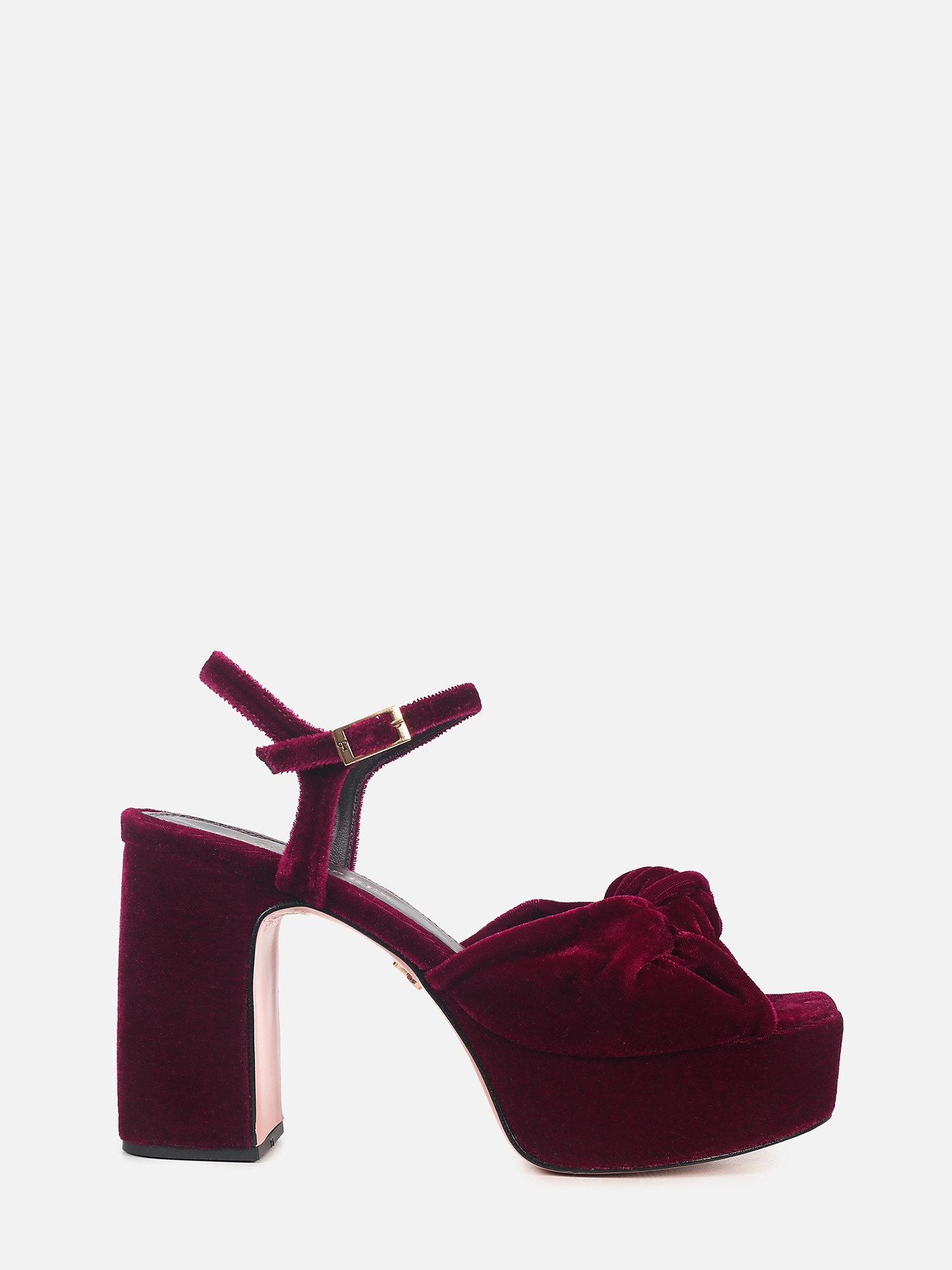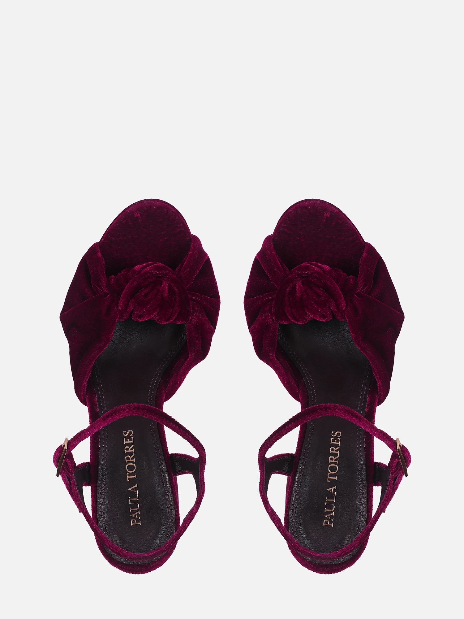 O fechamento por fivela ajustável permite melhor adaptação ao pé, enquanto o solado em couro garante durabilidade e um acabamento cuidadoso. A sandália de veludo vinho conta com salto de 9,5 cm e uma estrutura pensada para equilibrar altura e conforto.