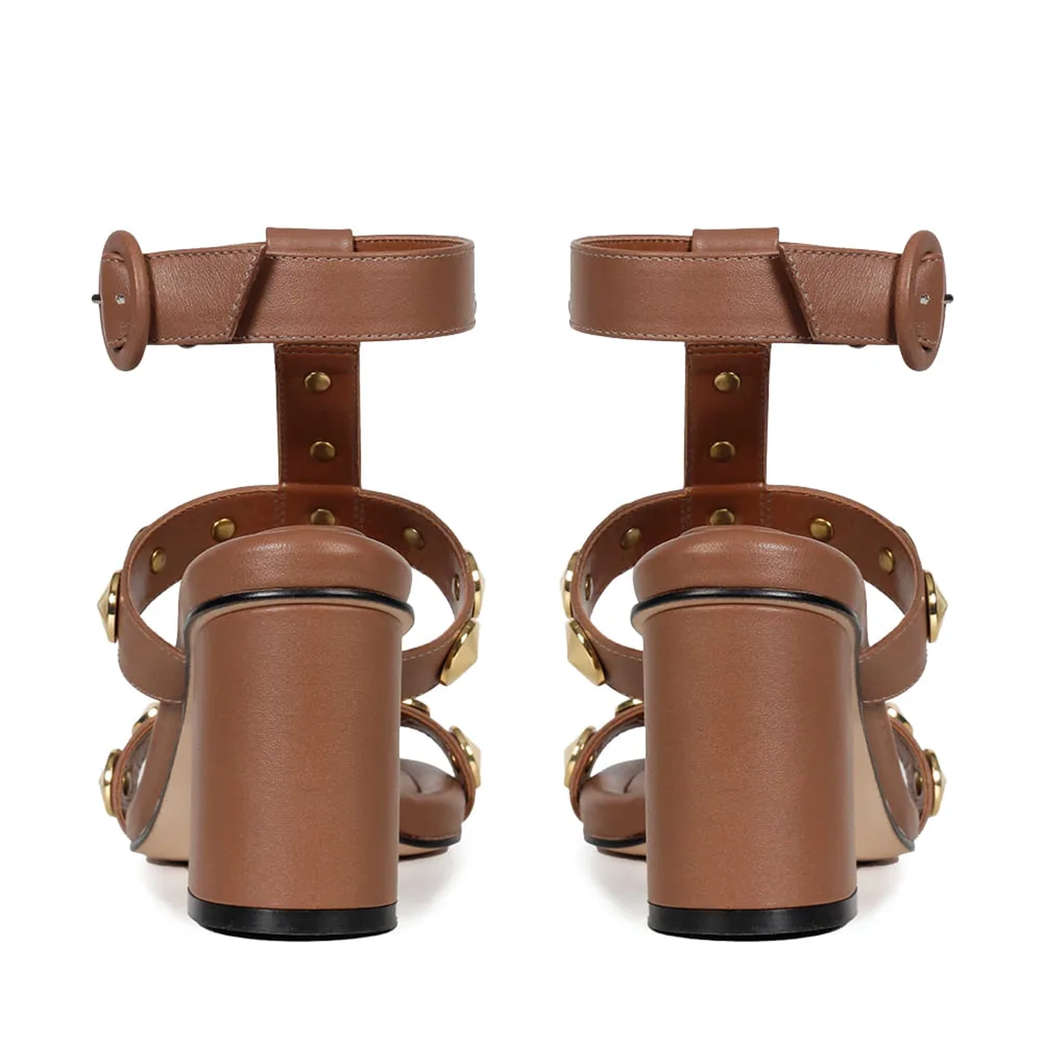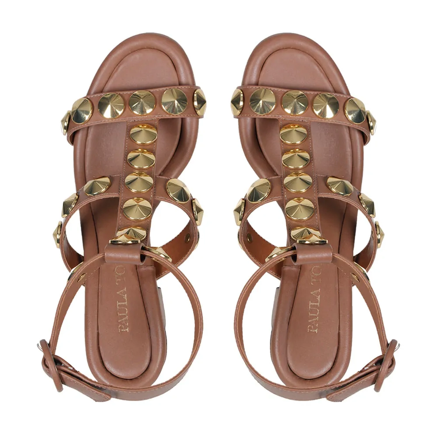 A Sandália Georgia é confeccionada em couro. Modelagem em bico arredondado e salto alto bloco. O destaque do modelo são as aplicações em metal sobre o cabedal, conferindo um estilo mais despojado ao calce, de maneira sofisticada, totalmente Paula Torres.
