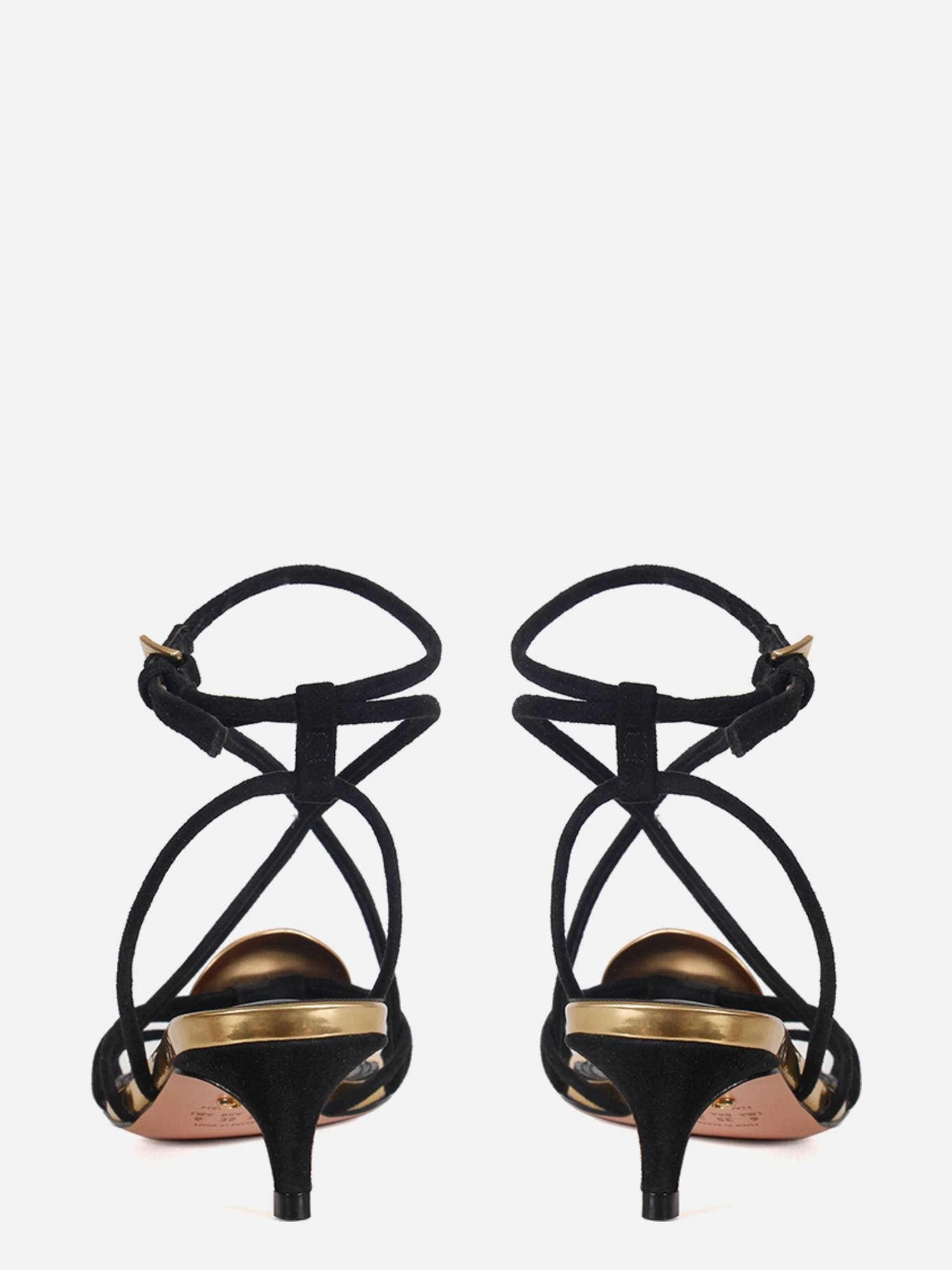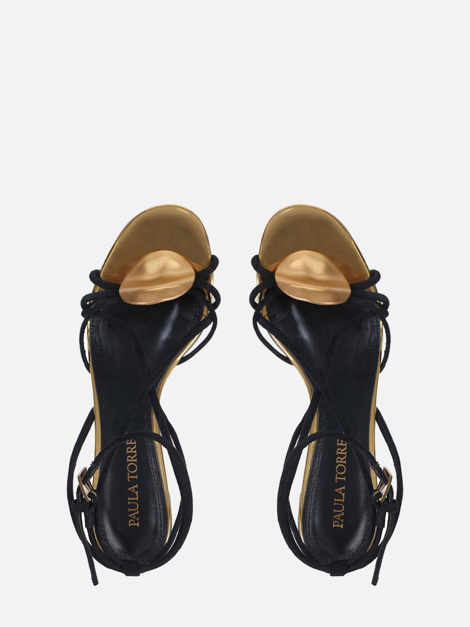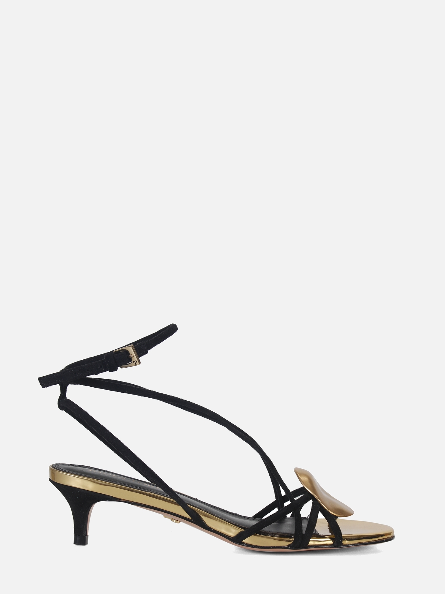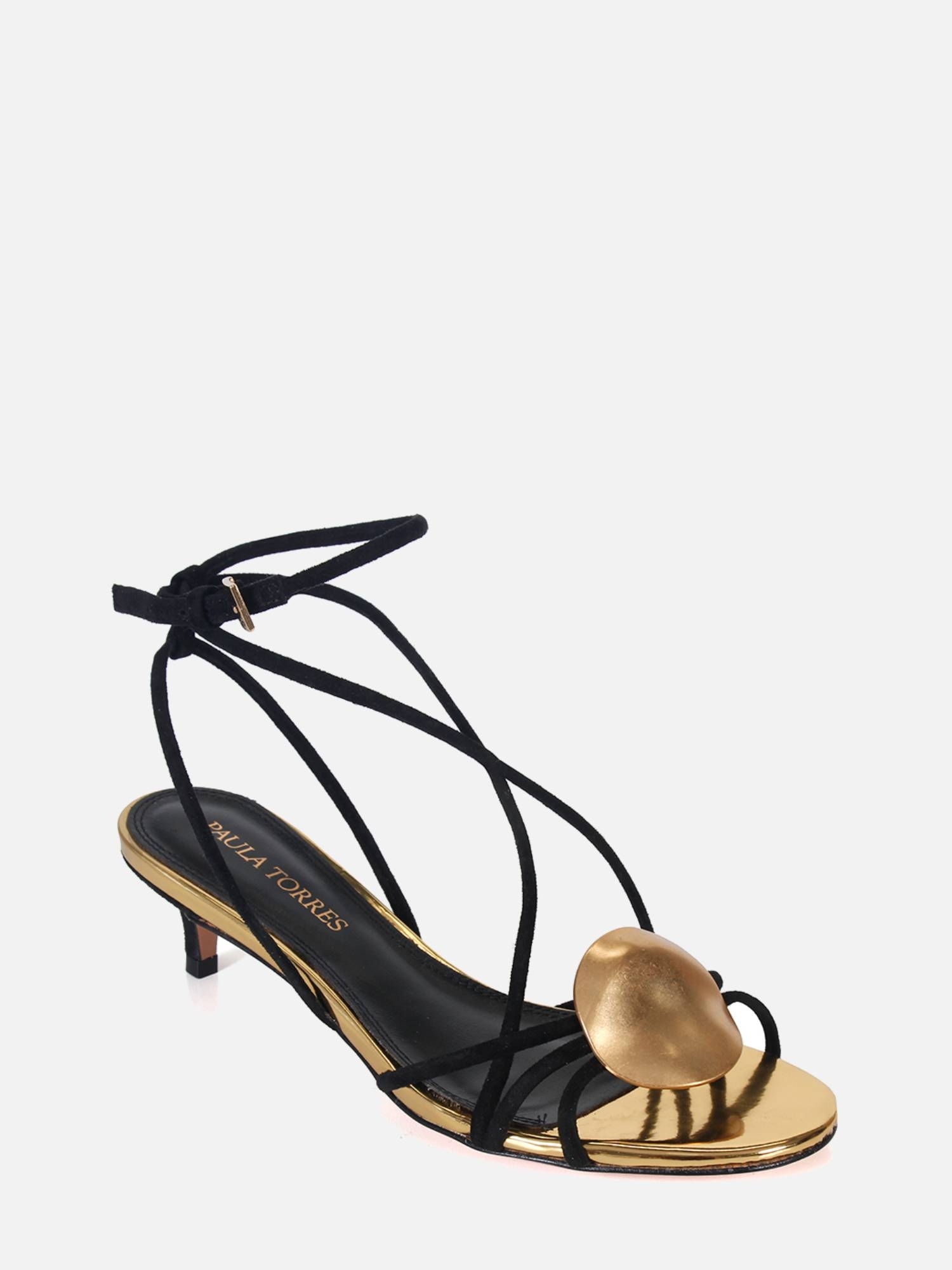 A Sandália Helo é confeccionada em camurça. O modelo de salto kitten heel apresenta tiras finas sobre o cabedal, adornadas por uma peça orgânica com banho dourado fosco, adicionando um toque elegante. A palmilha, revestida em material specchio dourado, realça o brilho sutil da peça, enquanto o solado em couro garante durabilidade e conforto. O fechamento por fivela lateral proporciona ajuste seguro e charmoso.