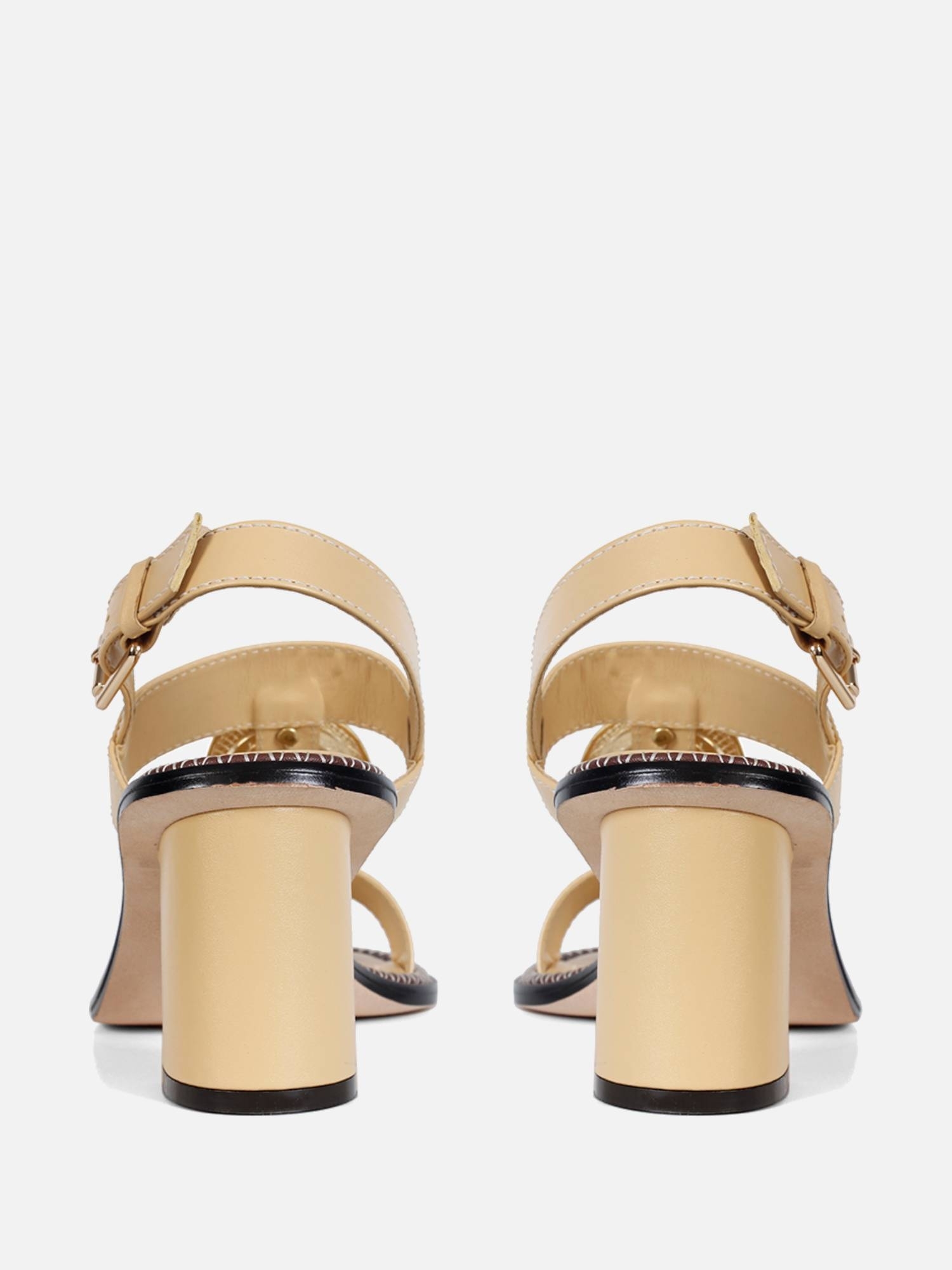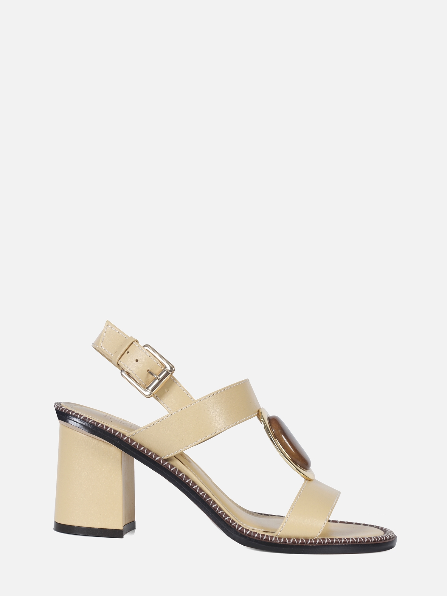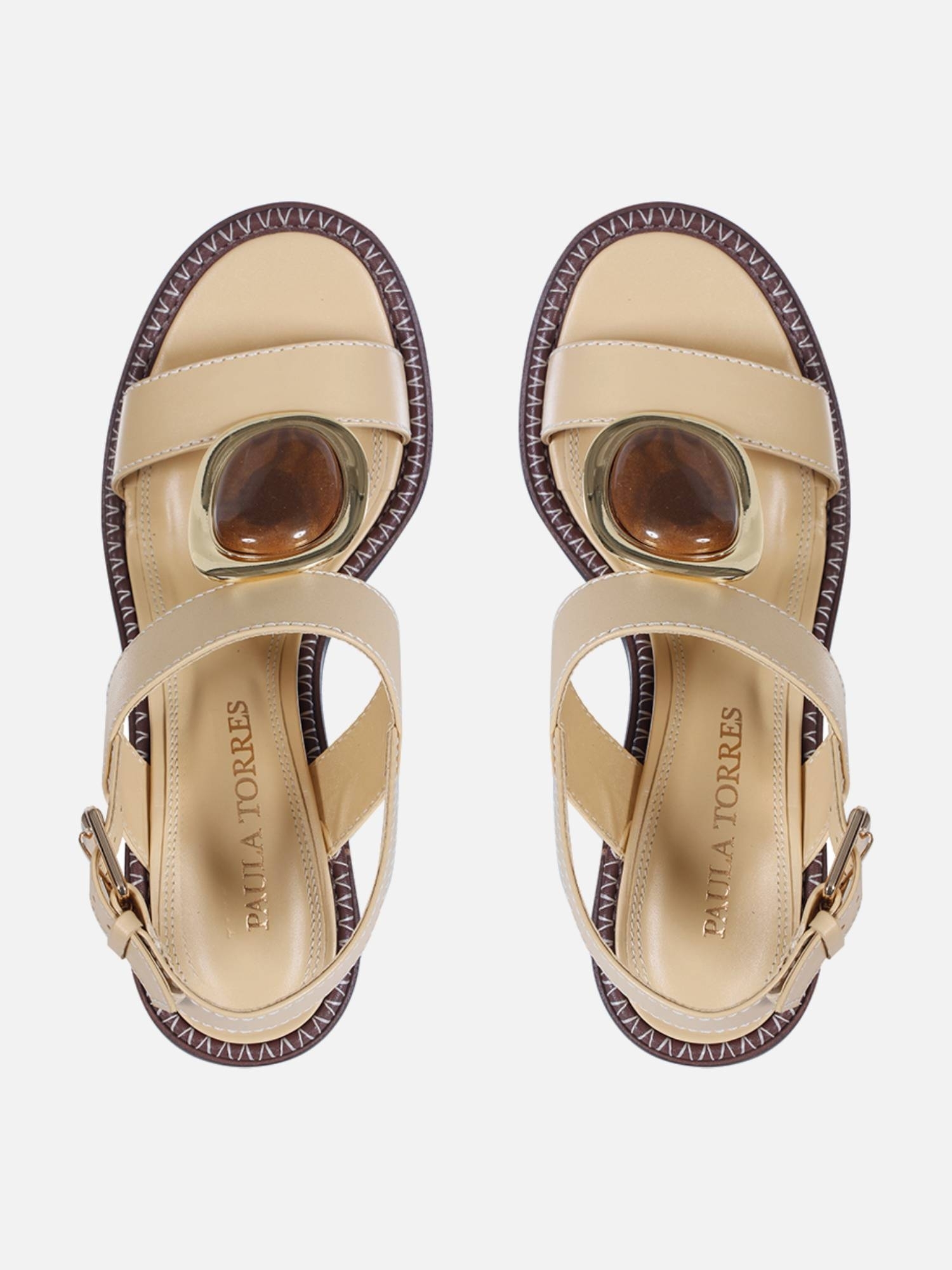 A Sandália Joana é produzida em couro. Seu design é composto por duas tiras largas na parte de cima com a aplicação de uma pedra resinada em formato orgânico sobre metal de banho dourado. Tira no calcanhar com fivela lateral para ajuste e salto médio bloco. Vira forrada com pesponto contrastante e solado em couro proporcionando durabilidade e sofisticação ao sapato.