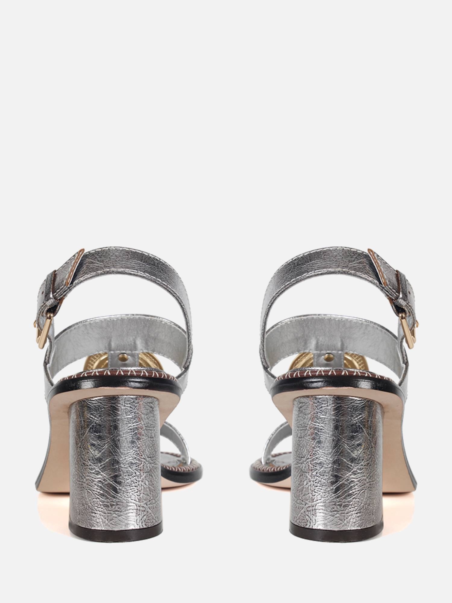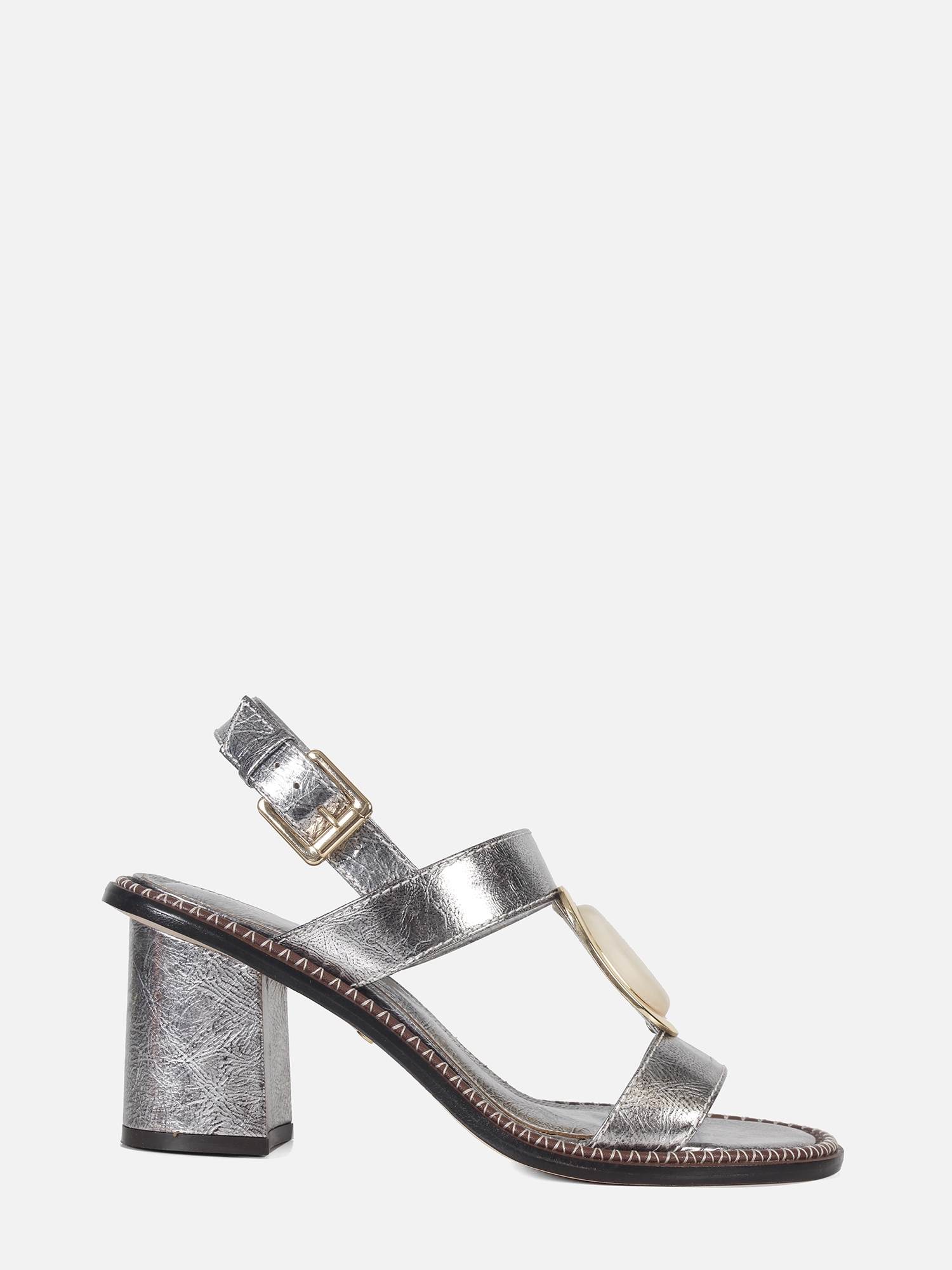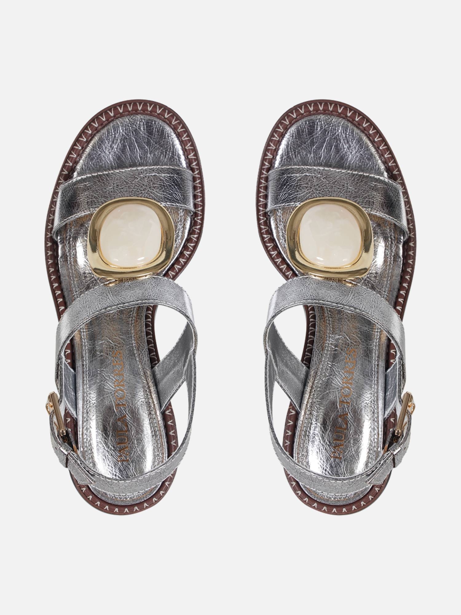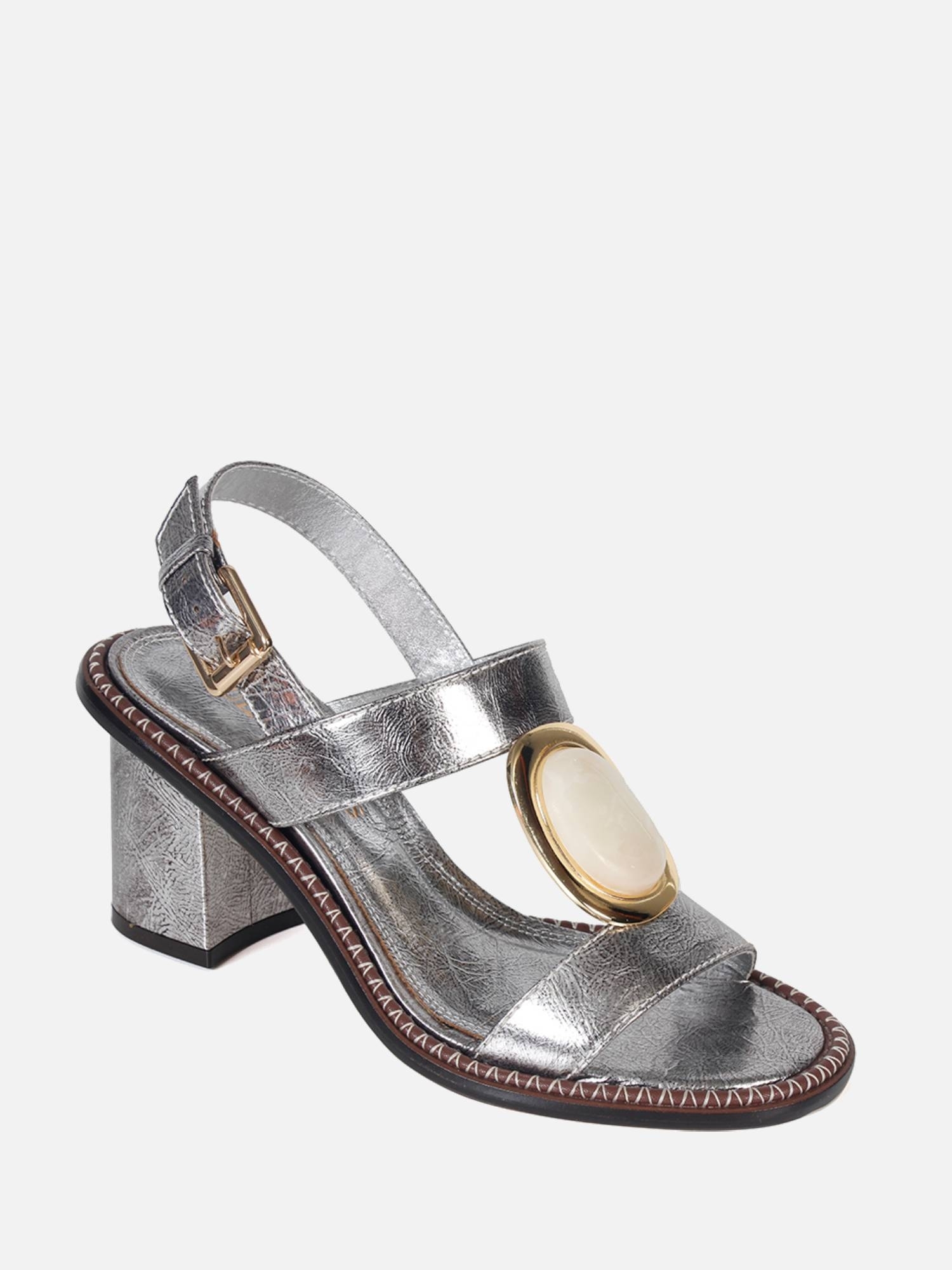 A Sandália Joana é produzida em couro. Seu design é composto por duas tiras largas na parte de cima com a aplicação de uma pedra resinada em formato orgânico sobre metal de banho dourado. Tira no calcanhar com fivela lateral para ajuste e salto médio bloco. Vira forrada com pesponto contrastante e solado em couro proporcionando durabilidade e sofisticação ao sapato.