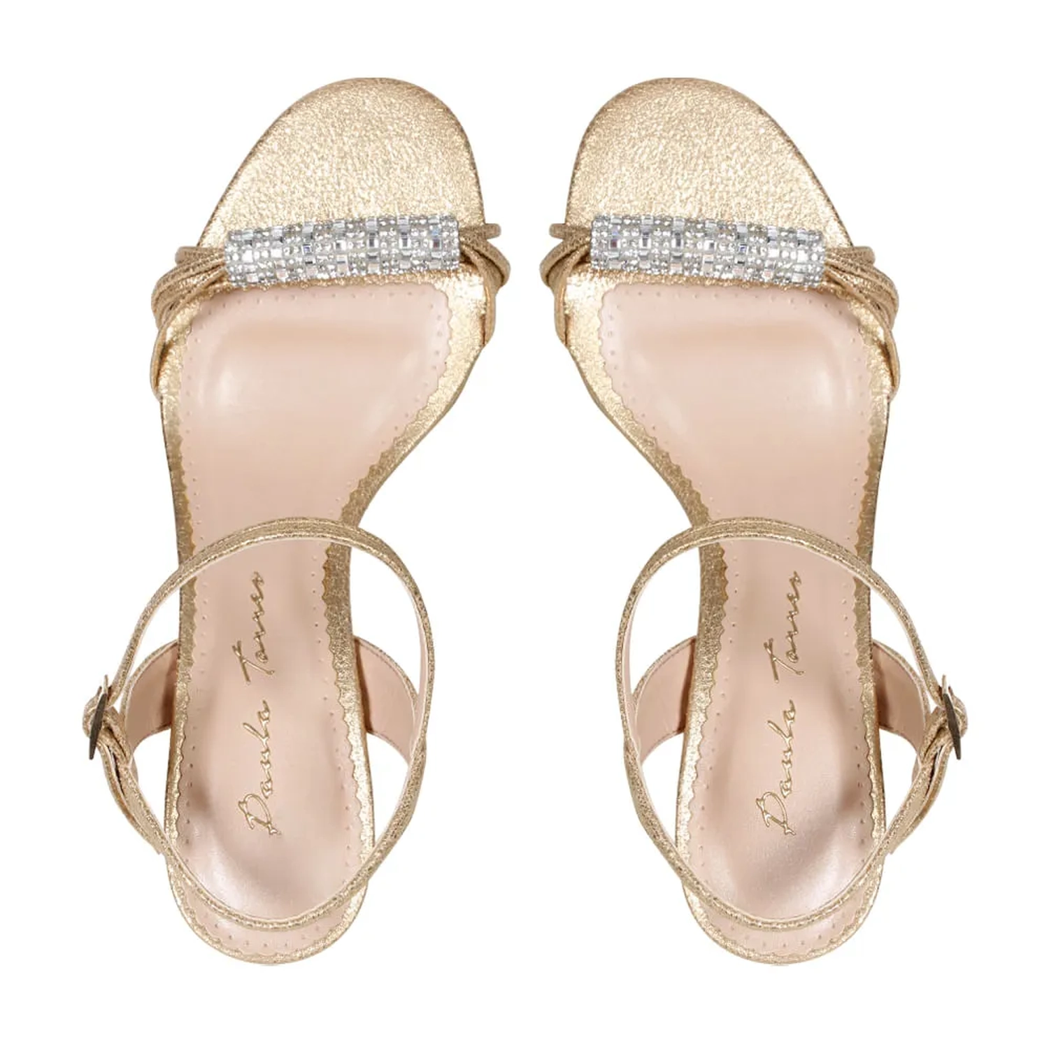 A Sandália Kiara é confeccionada em couro. De modelagem clássica com finas tiras encapadas em couro e salto bloco. O diferencial da peça é o detalhe em pedraria que passa pelas tiras do cabedal, harmonizando com a cor metalizada do modelo. O fechamento transpassado por fivela destaca glamour e elegância.