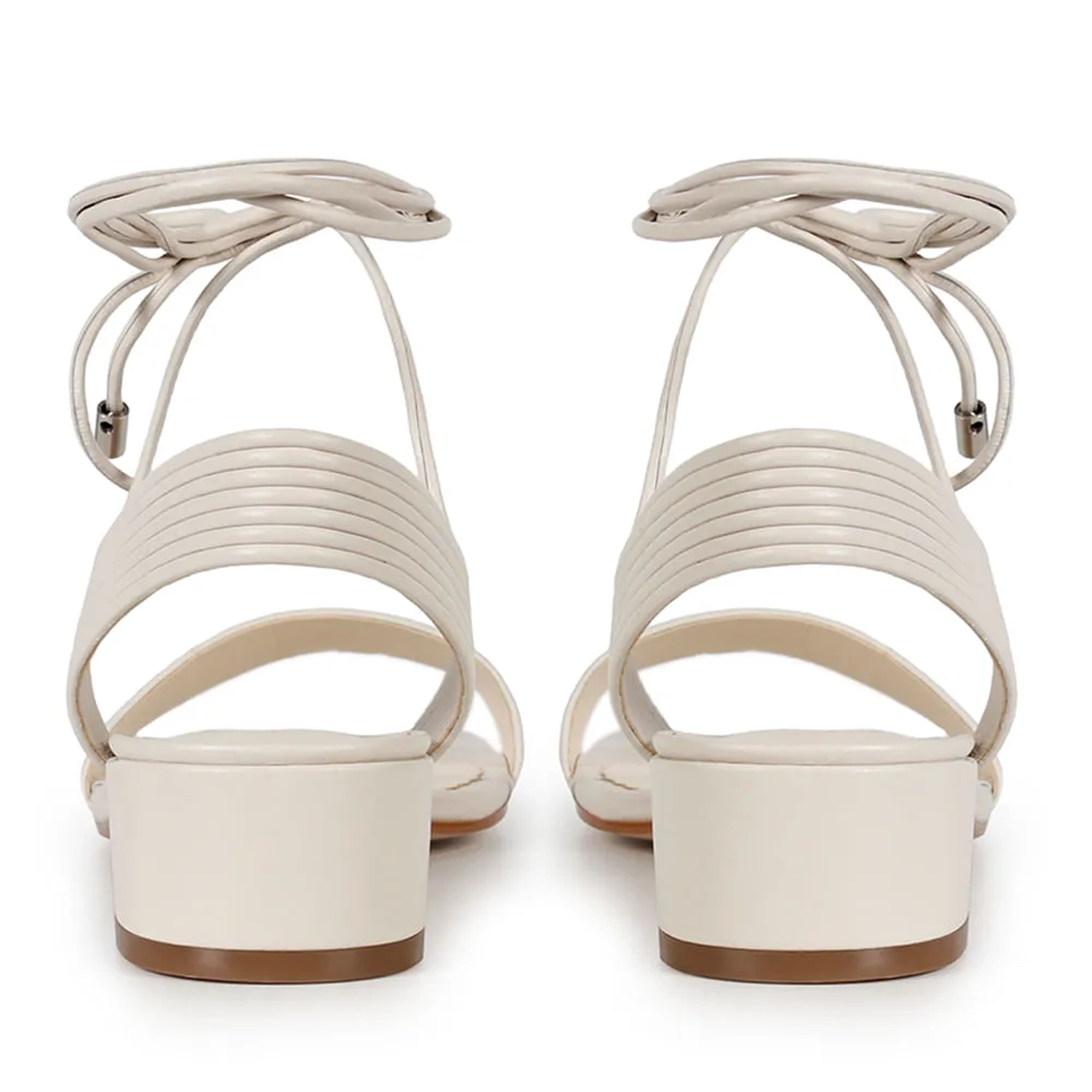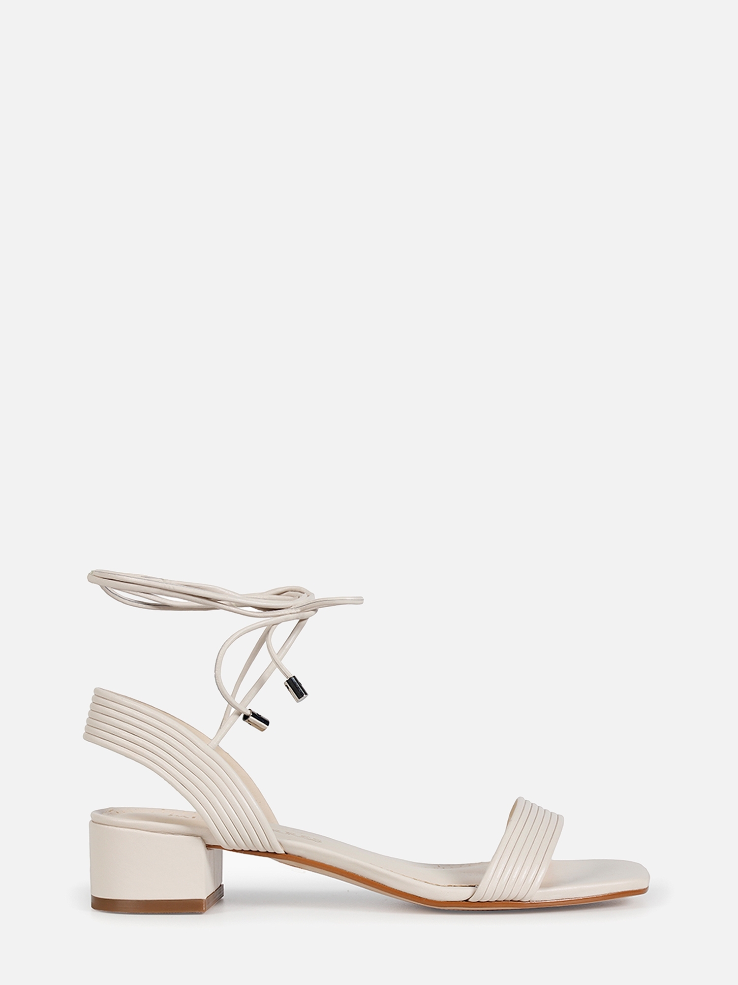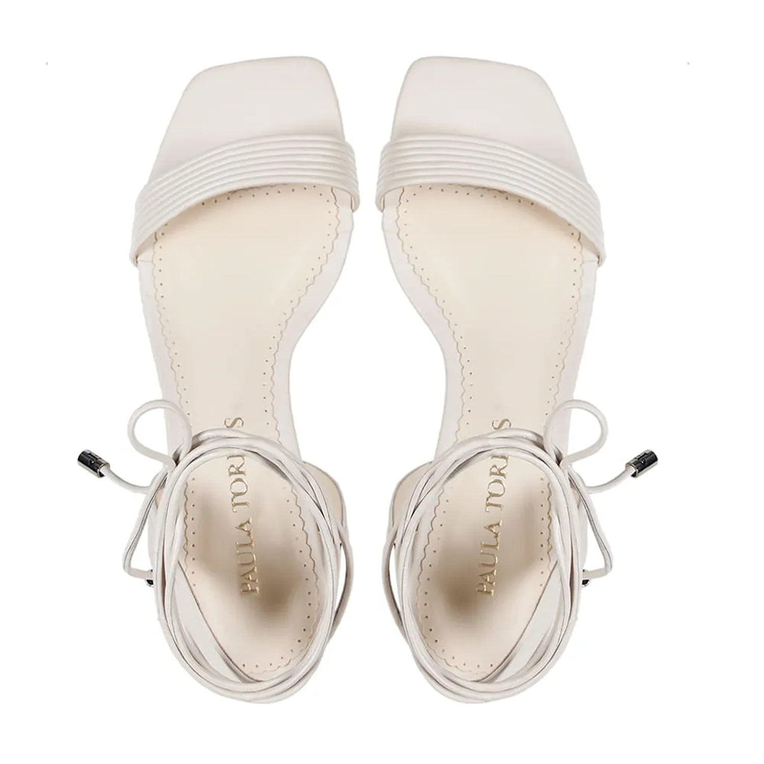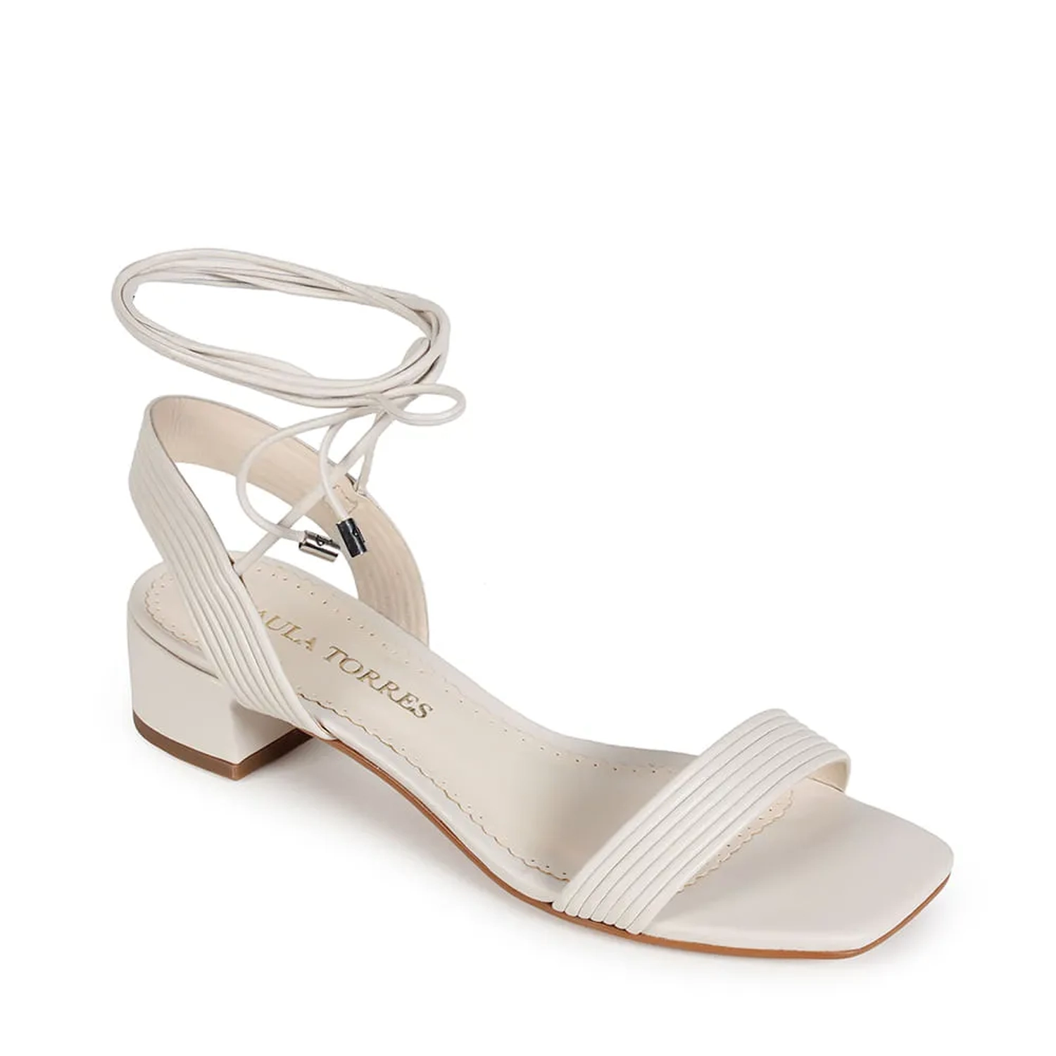 A Sandália Kim é confeccionada em couro. Modelagem em bico quadrado e salto baixo bloco. Construção clássica, conta com cabedal em couro canelado e fechamento por amarração, finalizada por ponteiras metalizadas com o monograma Paula Torres, conferindo charme à peça.