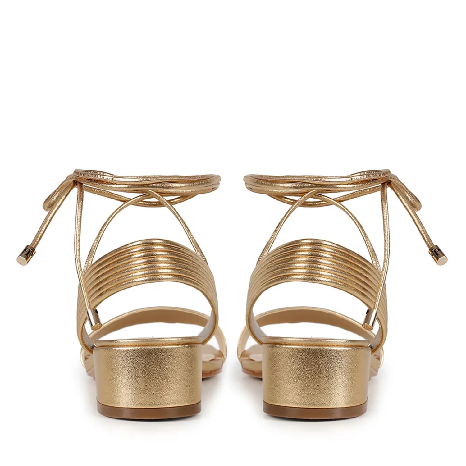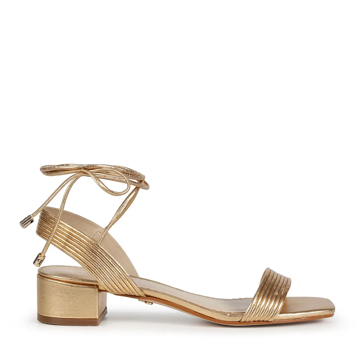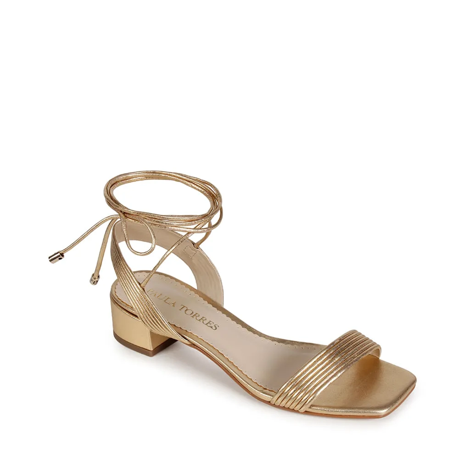 A Sandália Kim é confeccionada em couro. Modelagem em bico quadrado e salto baixo bloco. Construção clássica, conta com cabedal em couro canelado e fechamento por amarração, finalizada por ponteiras metalizadas com o monograma Paula Torres, conferindo charme à peça.