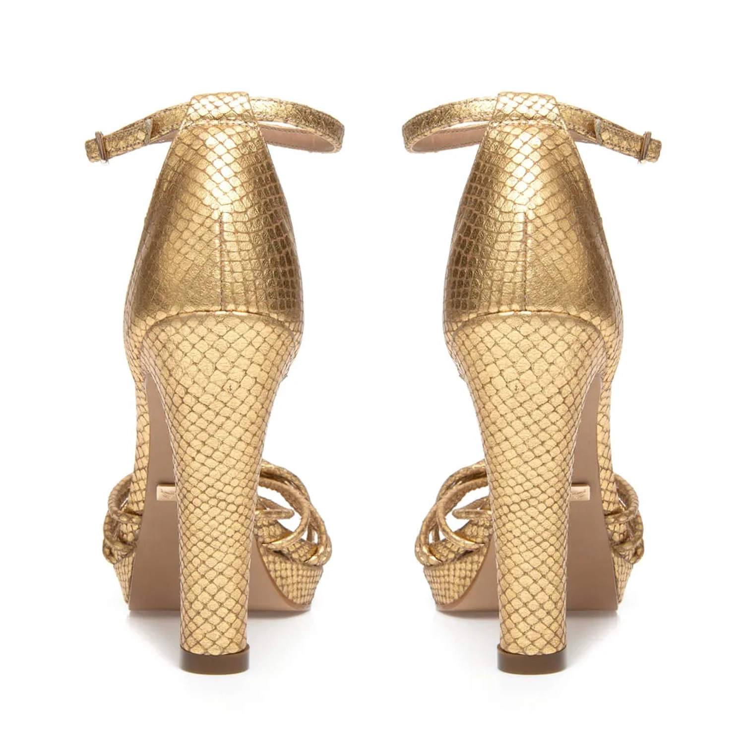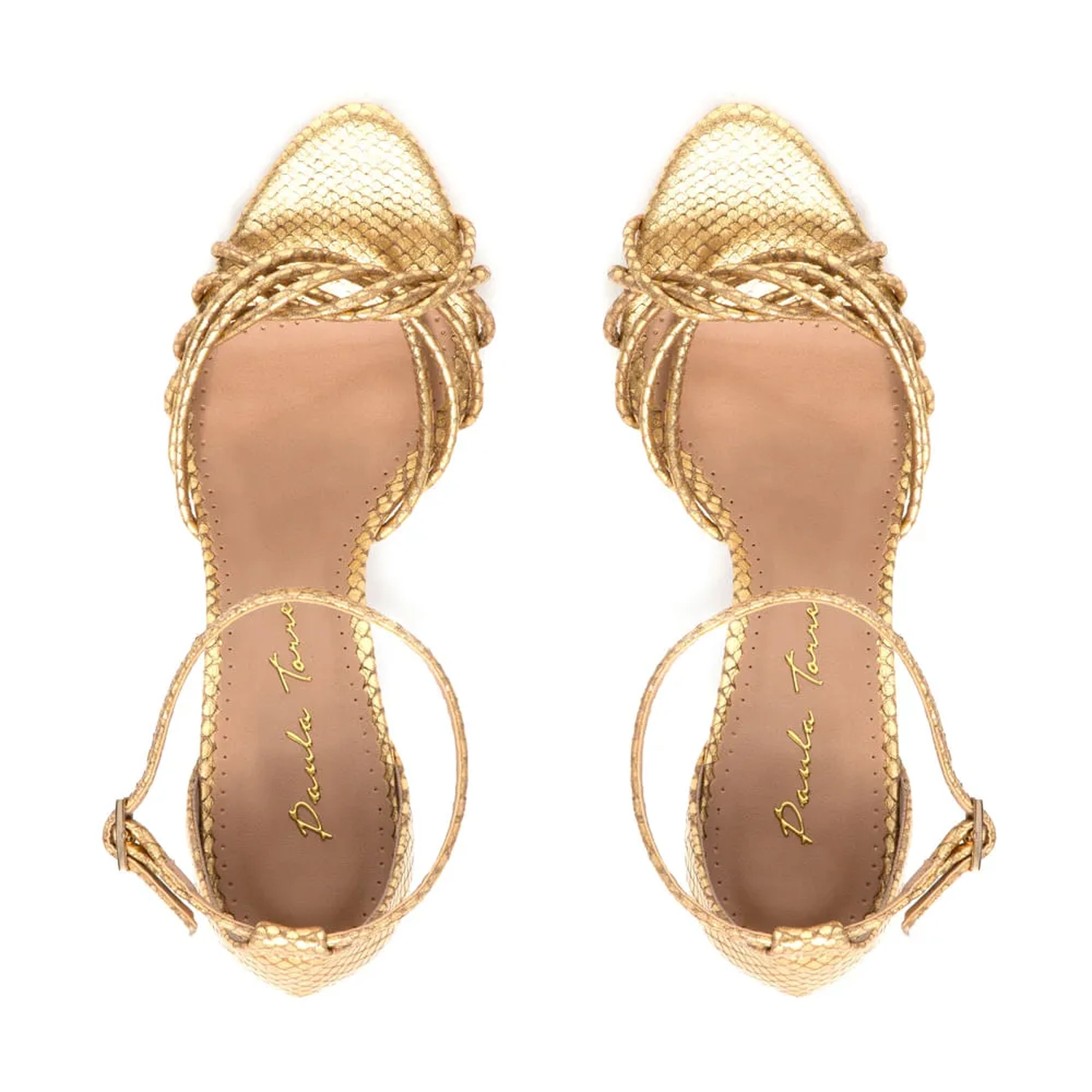 A Sandália Lady é confeccionada em couro mini lezard metalizado. Modelagem clássica, salto meia pata e fechamento lateral por fivela. O cabedal é formado por seis tiras finas de couro, entrelassadas de maneira sofisticada.