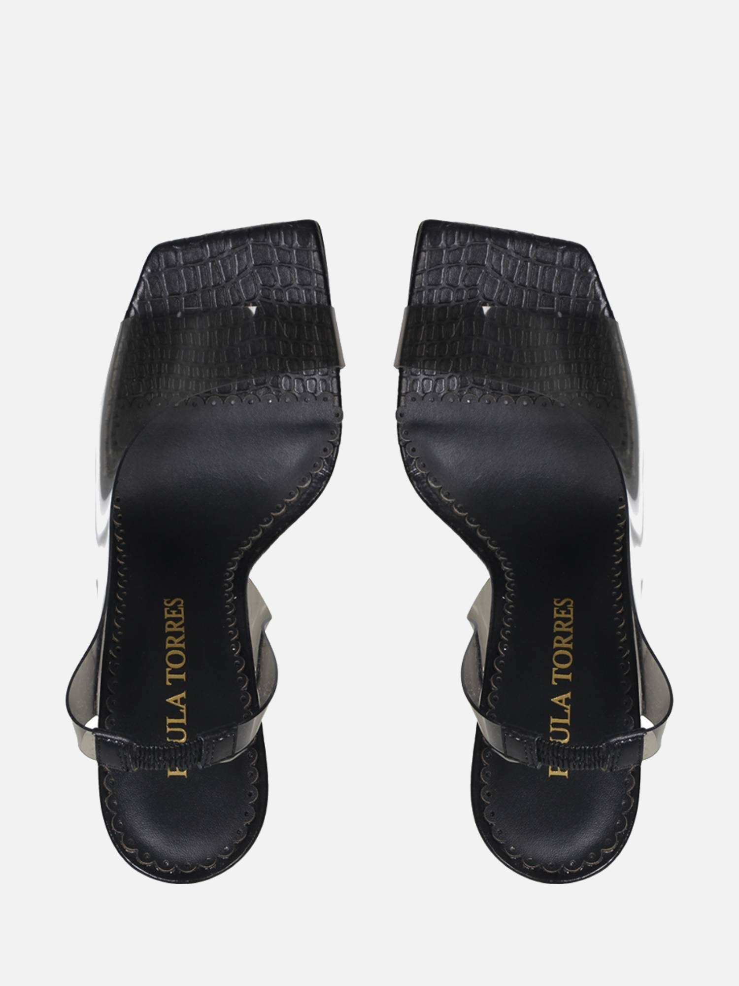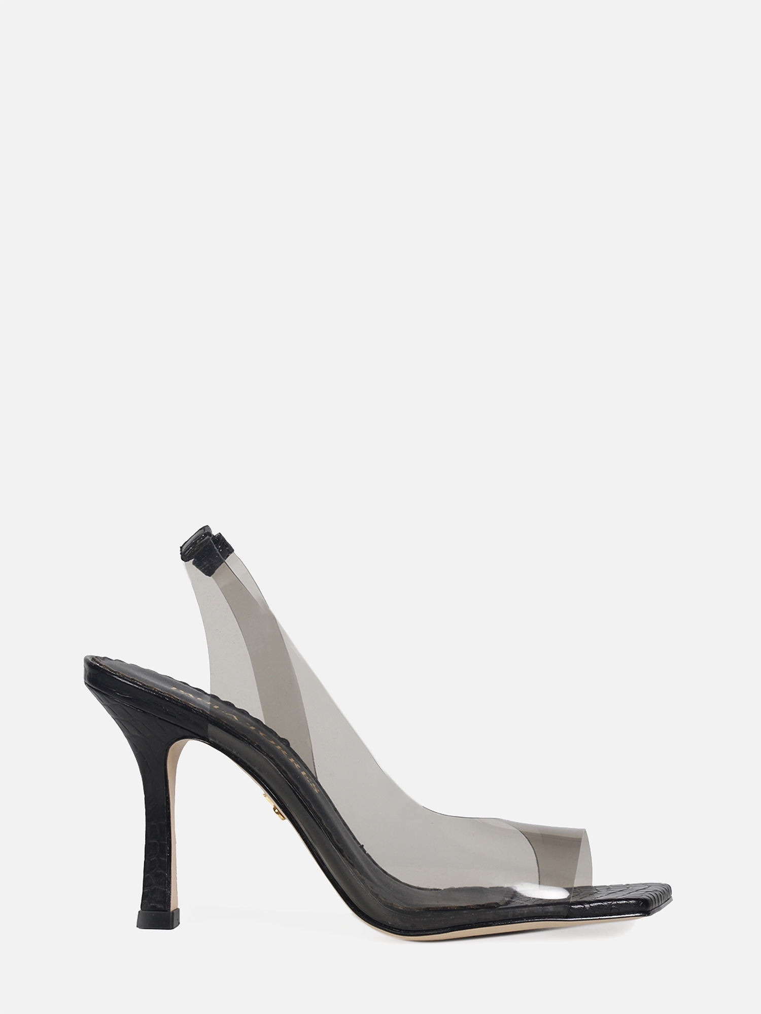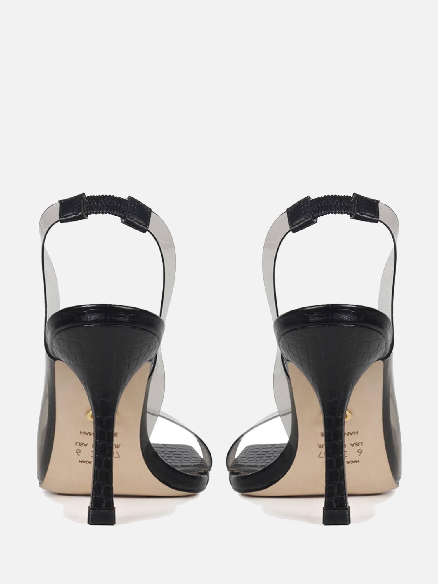A Sandália Lauren é confeccionada em couro. Modelagem em bico quadrado e salto alto taça. Design assimétrico contrastando com a transparência do vinil e a estampa do couro. O diferencial da peça é a estética contemporânea criada pelo vinil, que cobre o cabedal de maneira contínua, envolvendo o calcanhar e fluindo unilateralmente até a parte frontal. A variação na cor preto confere elegância ao modelo.