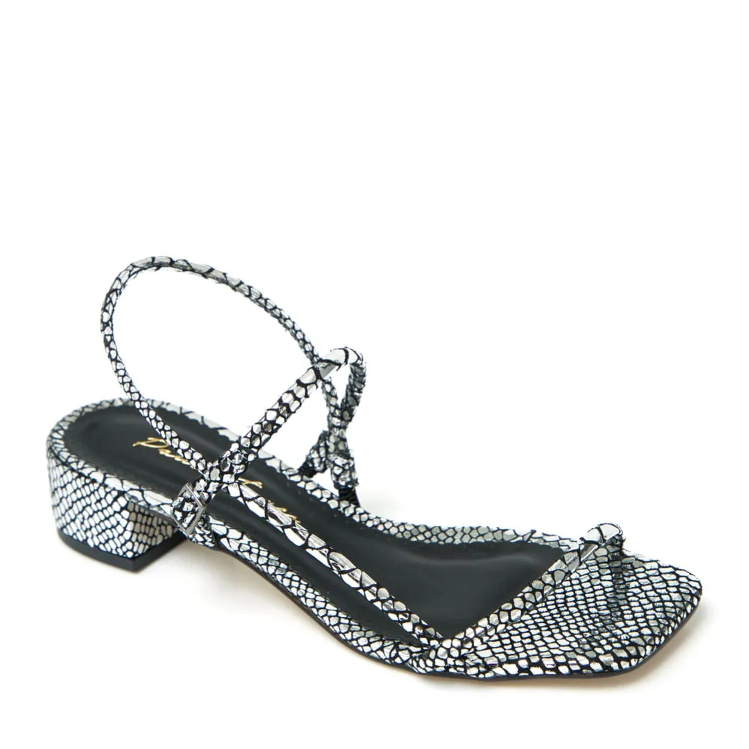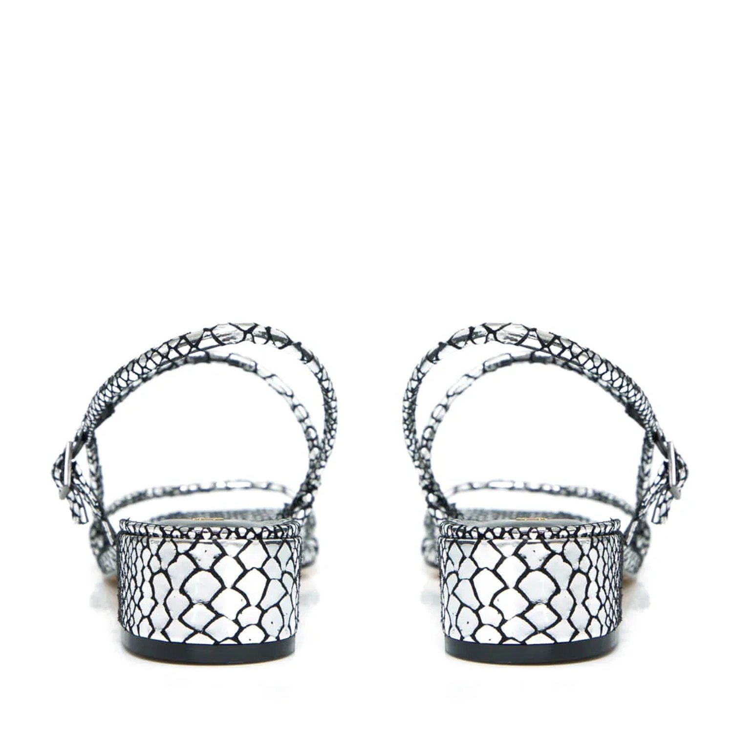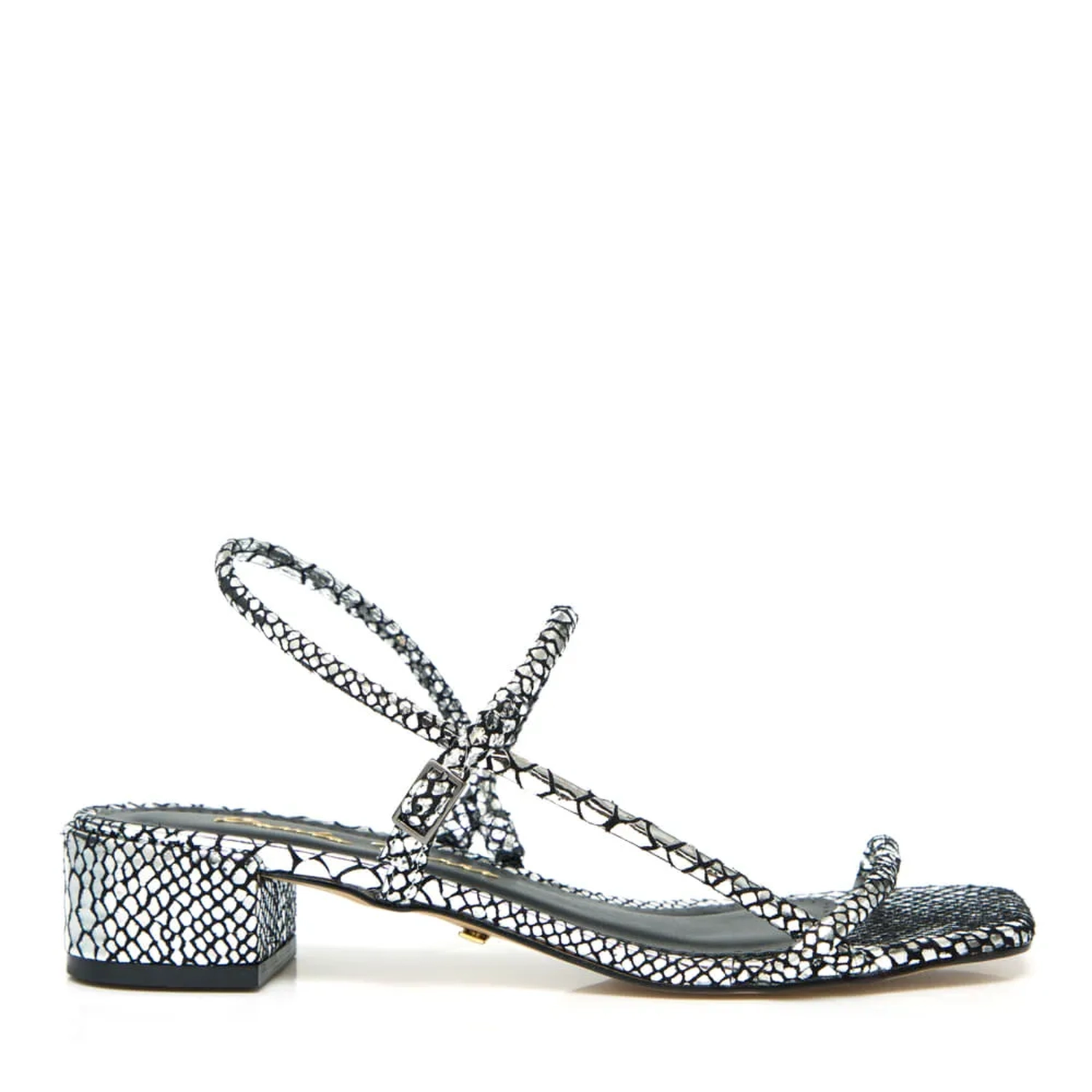 A Sandália Leticia é produzida com couro snake metalizado. Tira frontal fina, levemente acolchoada e fechamento por fivela lateral ajustavel. O salto baixo e grosso é perfeito para uma produção antenada. Cor: Prata