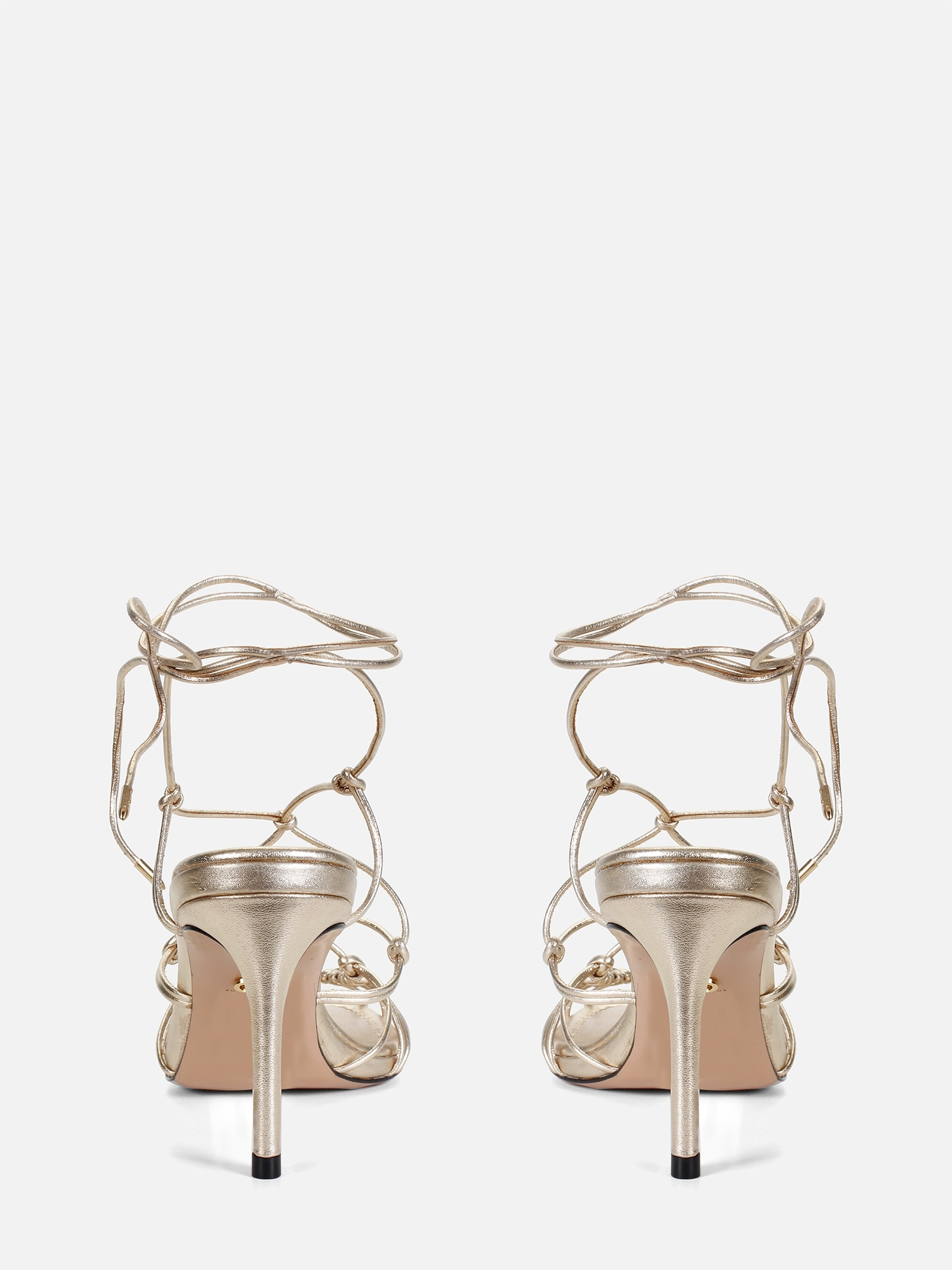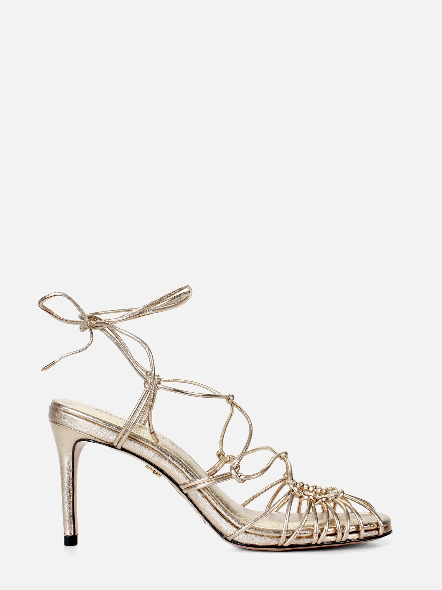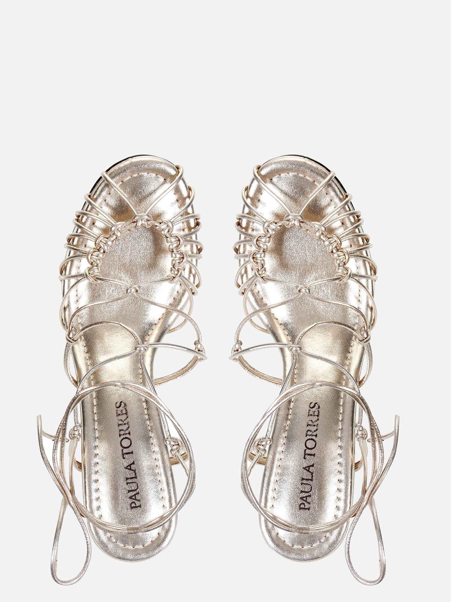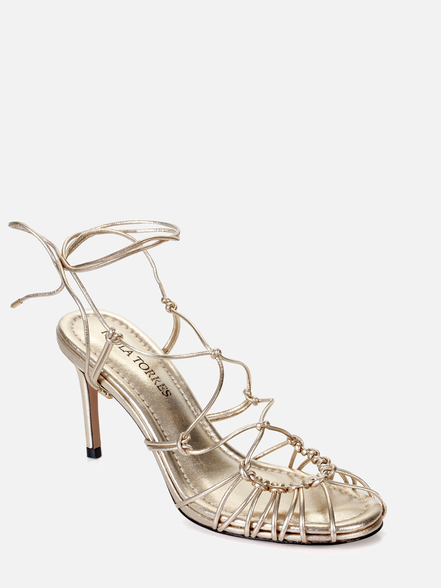 A Sandália Lily Saturno é puro requinte. Confeccionada em couro metalizado dourado, apresenta tiras finas entrelaçadas que valorizam o pé com delicadeza e modernidade. O fechamento por amarração no tornozelo oferece um ajuste personalizado e adiciona um toque de feminilidade ao visual.