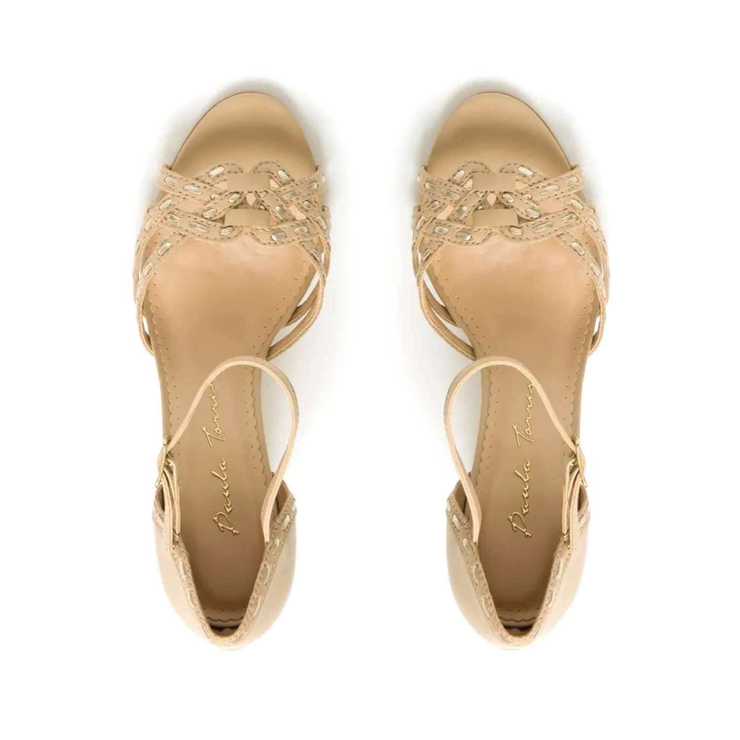 A Sandália Lima é produzida em couro. O modelo é feito com tiras finas entrelaçadas com pesponto em couro metalizado. Calcanheira fechada e o fechamento é feito por fivela lateral e salto alto grosso.