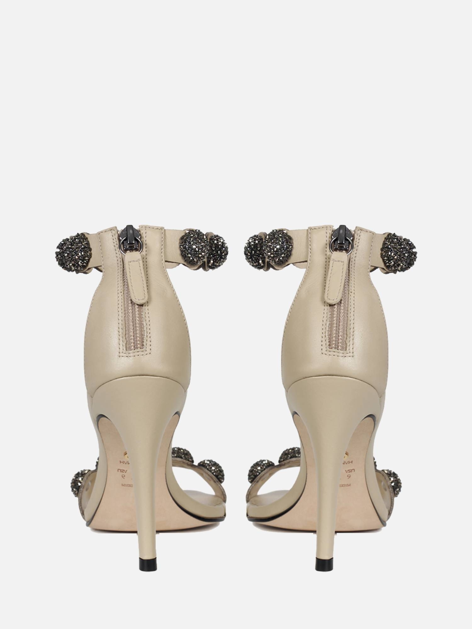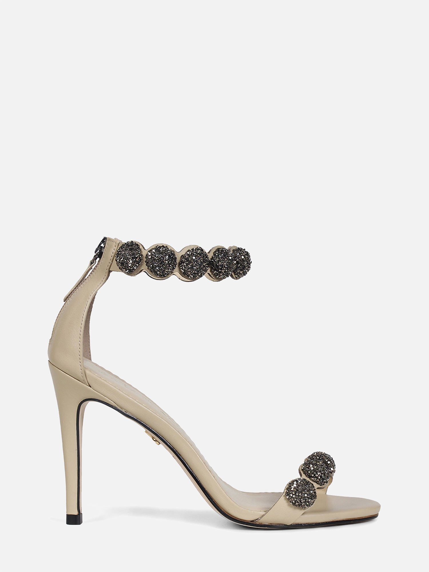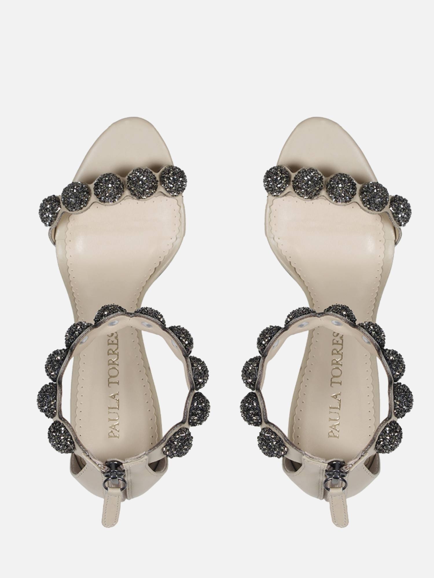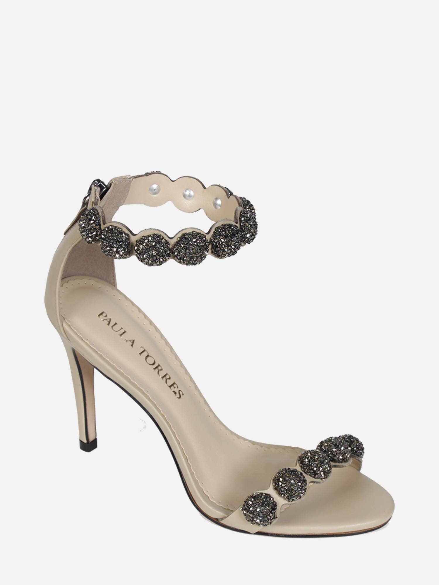 A Sandália Lorena é confeccionada em couro. Modelagem em bico arredondado e salto alto agulha. O diferencial são as tiras na parte frontal e no tornozelo, compostas por círculos com cristais embutidos, conferindo glamour e estilo ao calce. O fechamento por zíper na parte do calcanhar dispõe charme e elegância à peça, totalmente Paula Torres.