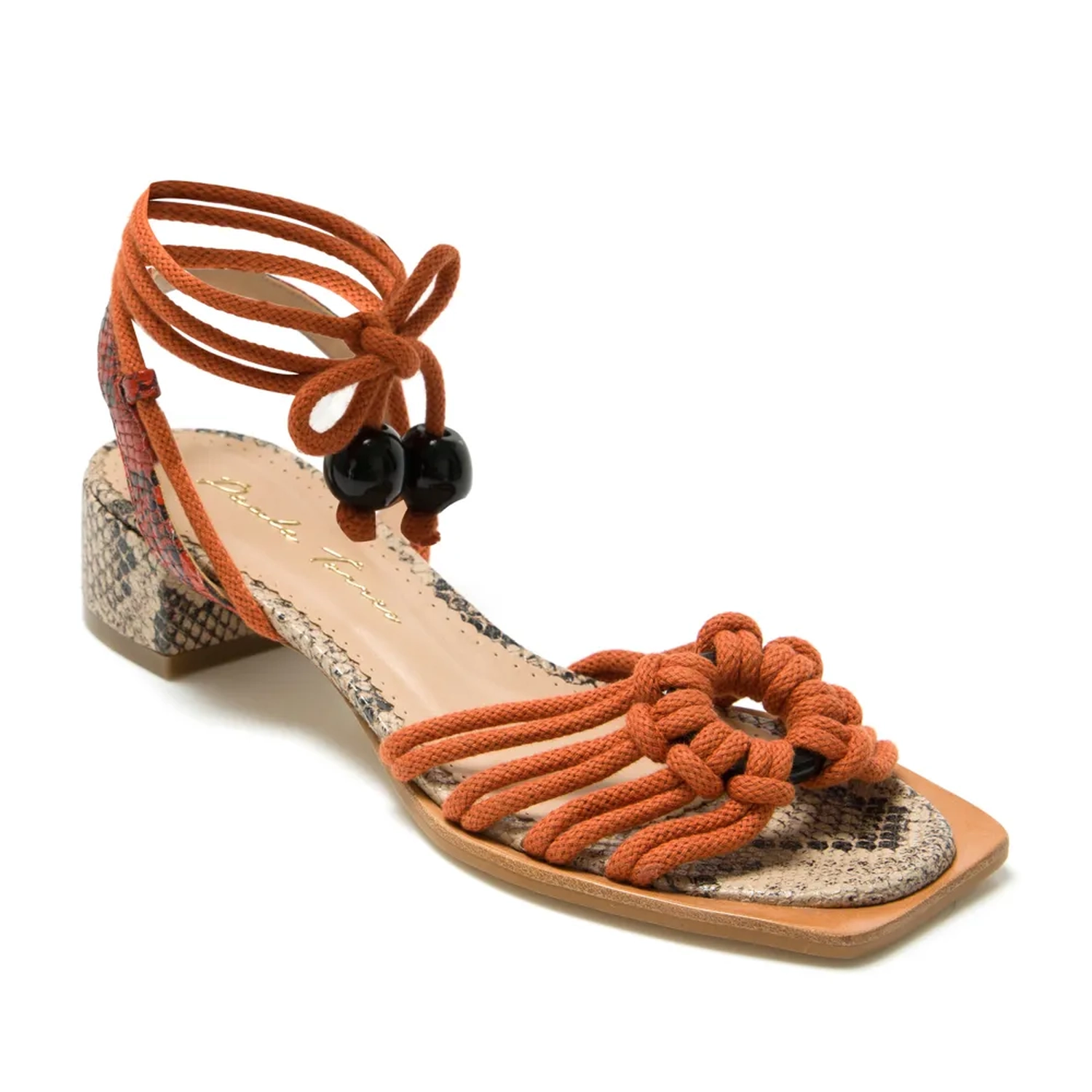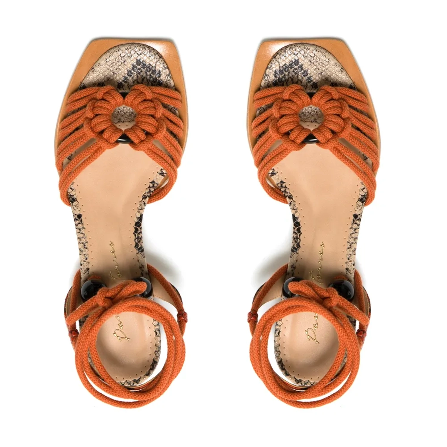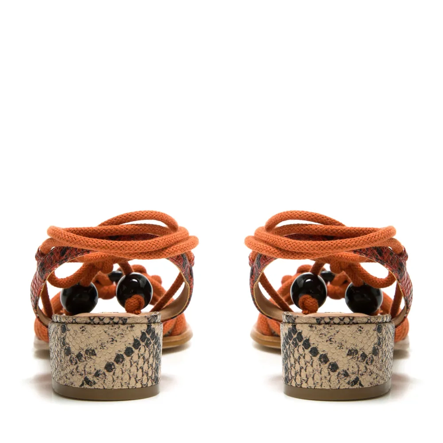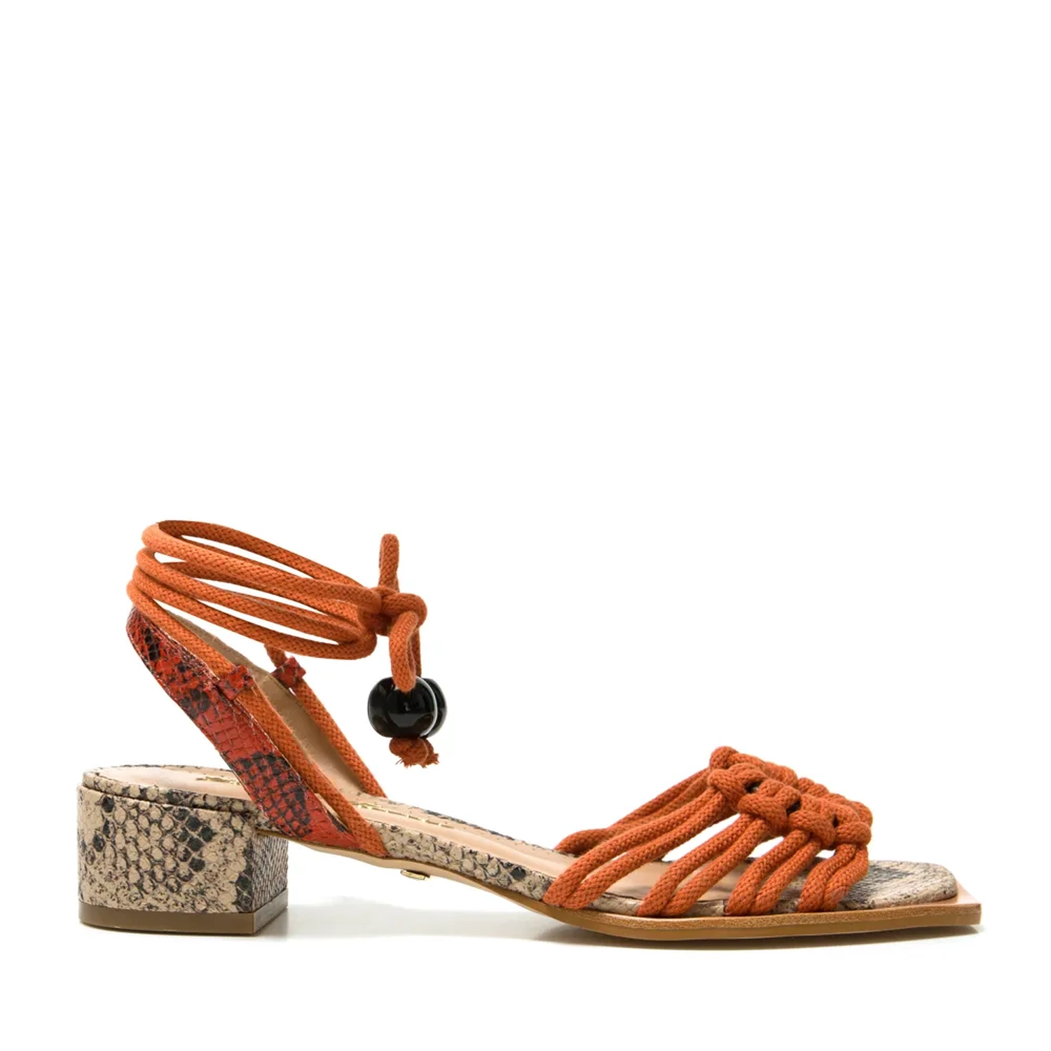 A Sandália Luanda é produzida com fios de algodão e couro com print de cobra. O modelo é focado em detalhes artesanais e traduz a essência do hand made na sua construção. Com um cabedal rico em detalhes onde a argola em acrilico une os fios de algodão por nós na parte superior do modelo e o seu acabamento conta com bico redondo e vira quadrada em couro em um mix & match perfeito para o verão e o seu fechamento através de fios de algodão finalizados com ponteiras em acrilico confere toda a leveza e sofiticação e arrematado com o salto bloco que garante o máximo de conforto no calce. Aposte!!!