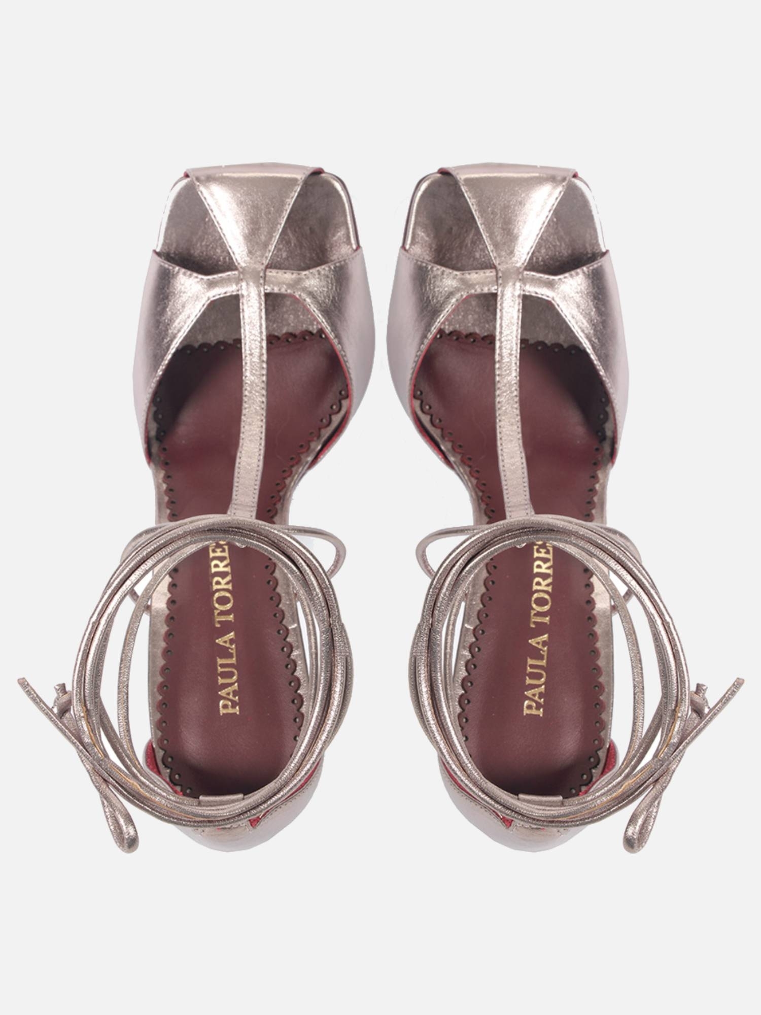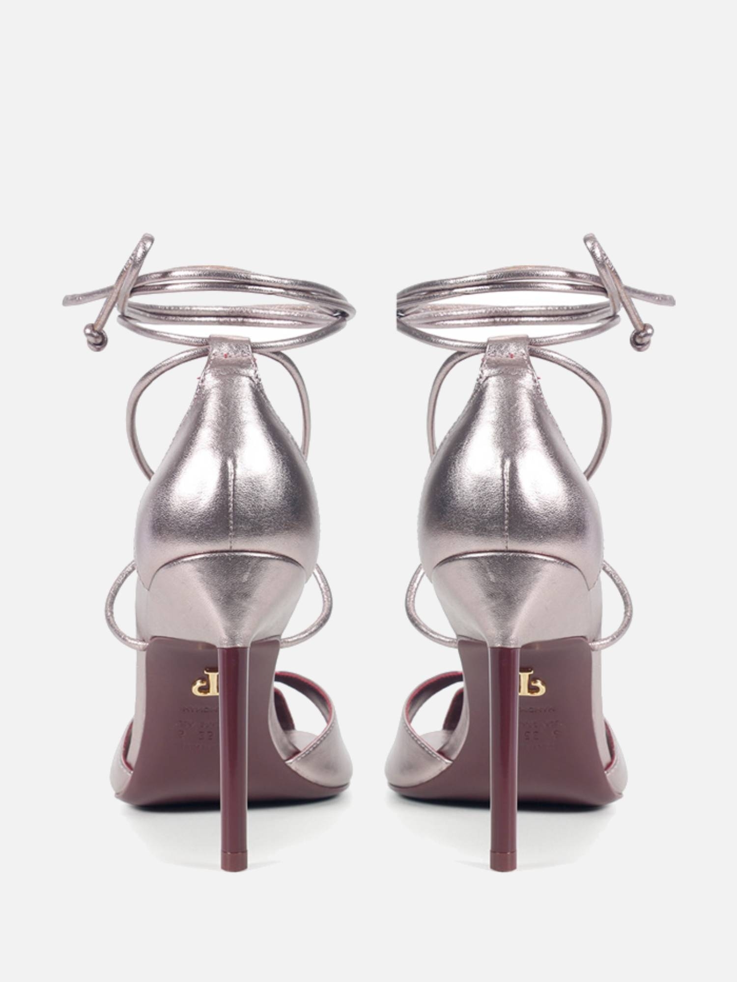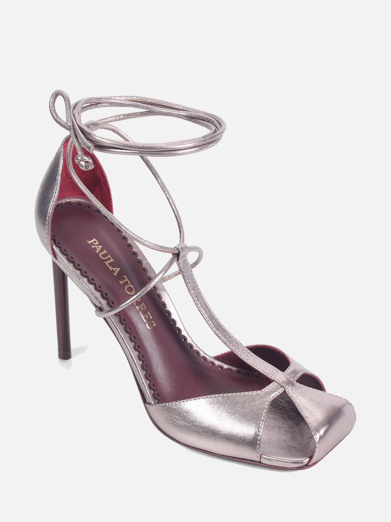 A Sandália Lugano é confeccionada em napa com acabamento metalizado. Modelo com bico arredondado e salto alto fino. Cabedal com bico quadrado vazado e parte frontal se afinando até o tornozelo. Fechamento por amarração com tiras em couro.