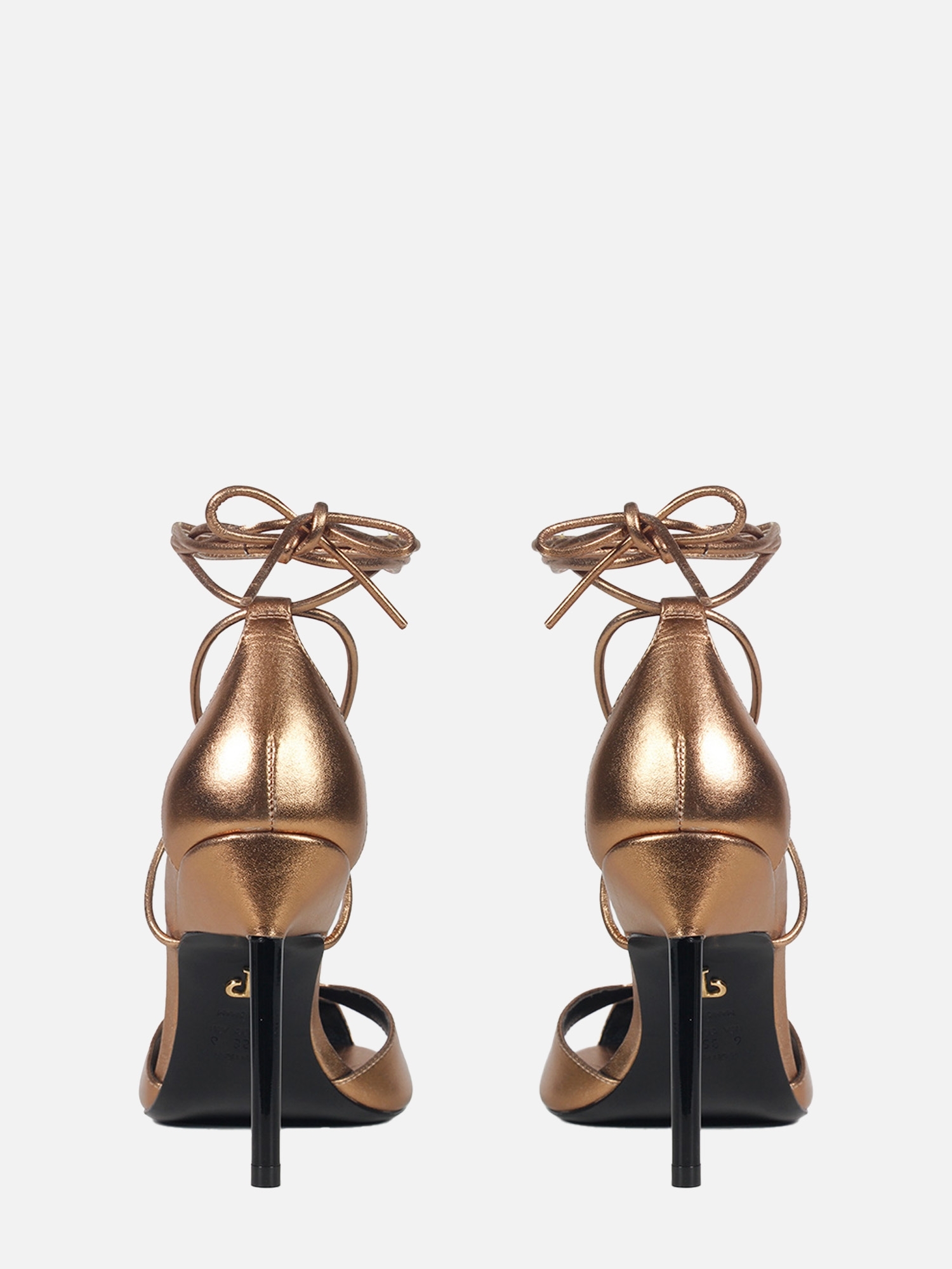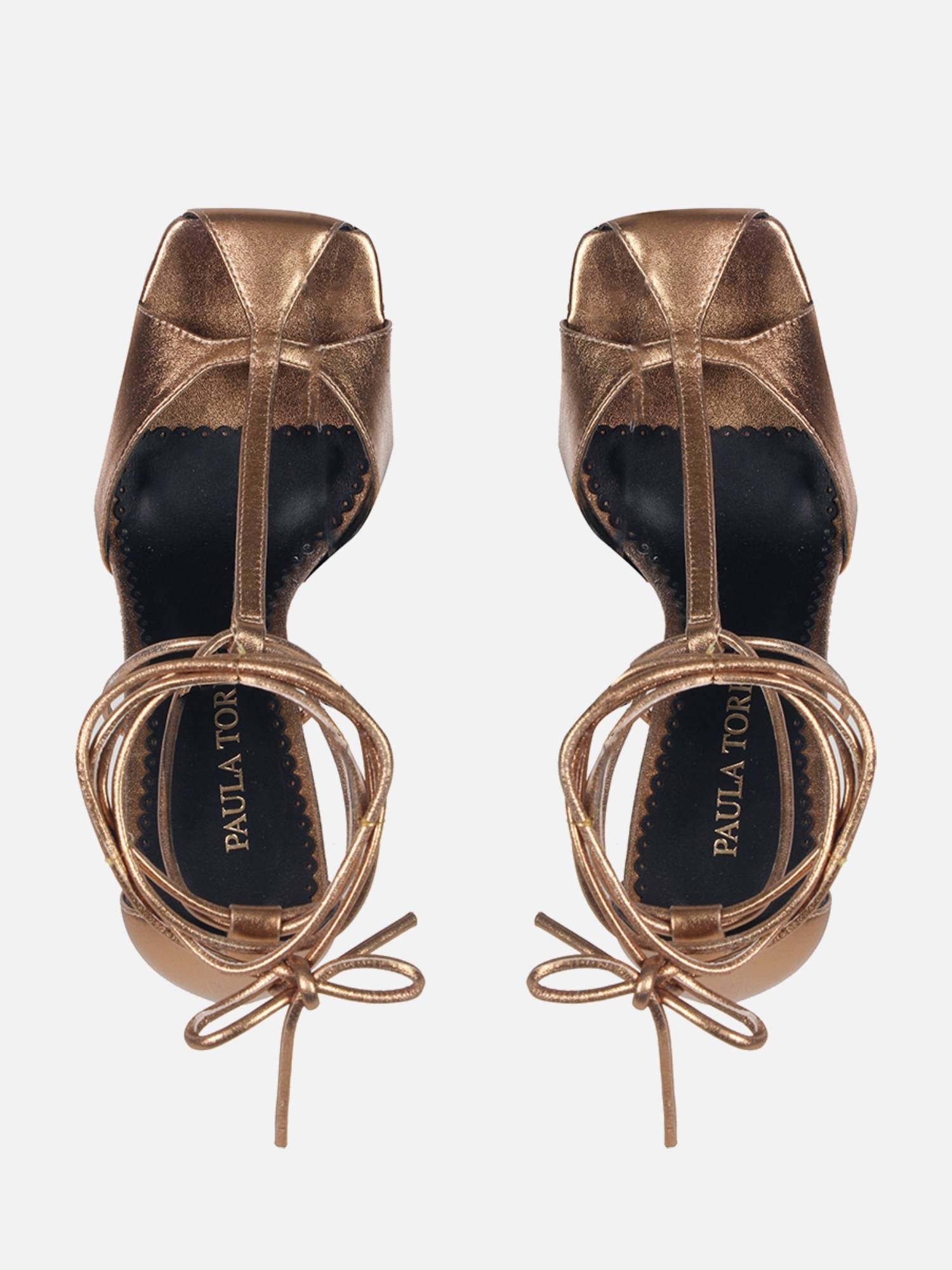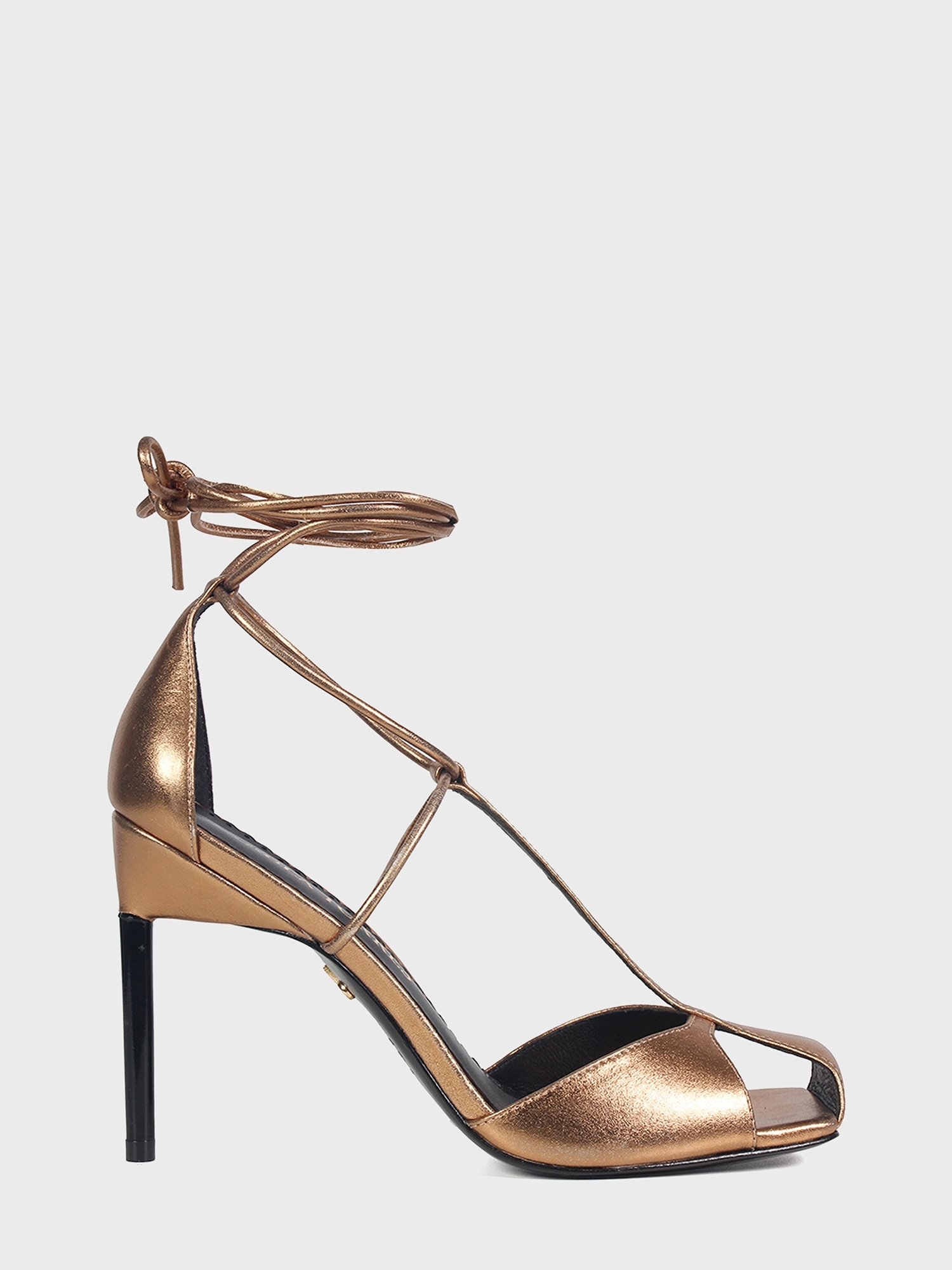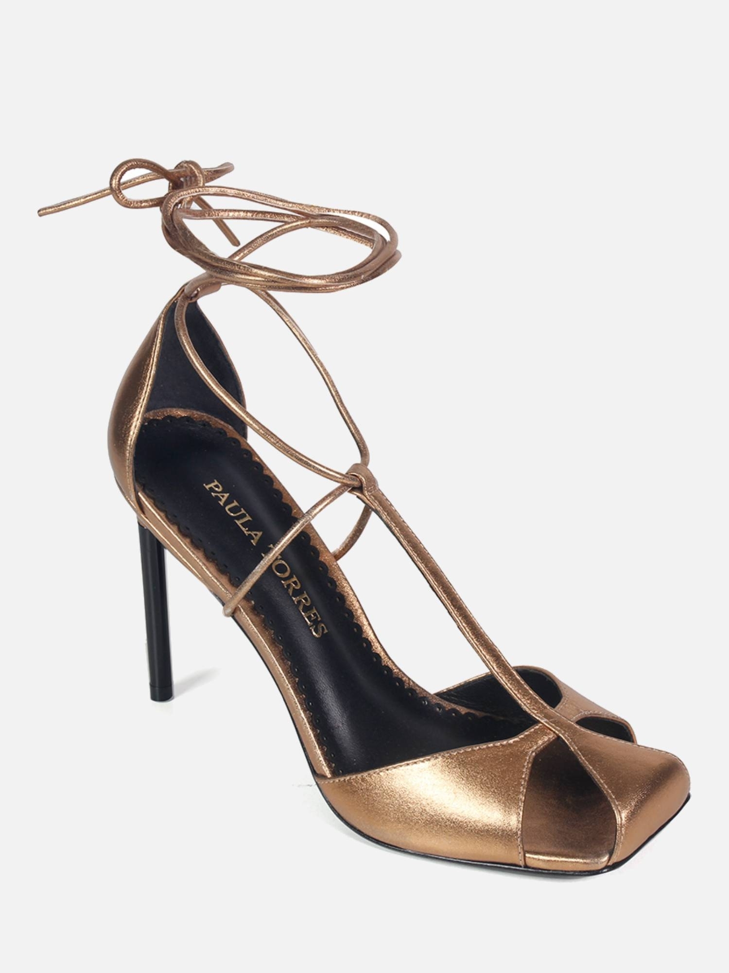 A Sandália Lugano é confeccionada em napa com acabamento metalizado. Modelo com bico arredondado e salto alto fino. Cabedal com bico quadrado vazado e parte frontal se afinando até o tornozelo. Fechamento por amarração com tiras em couro.