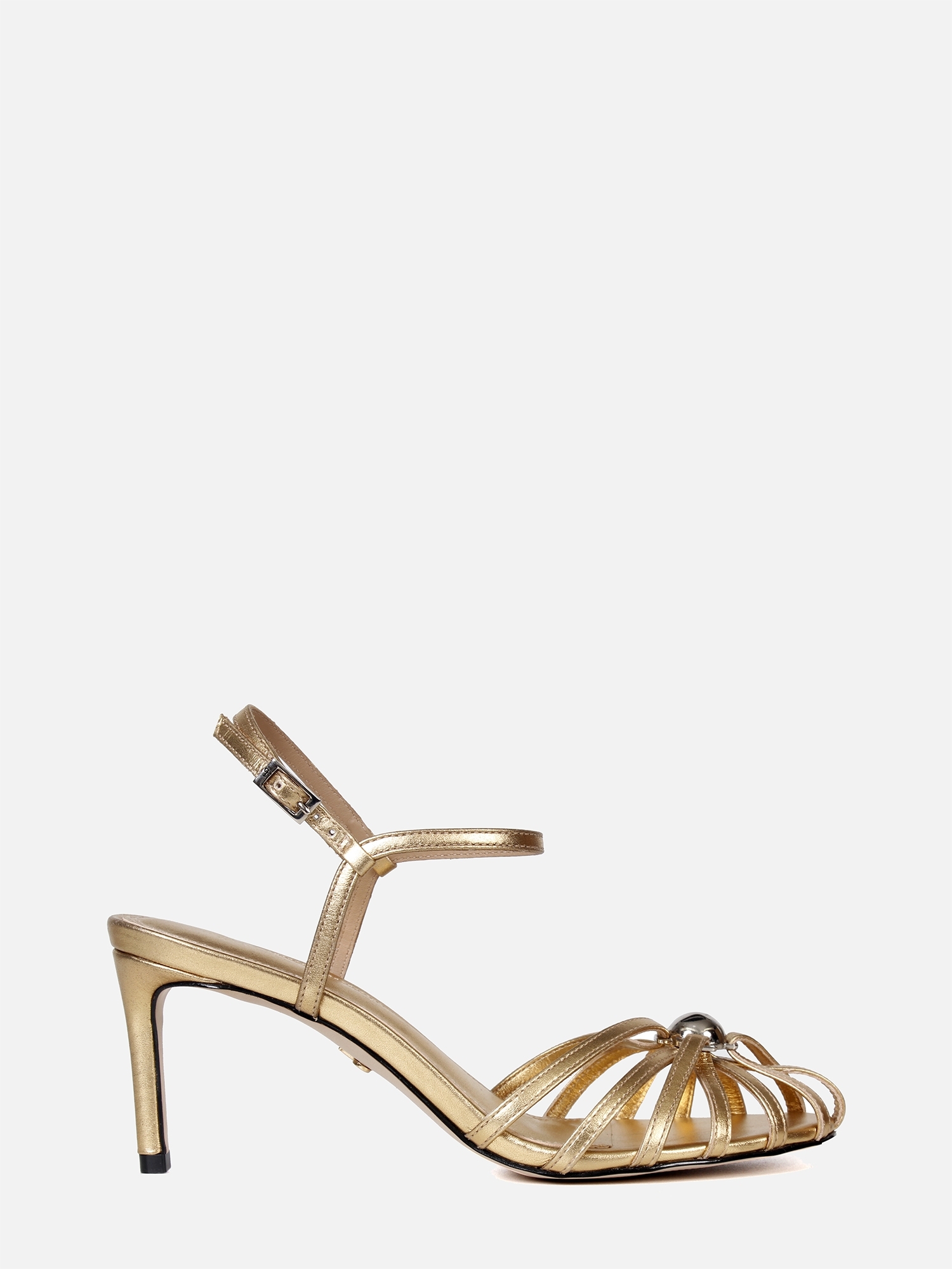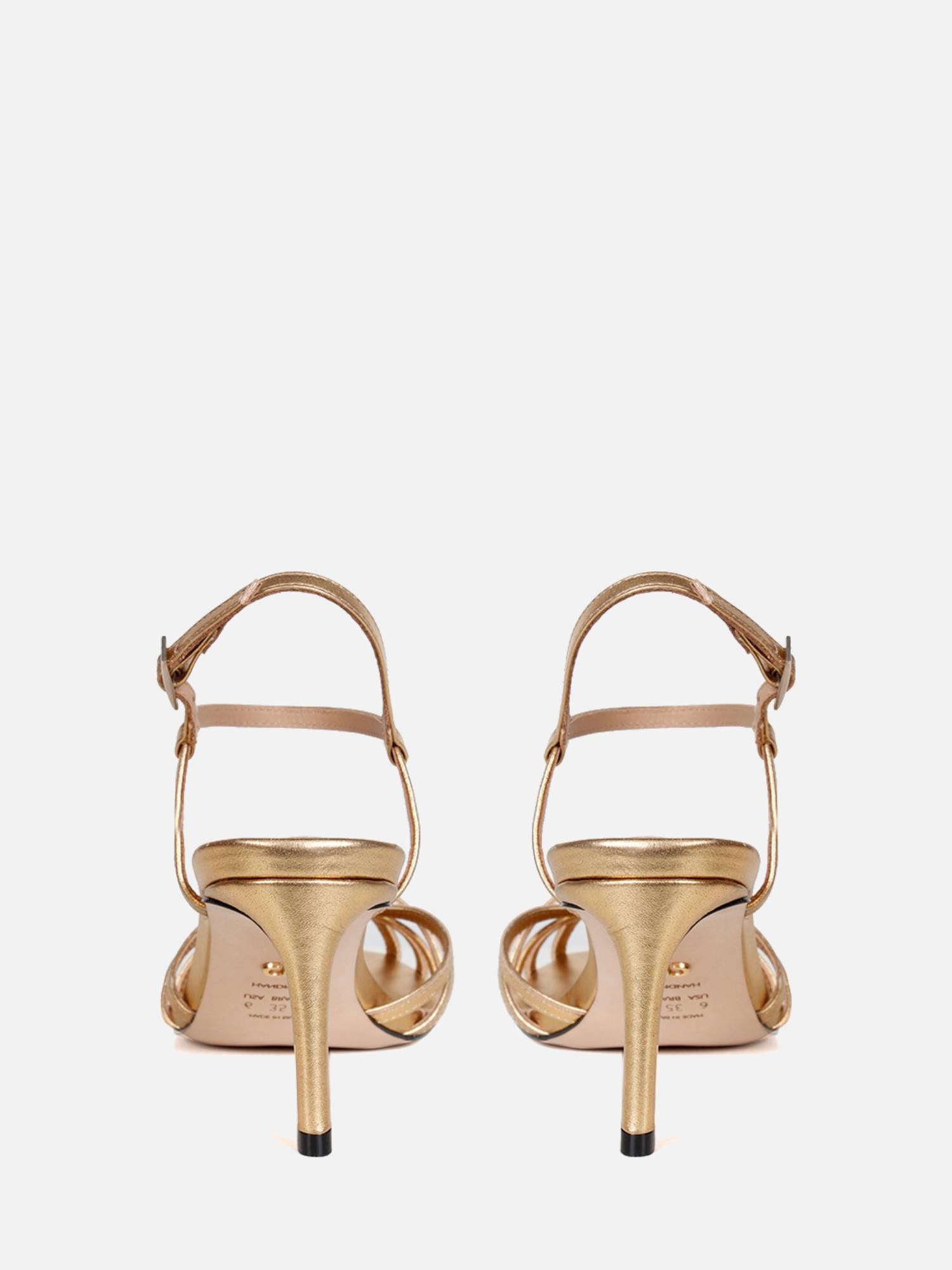 A Sandália Luna é um calçado elegante e moderno, confeccionado em napa de alta qualidade. O bico redondo confere um design clássico e feminino à sandália. O cabedal da Sandália Luna é composto por tiras finas em napa metalizada, criando um efeito visual atraente e estiloso. Essas tiras entrelaçadas constroem um cabedal que centraliza a atenção para a peça esférica em metal, um detalhe decorativo que traz um toque de brilho e fica ao nível do calçado.