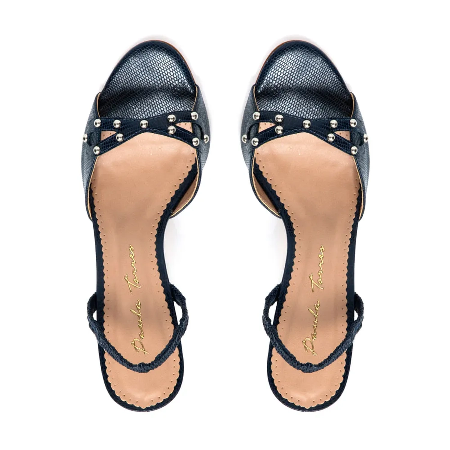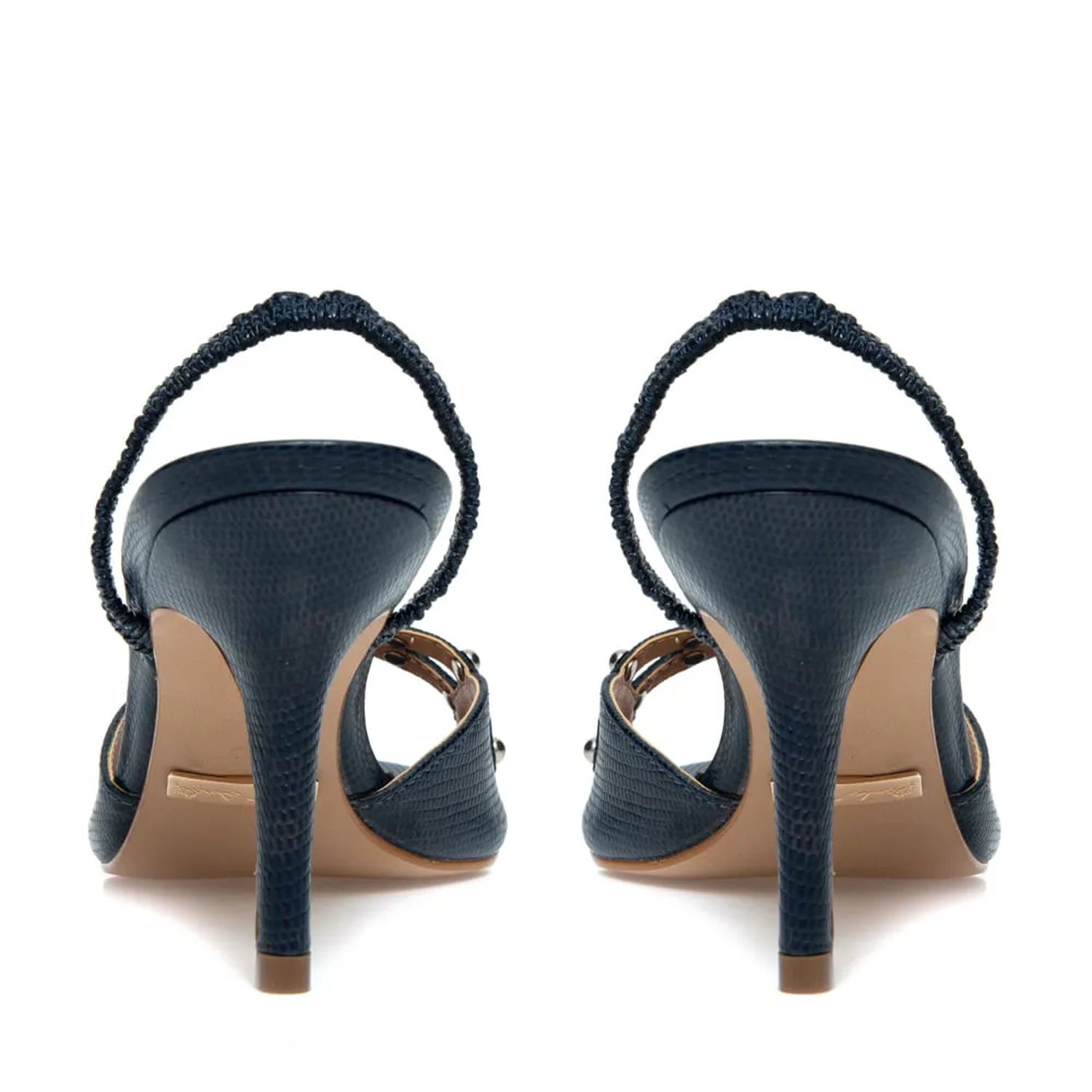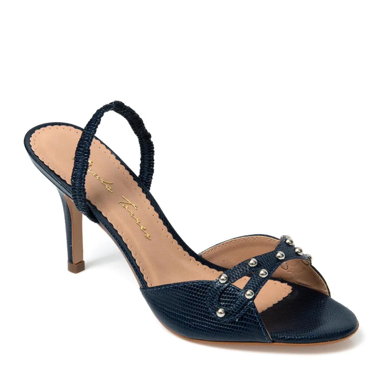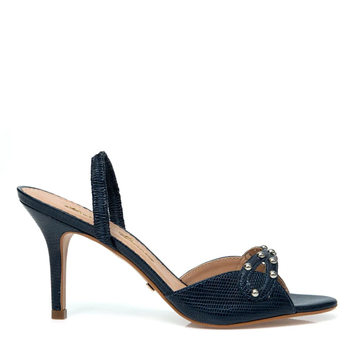 A Sandália Maju é confeccionada em couro mini lezard. Cabedal fechado nas laterais, unido por uma tira de couro em forma de laço, com aplicação de bolinhas metalizadas em cima. Uma tira de elástico coberta por couro franzido para o calcanhar. Salto agulha e bico redondo.