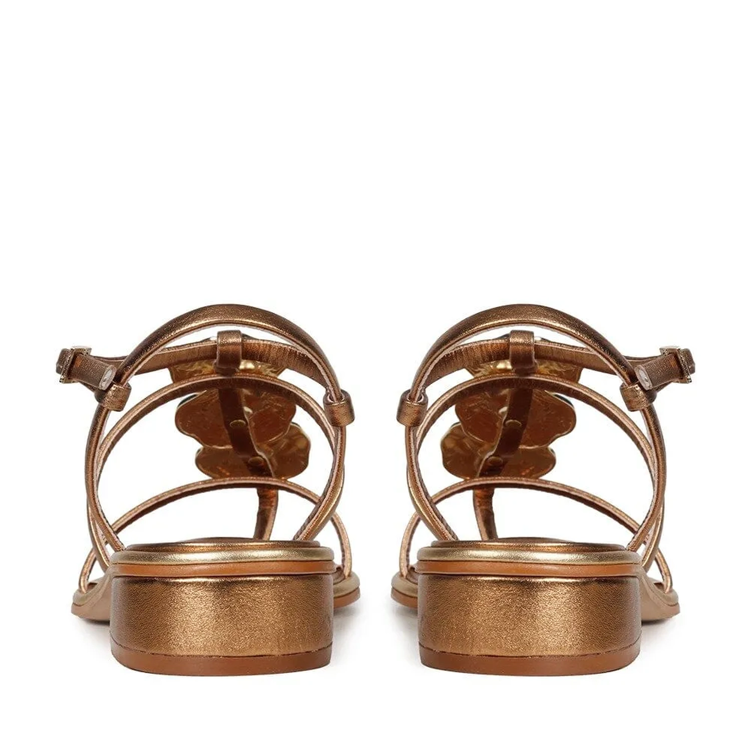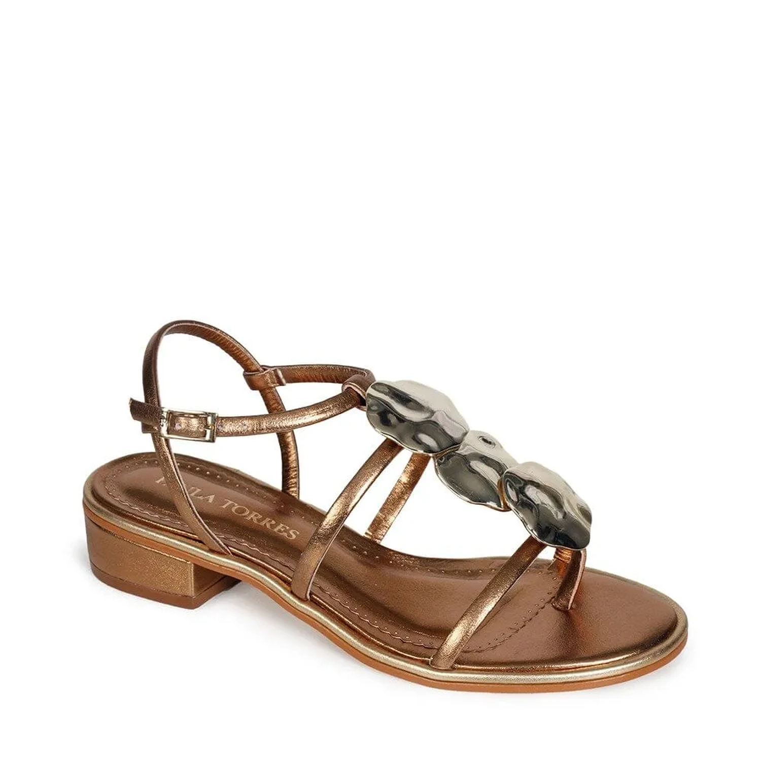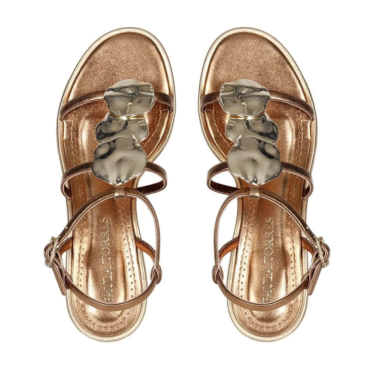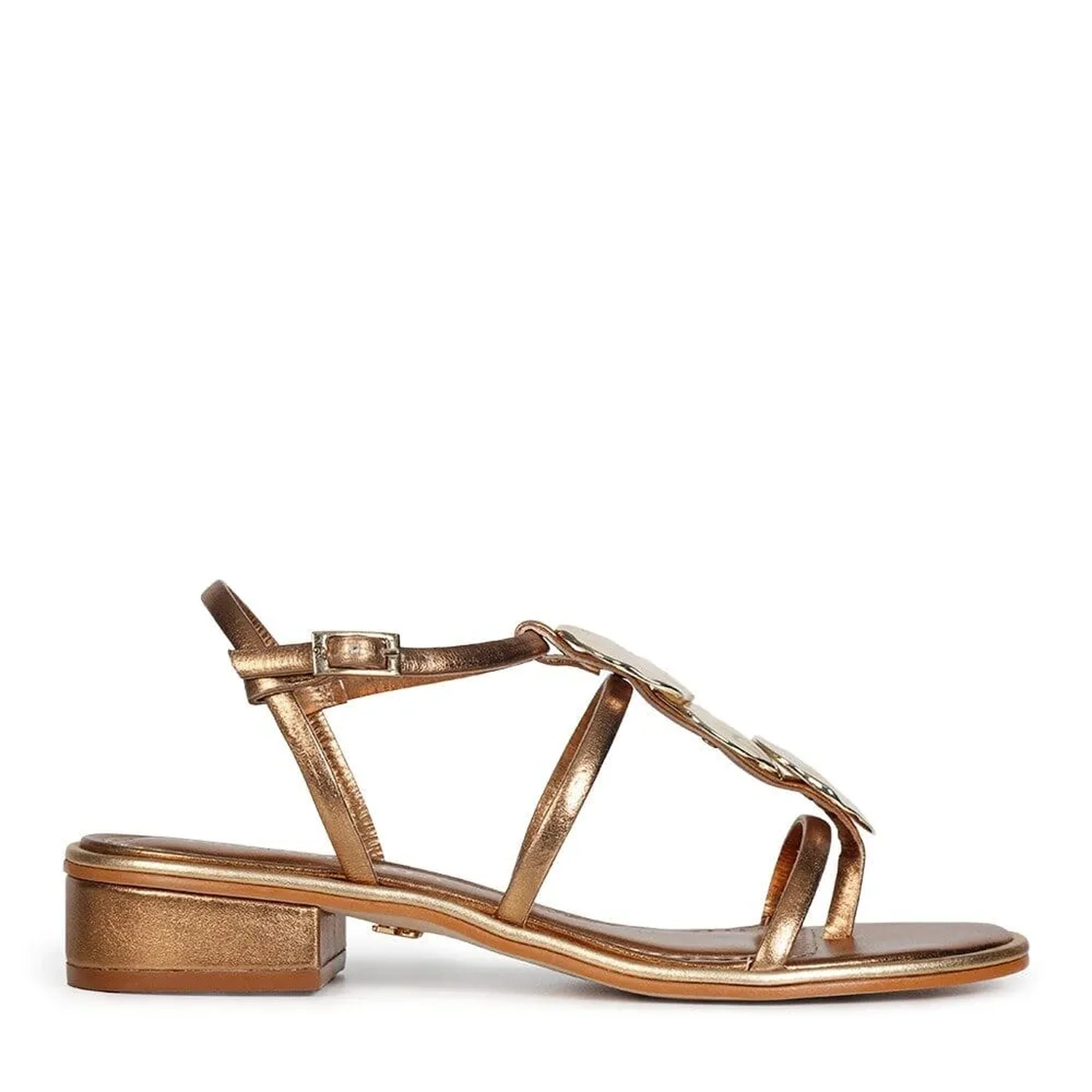 A Sandália Marie é confeccionada em couro. Construção clássica, composta por finas tiras de couro e fechamento por fivela ajustável. O destaque do modelo são as aplicações metálicas em dourado, que possuem uma forma não-uniforme, criando uma estética despojada e estilosa, traduzindo o DNA da marca. O salto baixo bloco garante conforto e sofisticação, e o fechamento por fivela dourada arremata a peça.