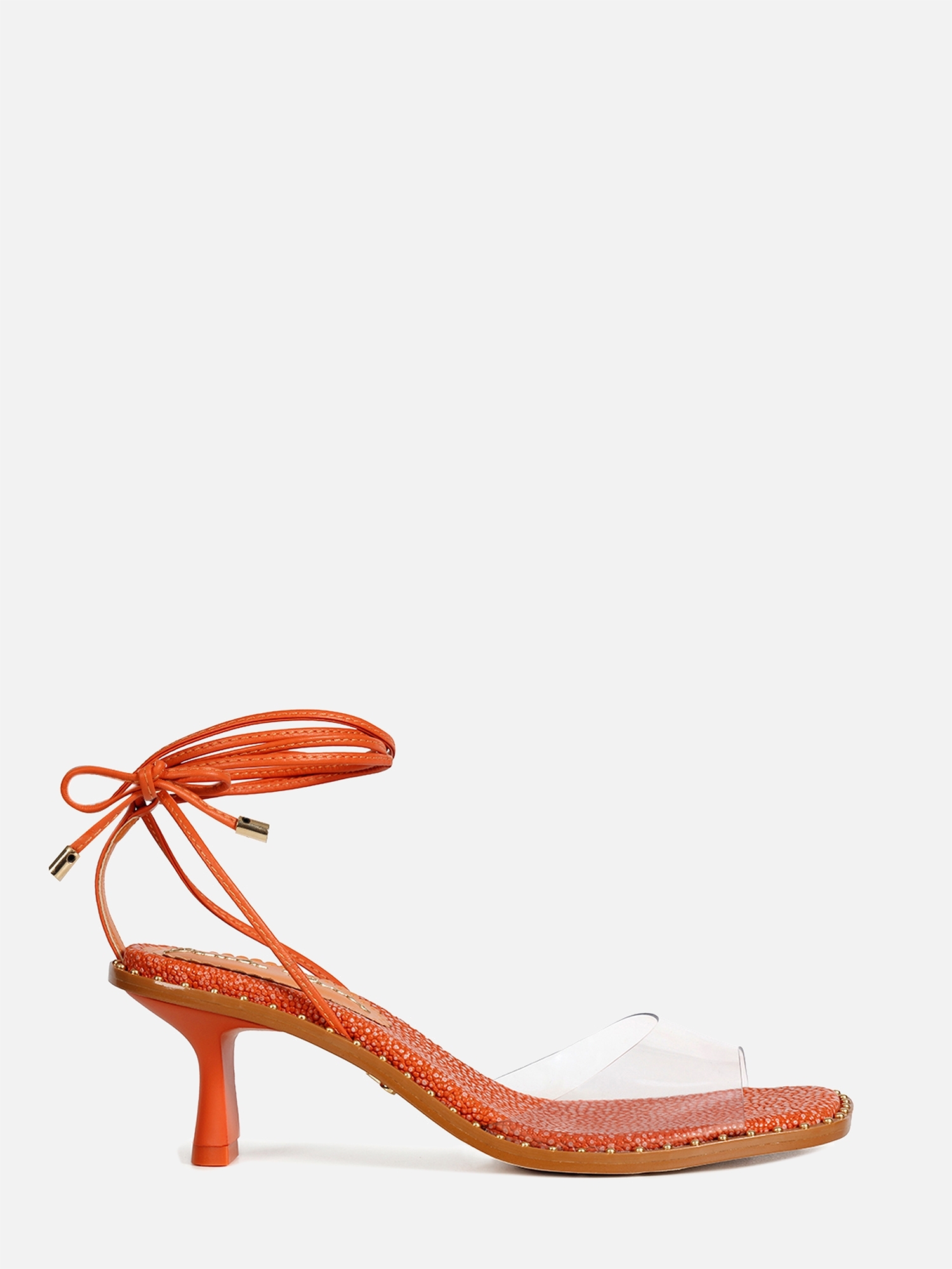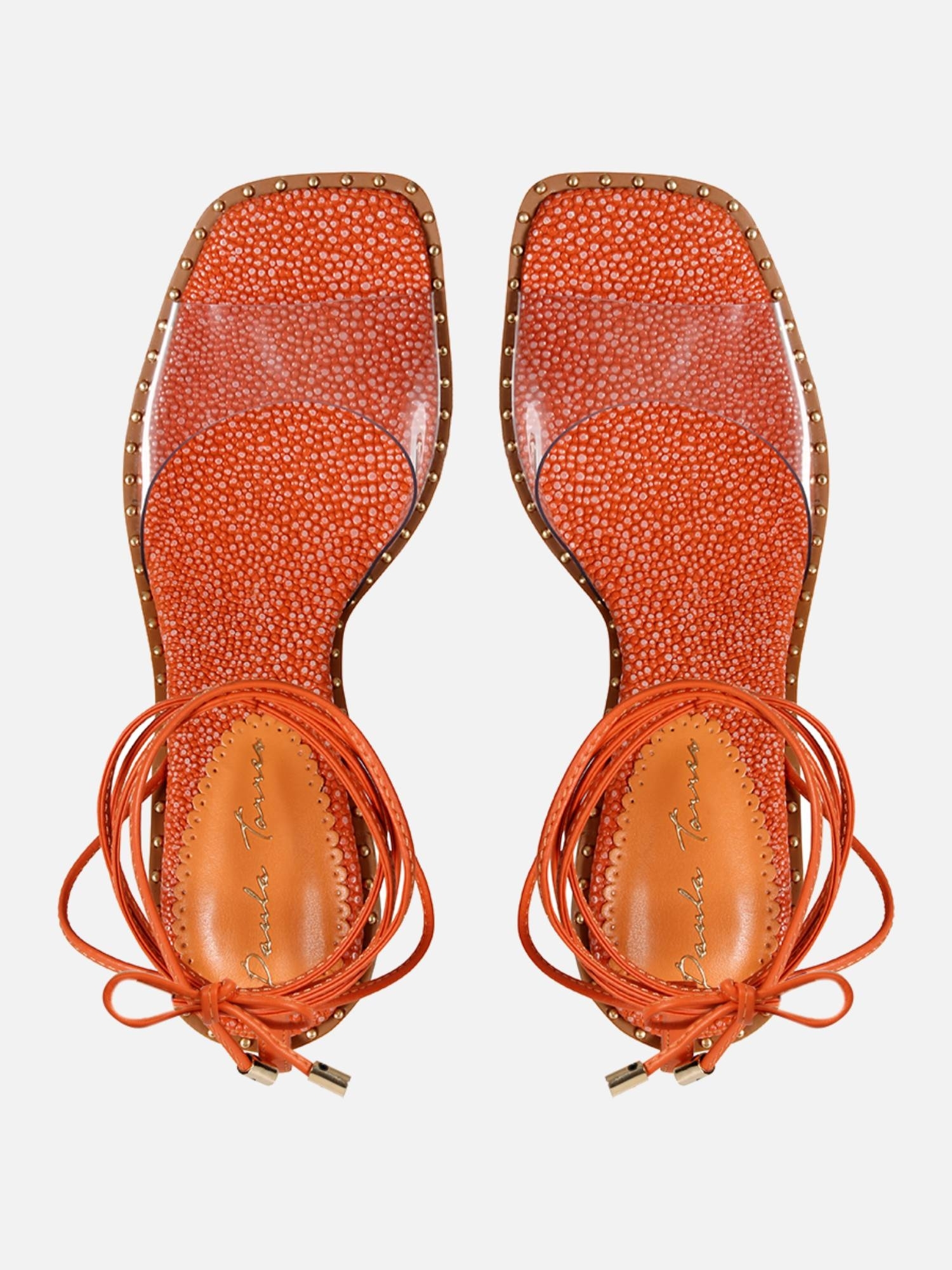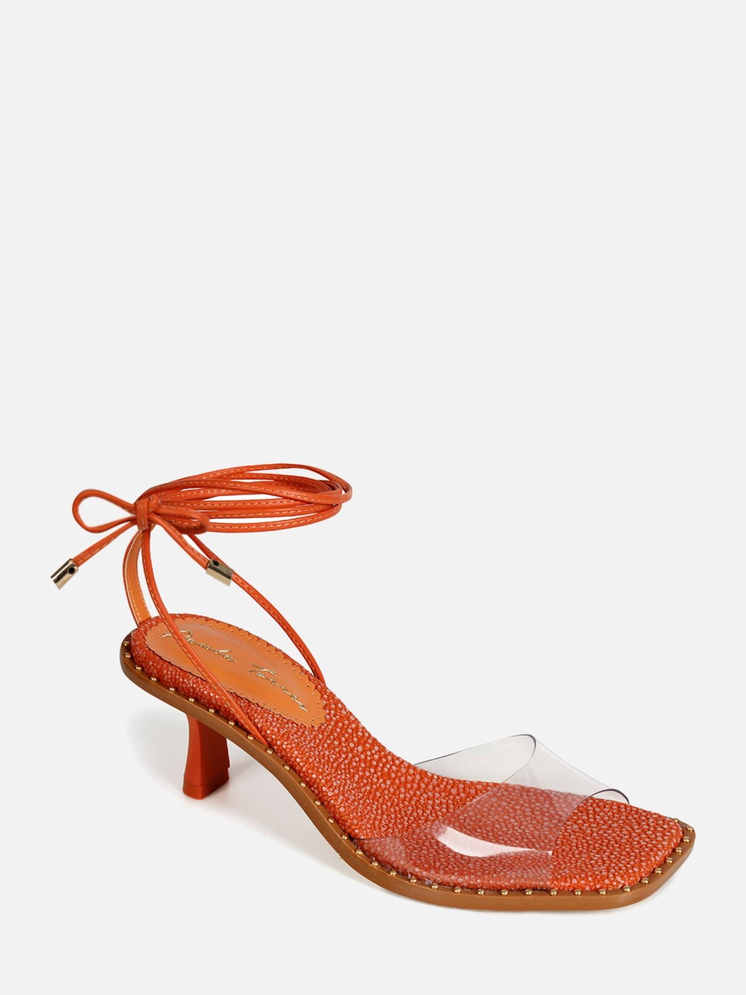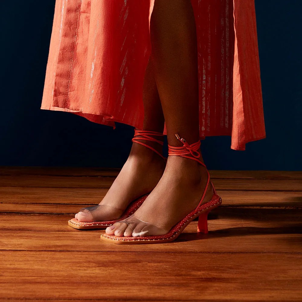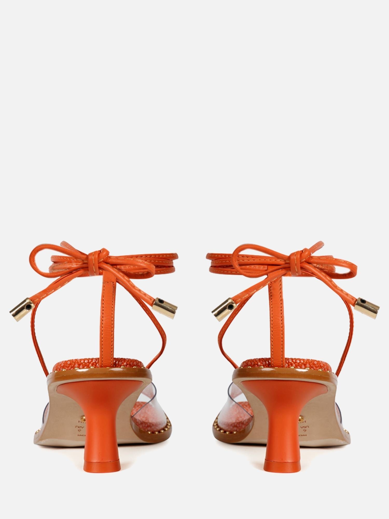 A Sandália Meg é confeccionada em couro. Modelagem em bico quadrado e salto fino. Estética minimalista, apresentando um cabedal de material transparente, tendência Verão 22. Fechamento por amarração das tiras delicadas tiras de couro na parte do tornozelo, finalizados em pingentes metalizados.