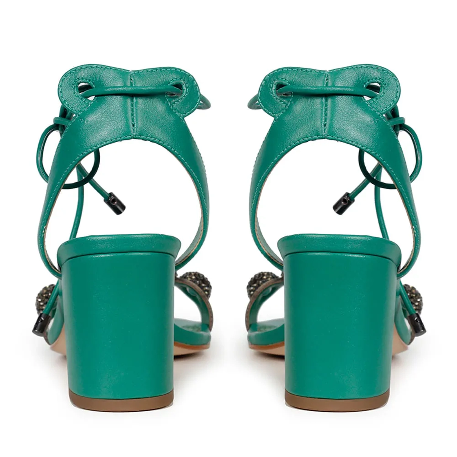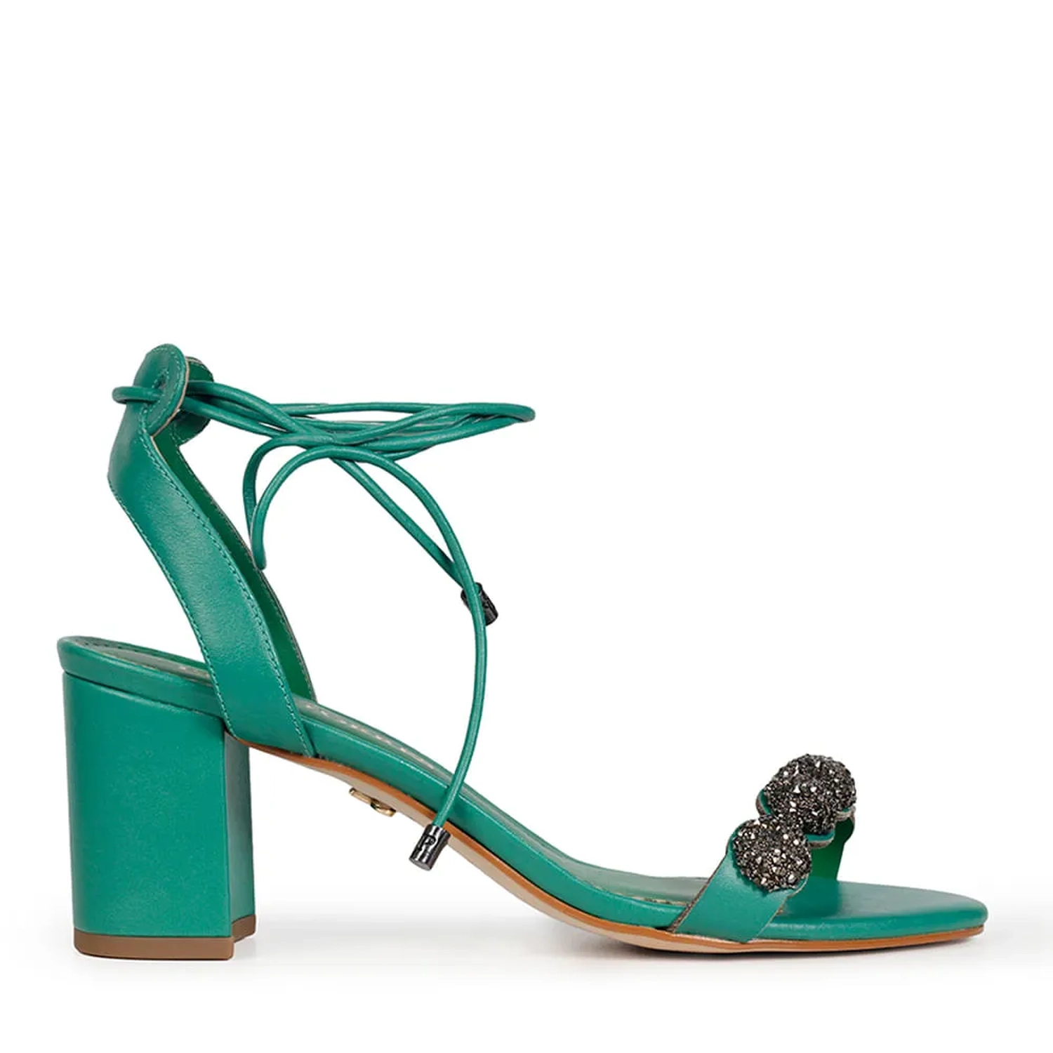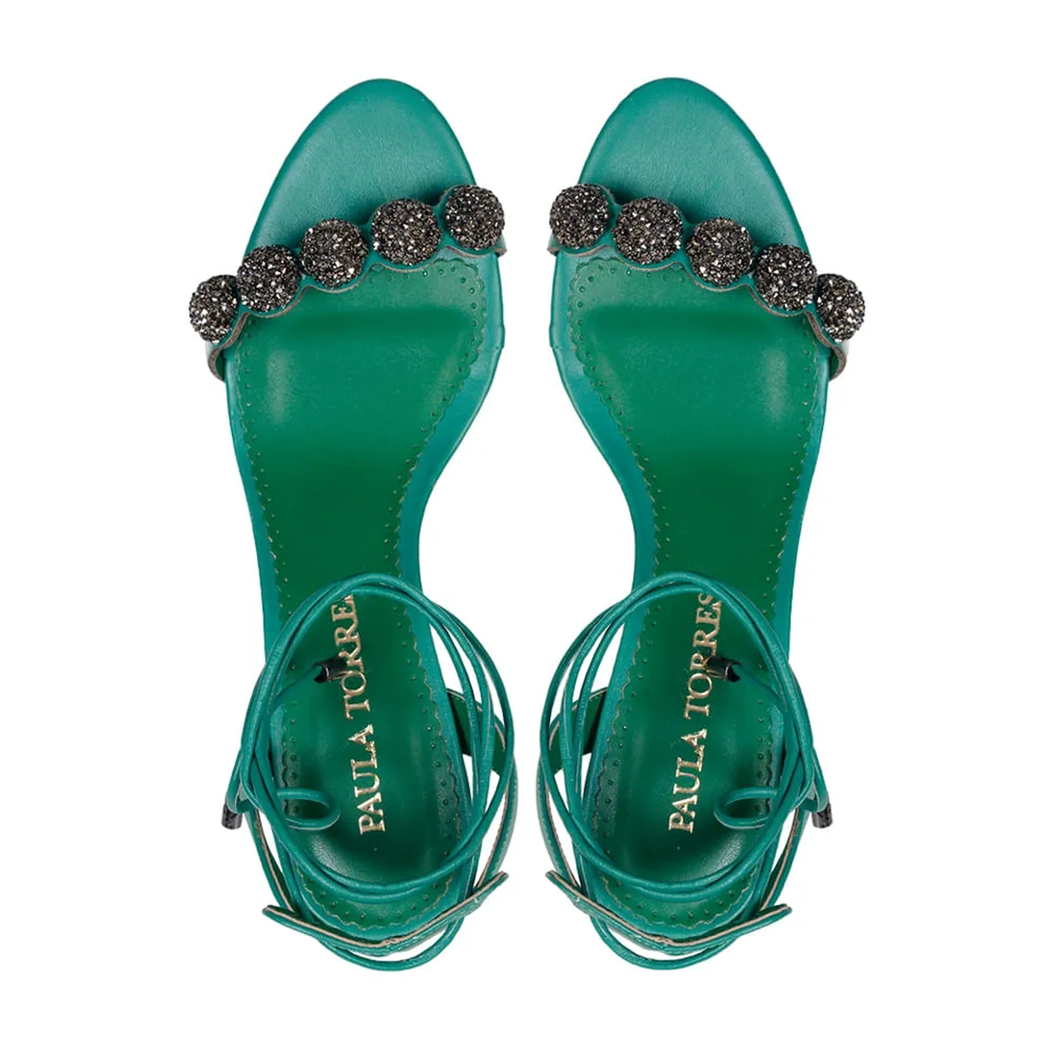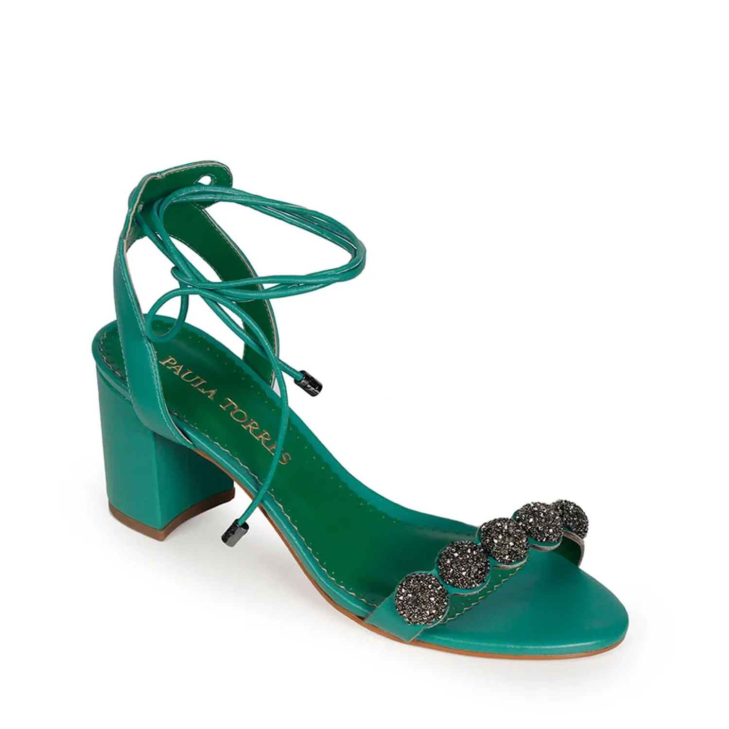 A Sandália Naomi é confeccionada em couro. Modelagem em bico fino arredondado e salto médio bloco. Construção clássica, composta por tiras de couro na parte frontal e envolvendo o calcanhar. O destaque da peça são as aplicações redondas com cristais embutidos, conferindo sofisticação e charme à peça. O fechamento por amarração em couro, finalizada por ponteiras metálicas, carregando o monograma Paula Torres, arremata o modelo de maneira delicada.