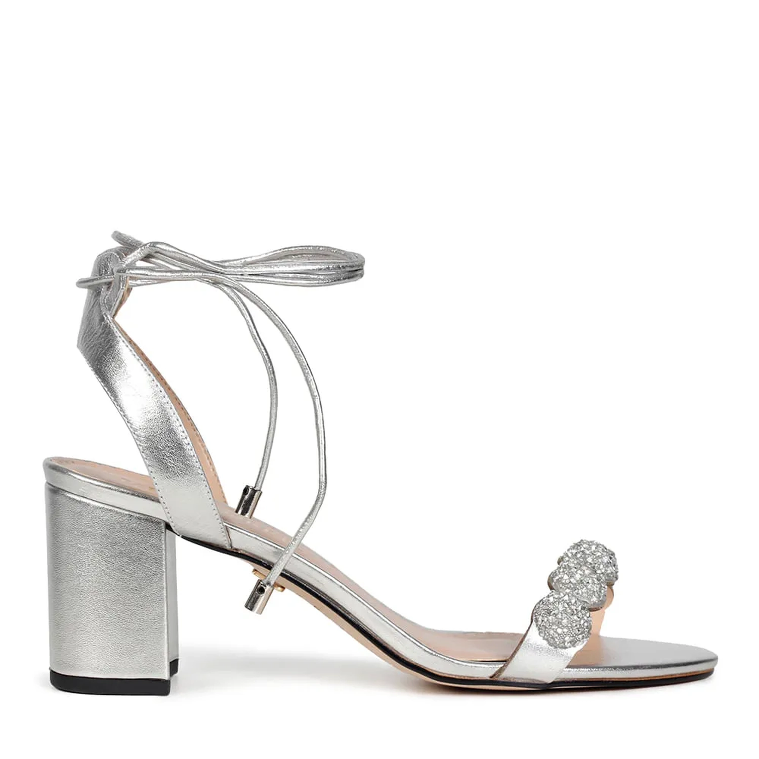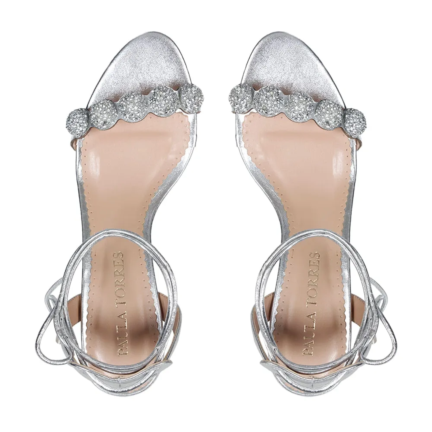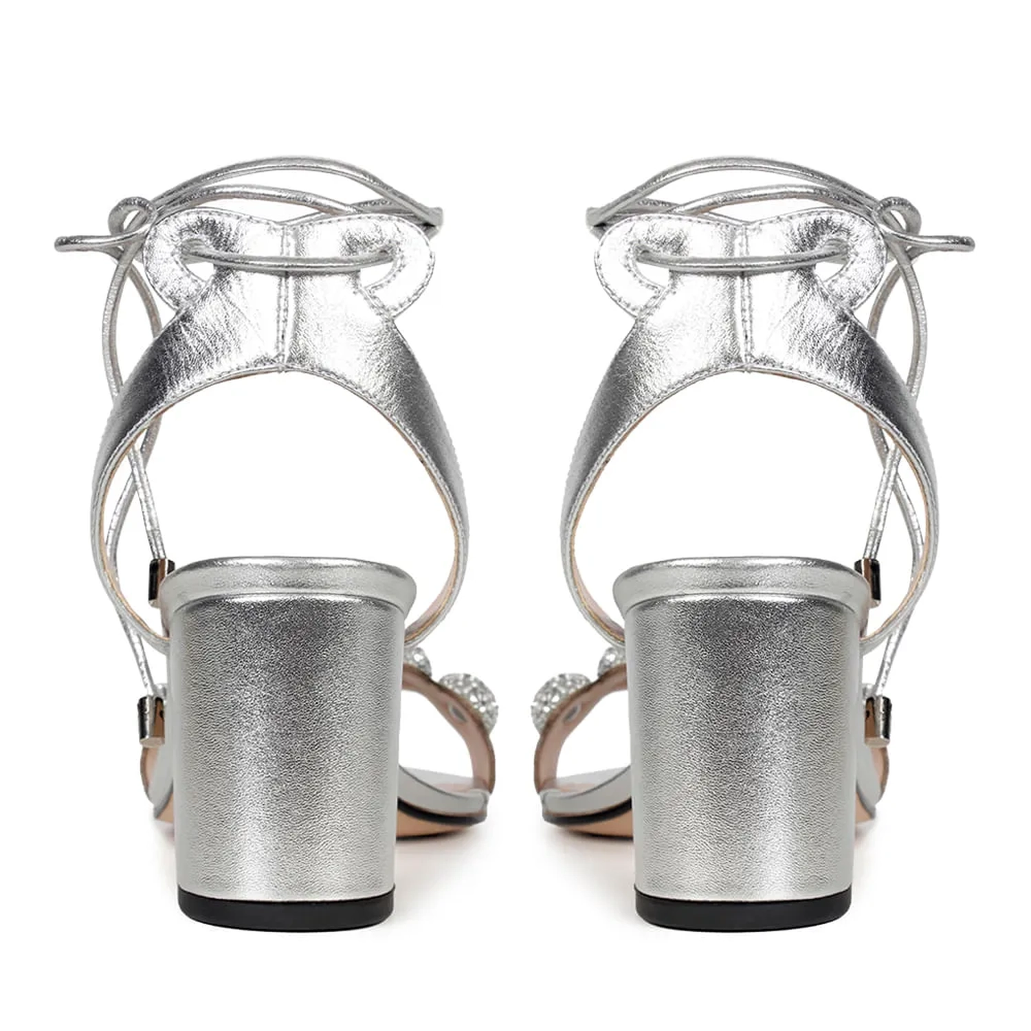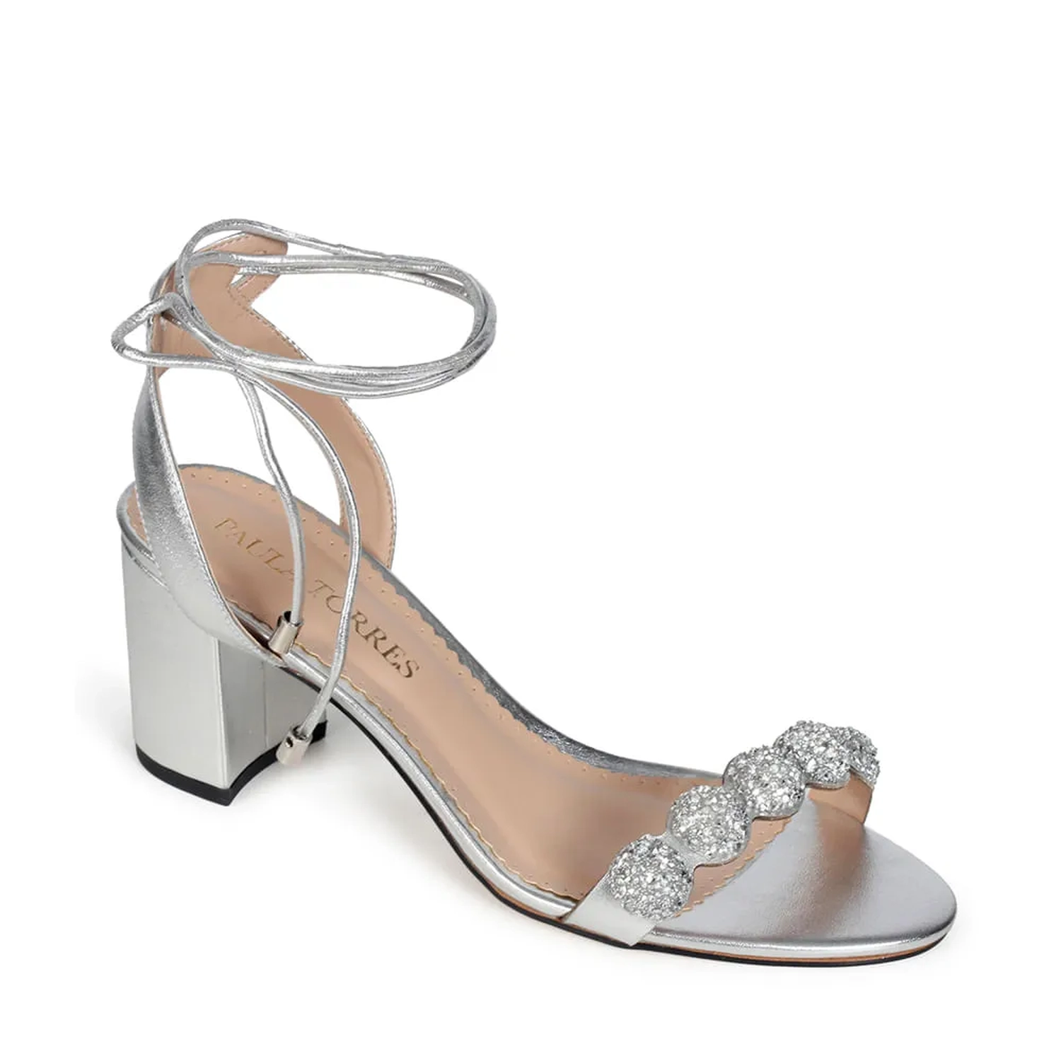 A Sandália Naomi é confeccionada em couro. Modelagem em bico fino arredondado e salto médio bloco. Construção clássica, composta por tiras de couro na parte frontal e envolvendo o calcanhar. O destaque da peça são as aplicações redondas com cristais embutidos, conferindo sofisticação e charme à peça. O fechamento por amarração em couro, finalizada por ponteiras metálicas, carregando o monograma Paula Torres, arremata o modelo de maneira delicada.