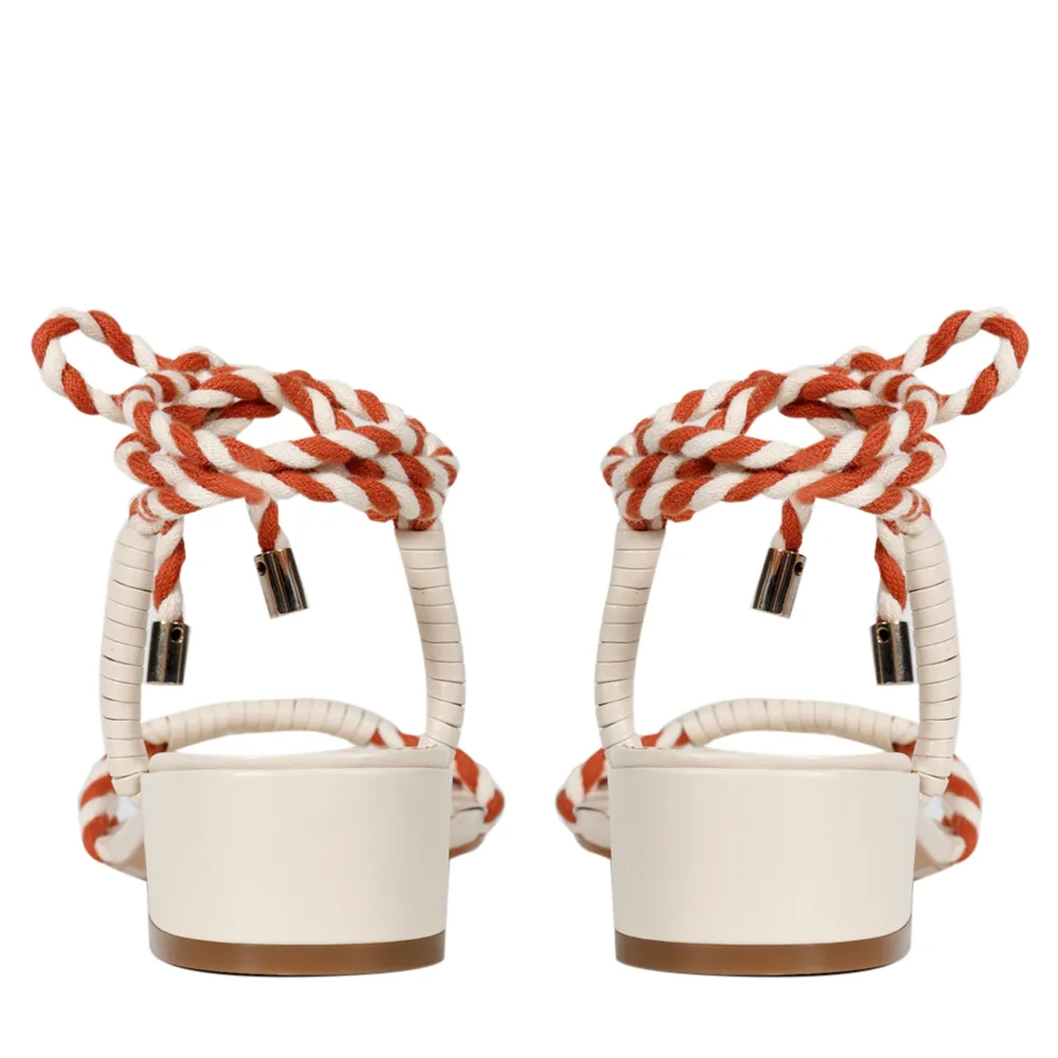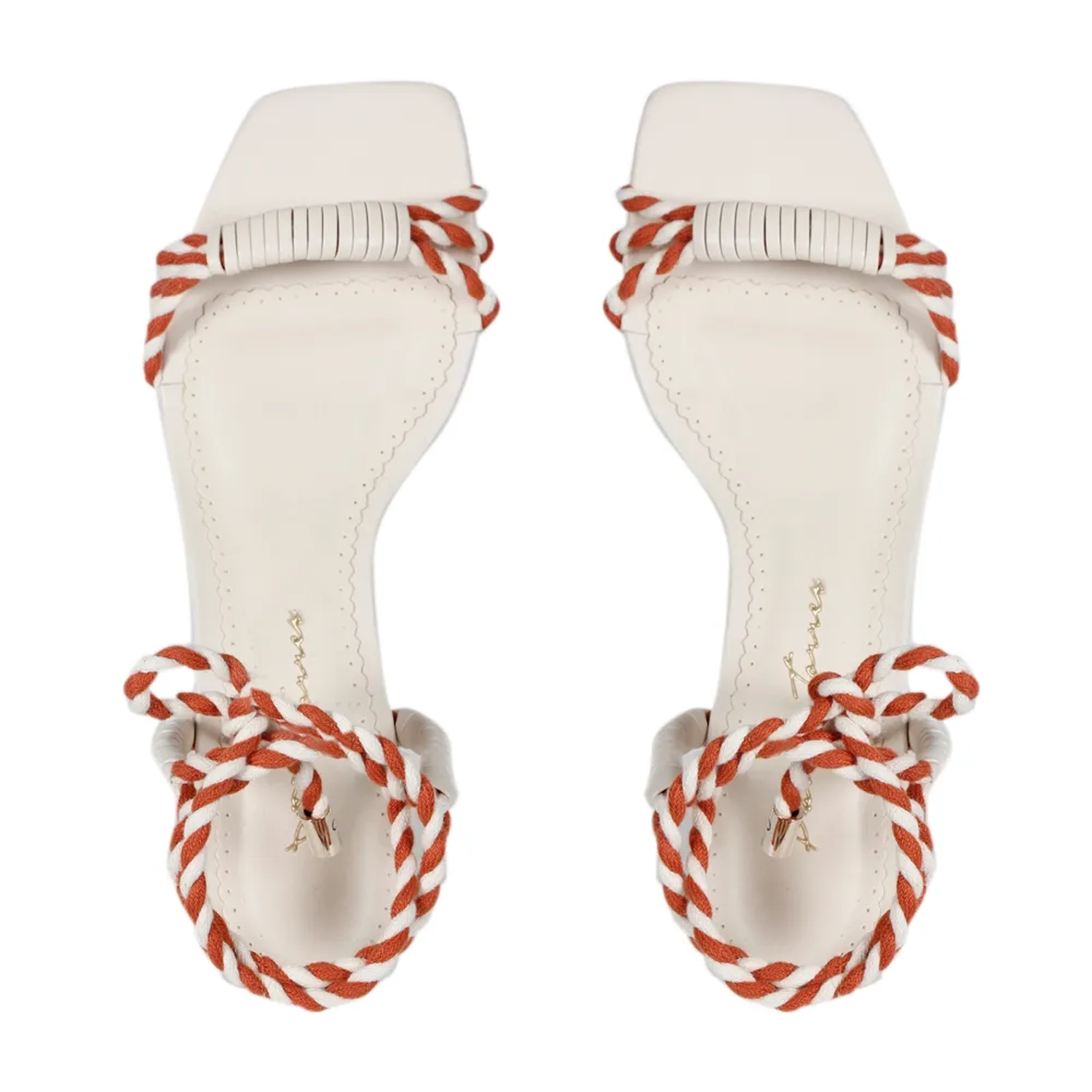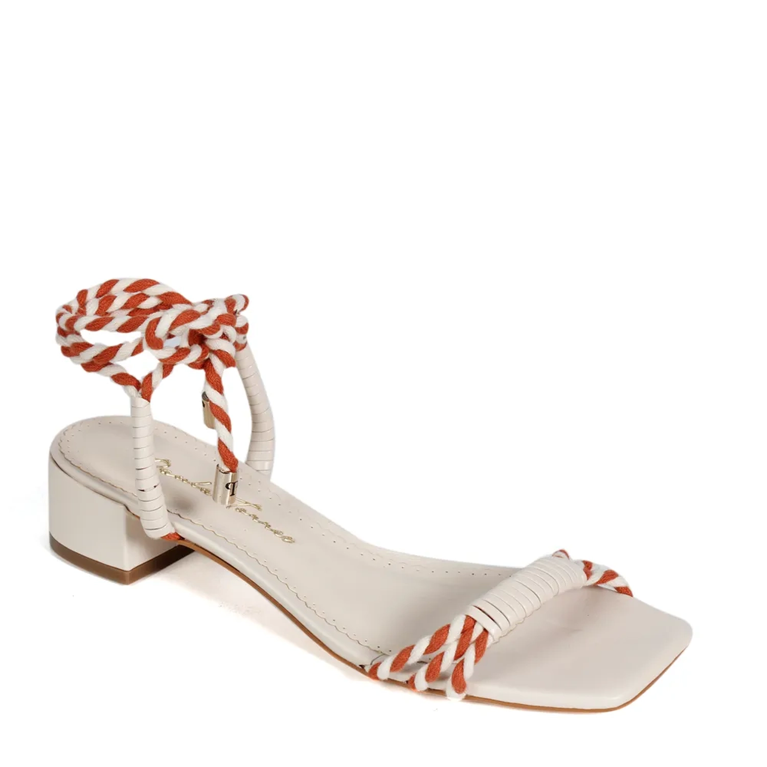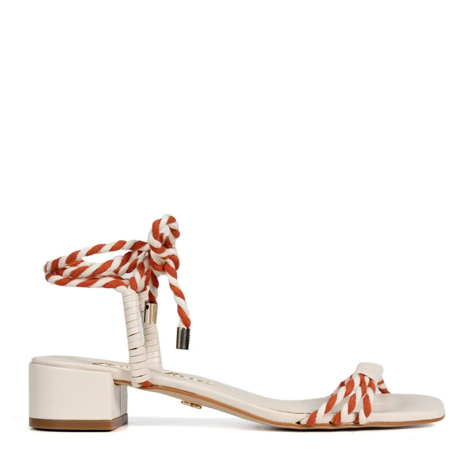 A Sandália Nina é confeccionada em couro. Modelagem em bico quadrado e salto bloco quadrado. Cabedal e tornozeleira formada por tiras de couro trançado bicolor, remetendo ao estilo náutico. O fechamento acorre por amarração. As extremidades das cordas são finalizadas com um charme metalizado. Qualidade Paula Torres, a Sandália Nina é completamente Verão 22!