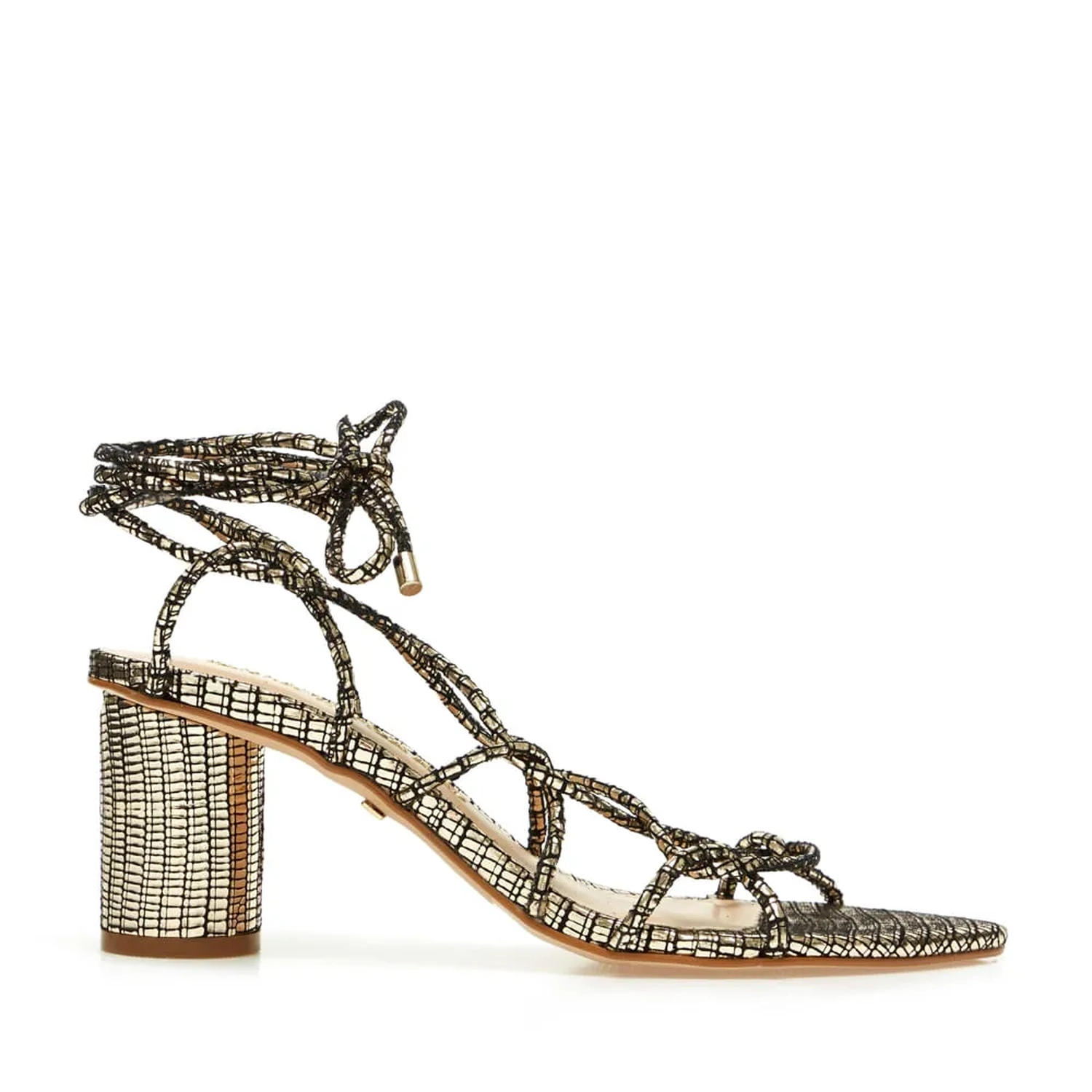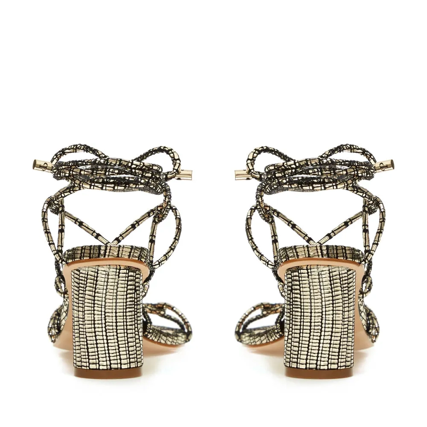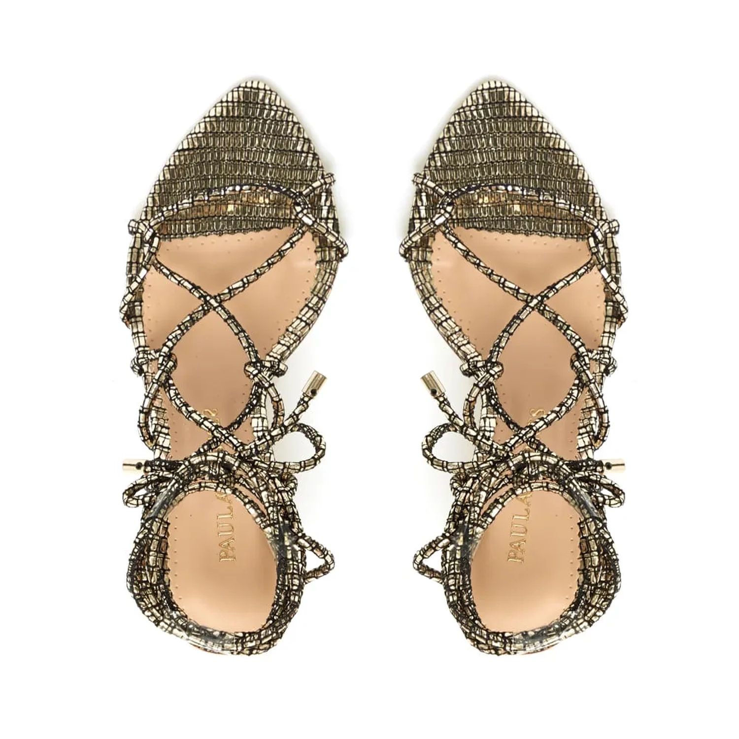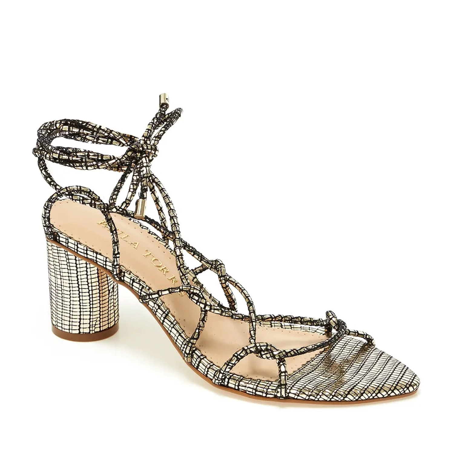 A Sandália Paris é confecciona em couro metalizado. O modelo conta com construção do cabedal em tiras finas entrelaçadas e como ponto chave a delicadeza da amarração, além de salto exclusivo em formato pilar. a riqueza de detalhes e sutileza no seu desenvolvimento são percebidos no print metalizado, na fivela com monograma da marca. Uma sandália eterna que reafirma a atemporalidade e femilidade presentes no dna Paula Torres.