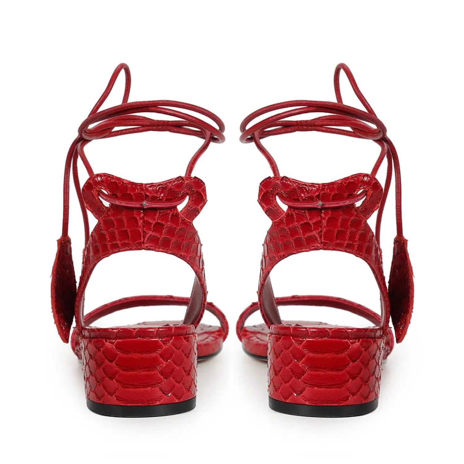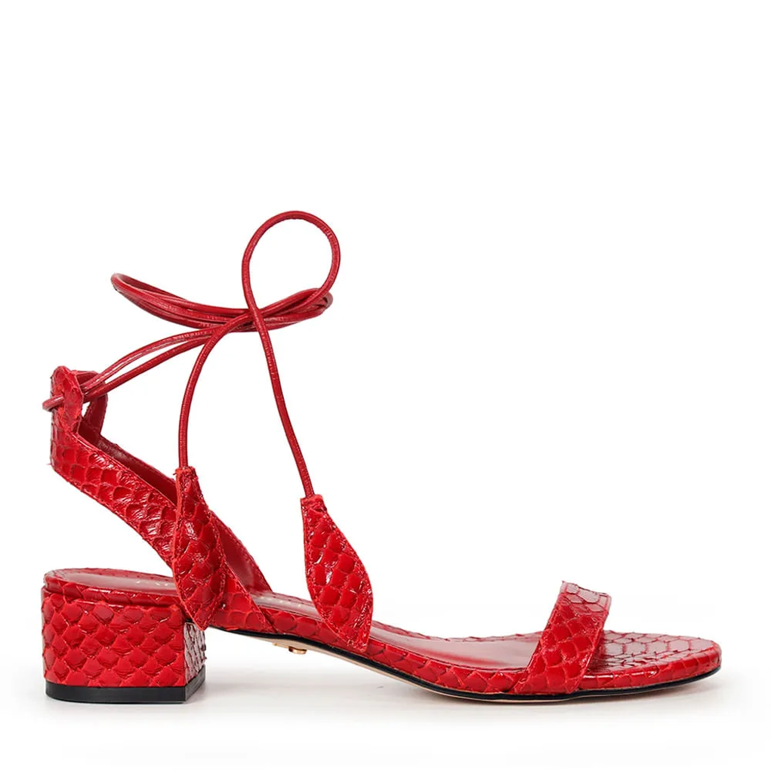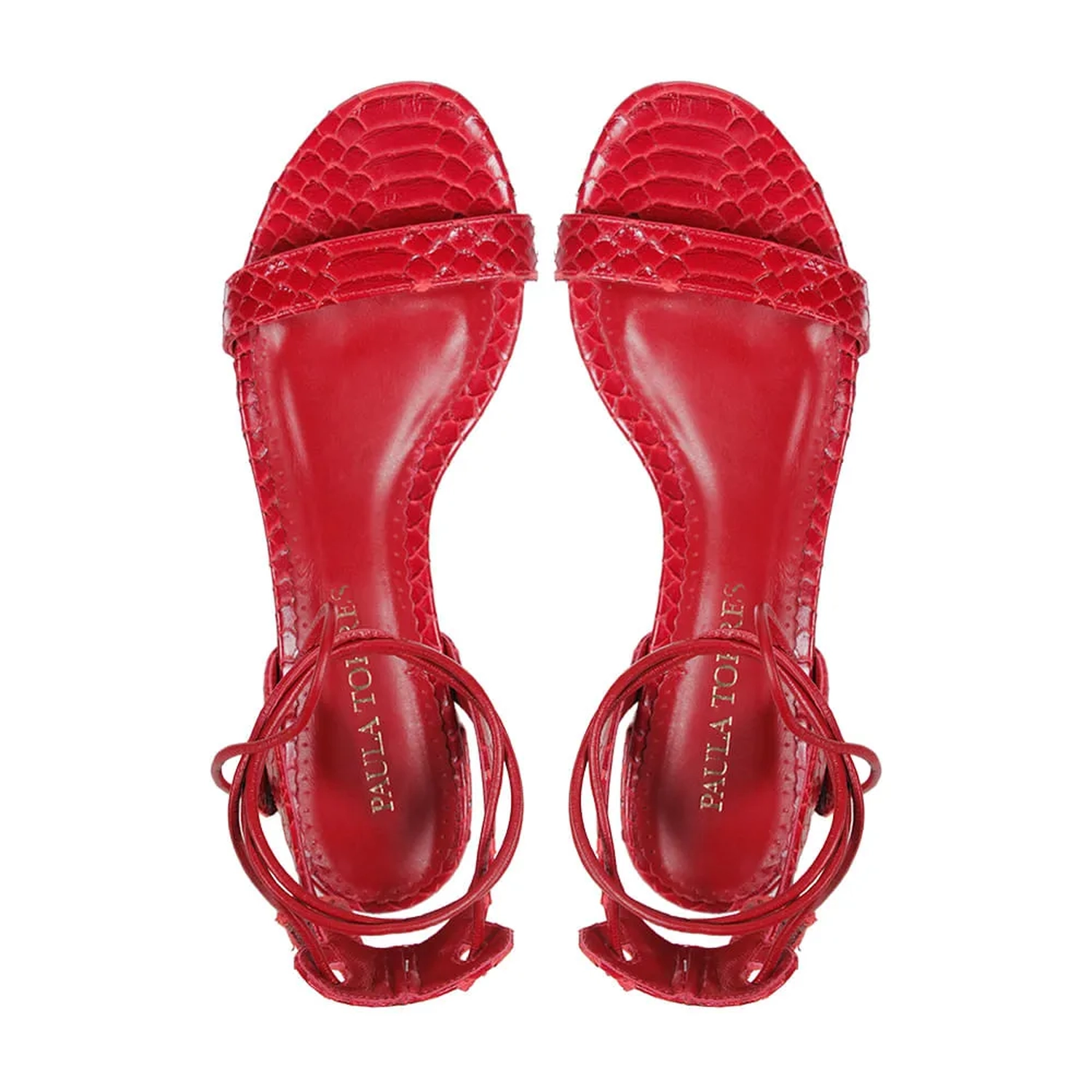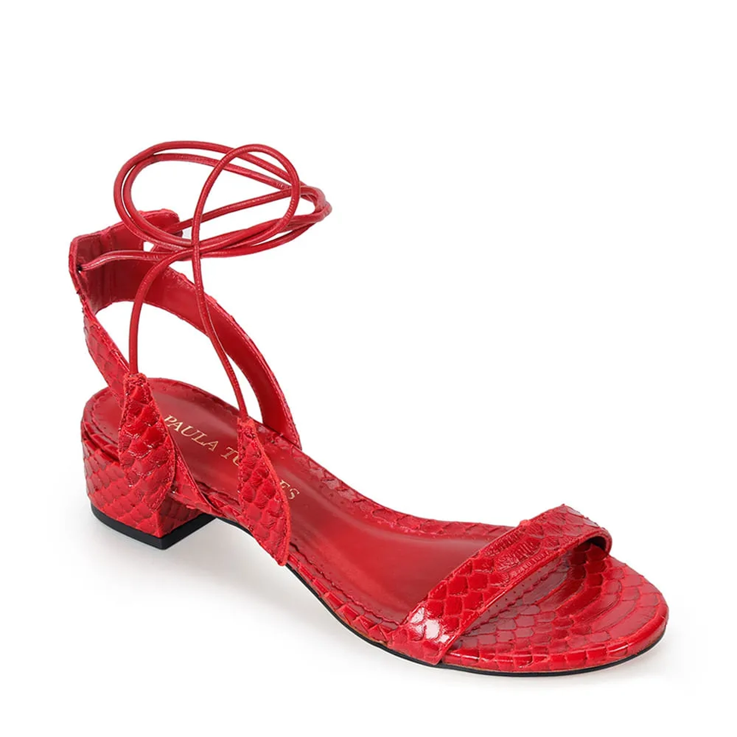 A Sandália Paula é confeccionada em couro com textura filetada e conta com acabamento envernizado conferindo sofisticação à peça. Sua modelagem clássica possui o bico levemente arredondado e salto bloco. O modelo é finalizado através de fechamento com amarração no tornozelo e sua ponteira em forma de folha dando romantismo a peça.