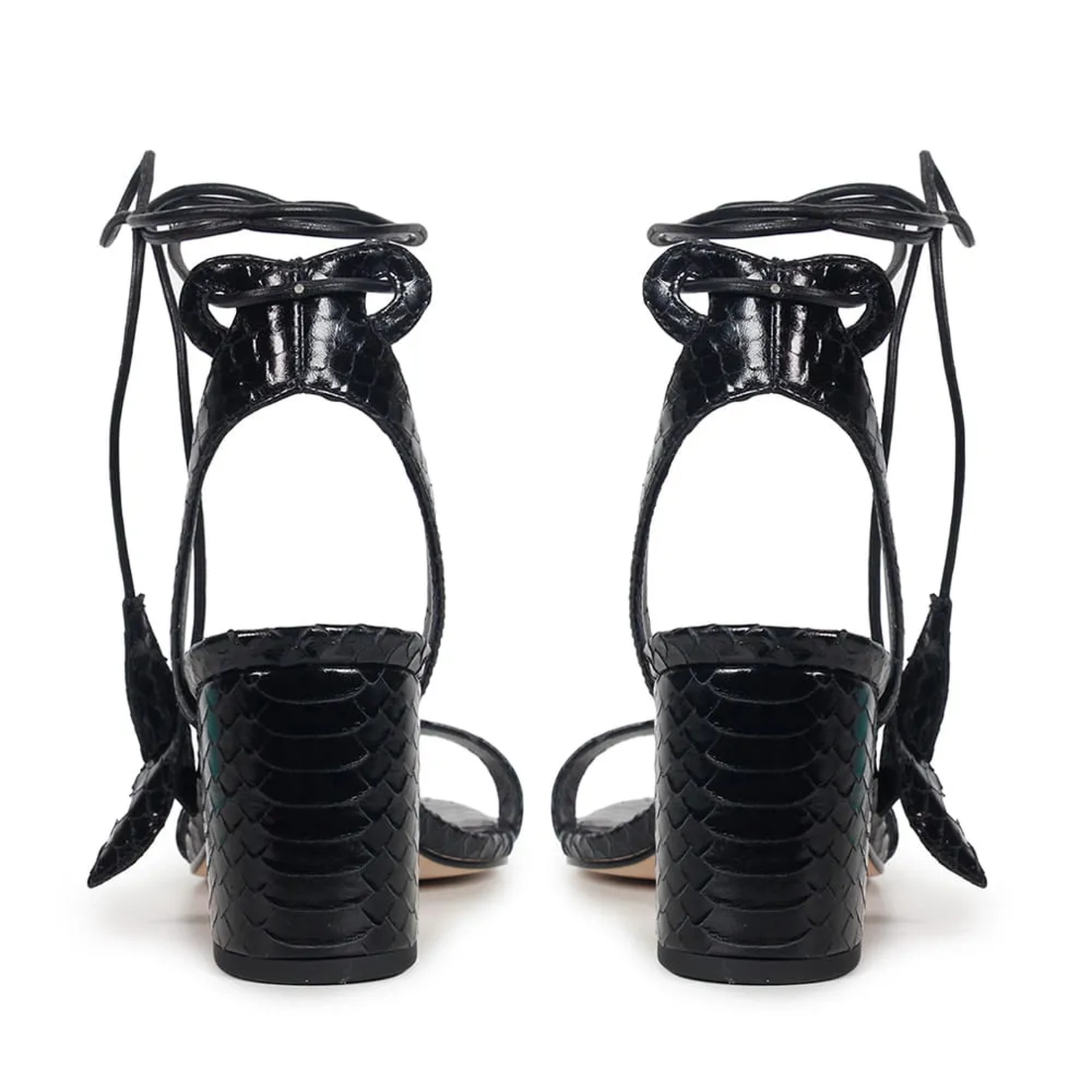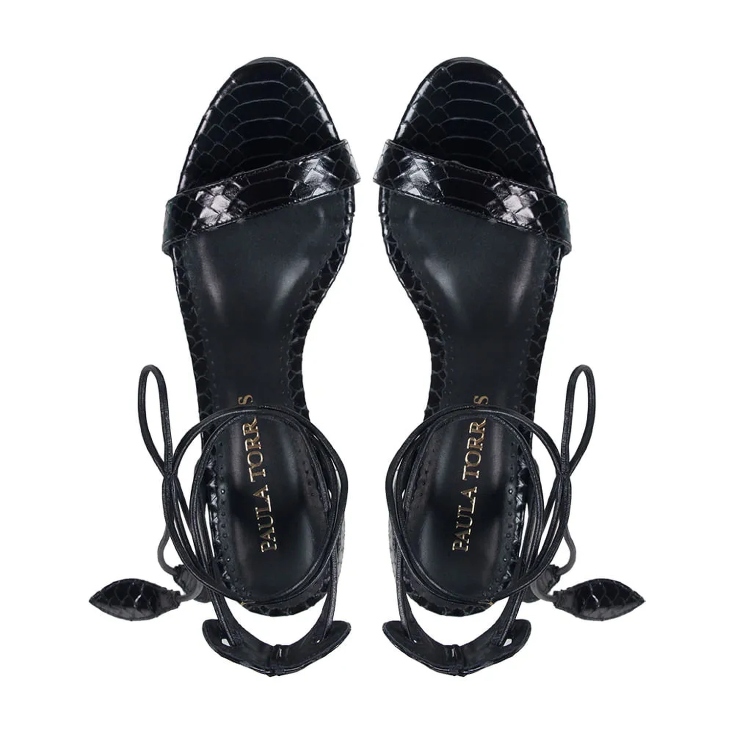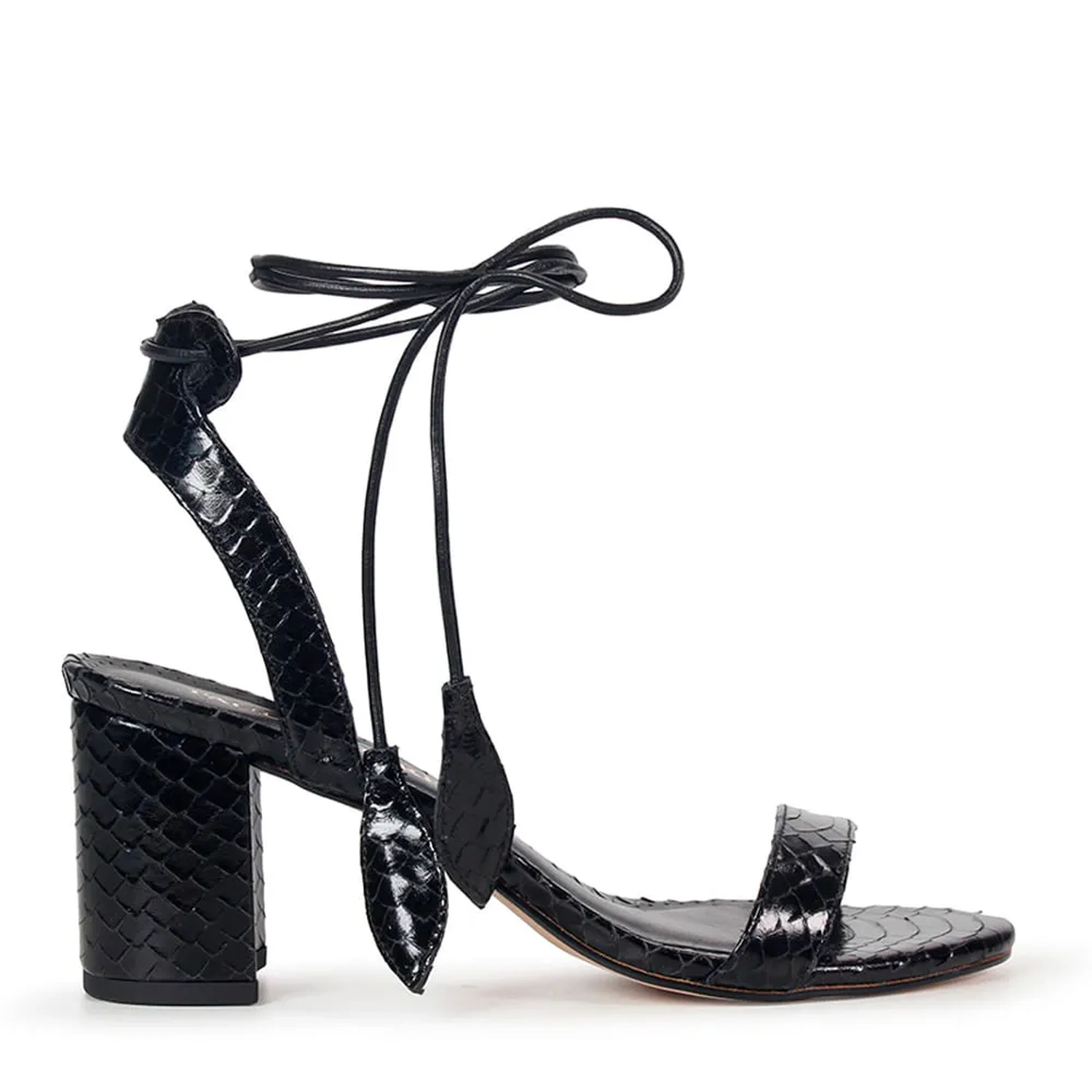 A Sandália Paula é confeccionada em couro com textura filetada e conta com acabamento envernizado conferindo sofisticação à peça. Sua modelagem clássica possui o bico levemente arredondado e salto bloco. O modelo é finalizado através de fechamento com amarração no tornozelo e sua ponteira em forma de folha dando romantismo a peça.