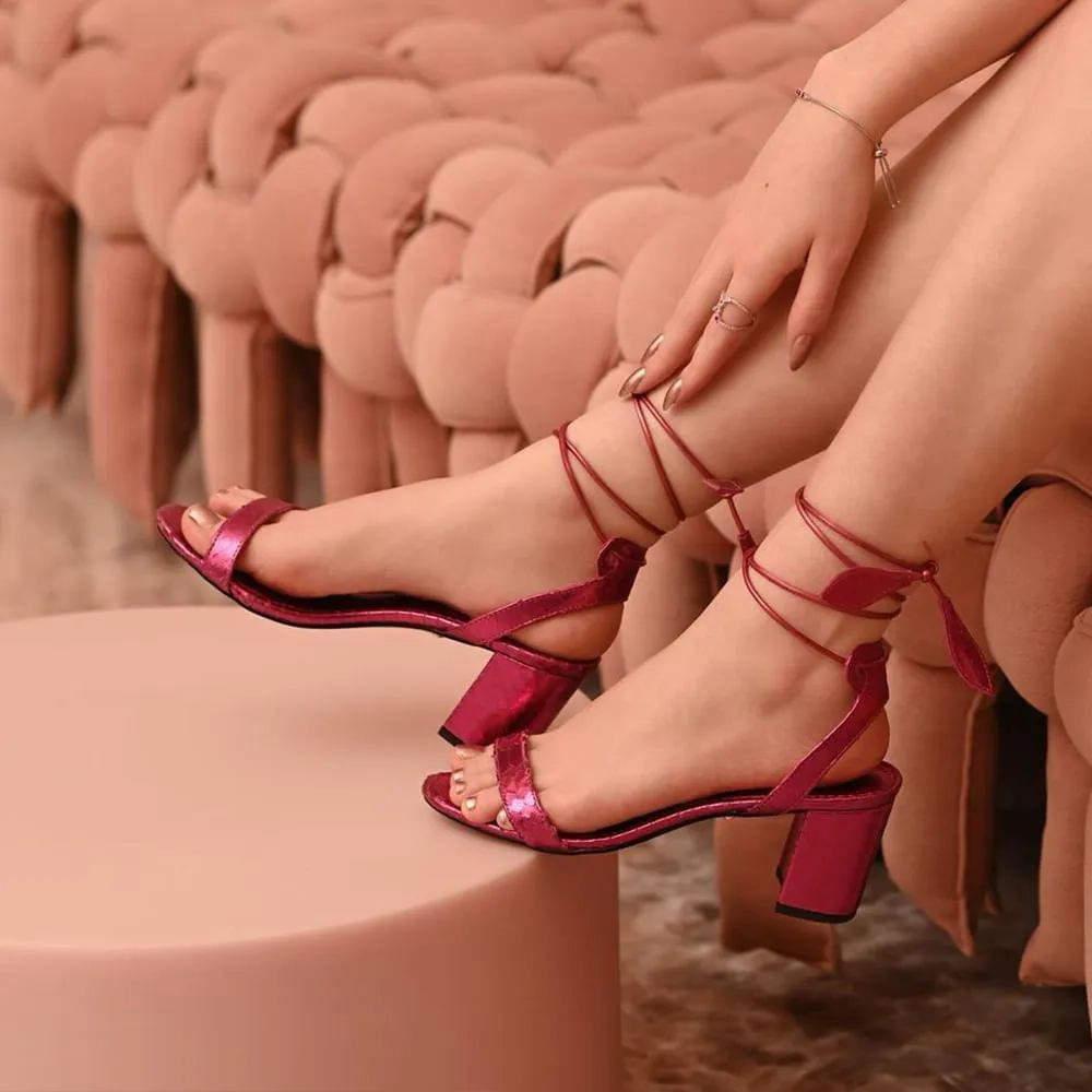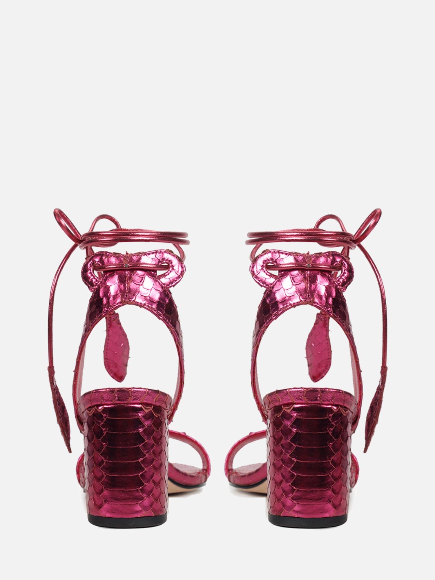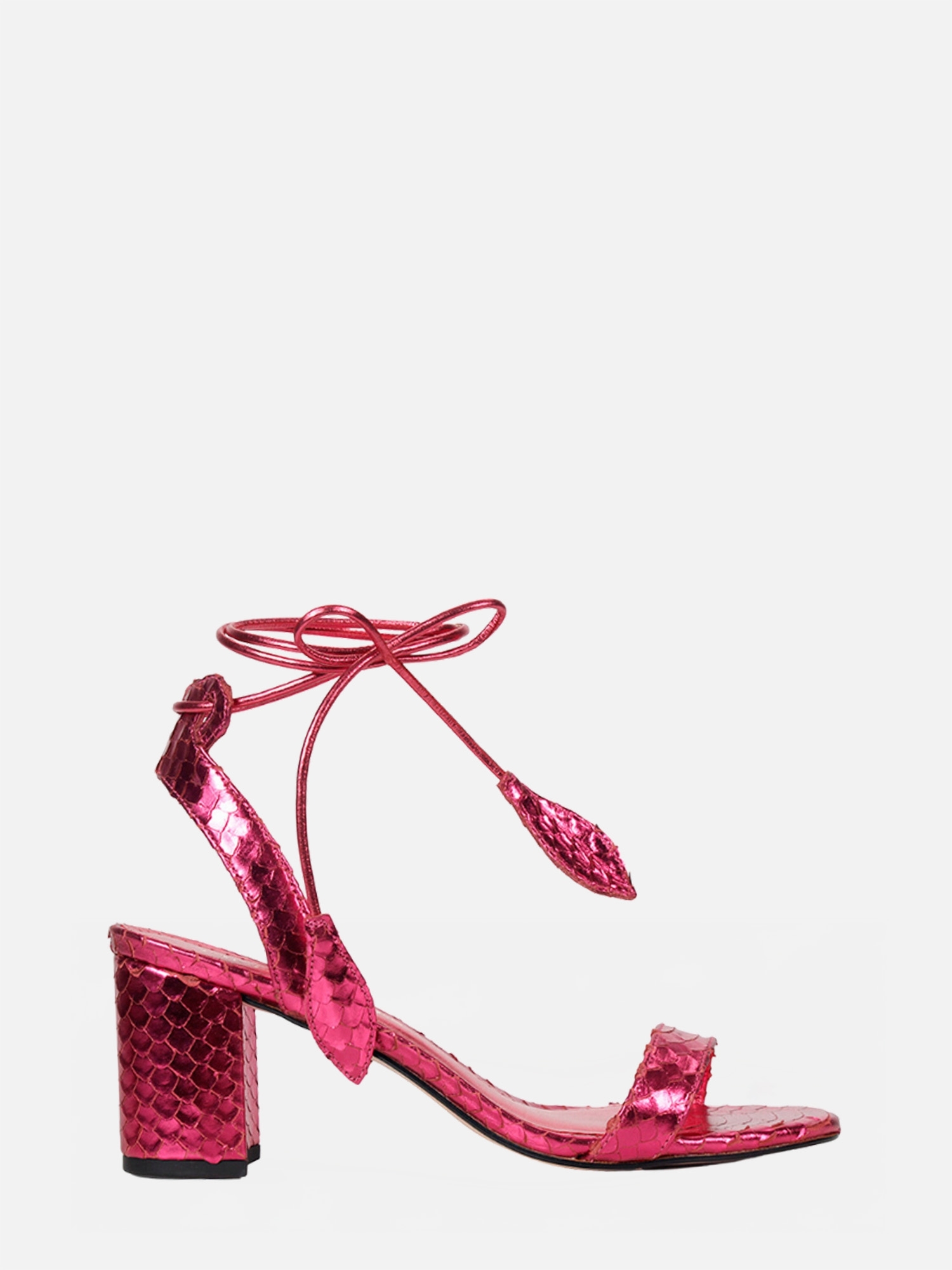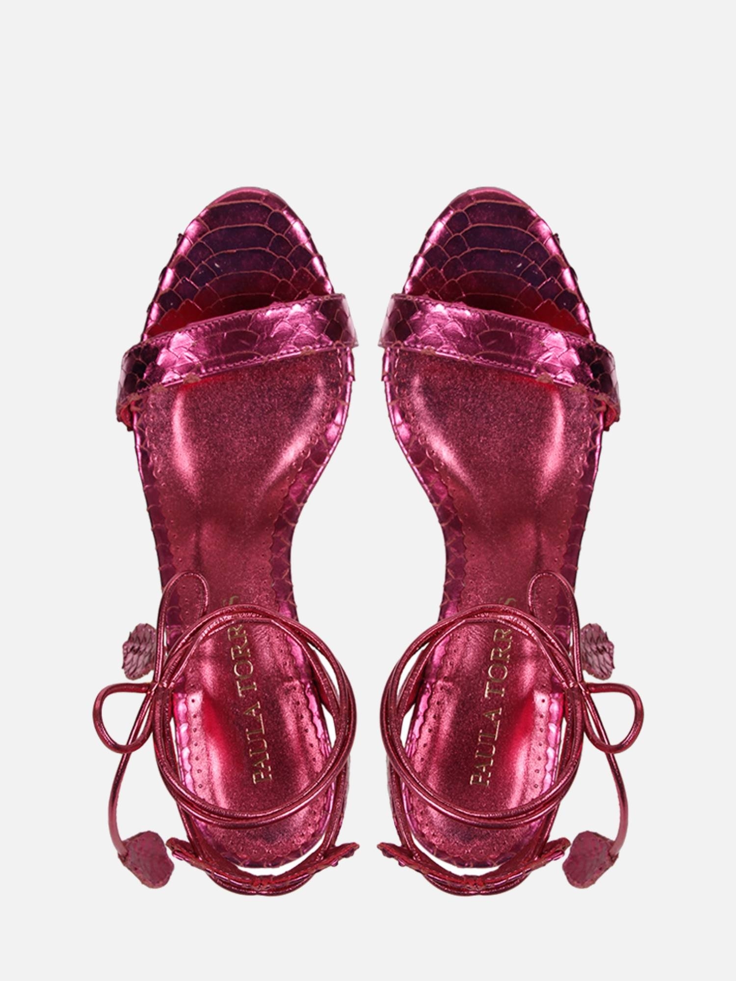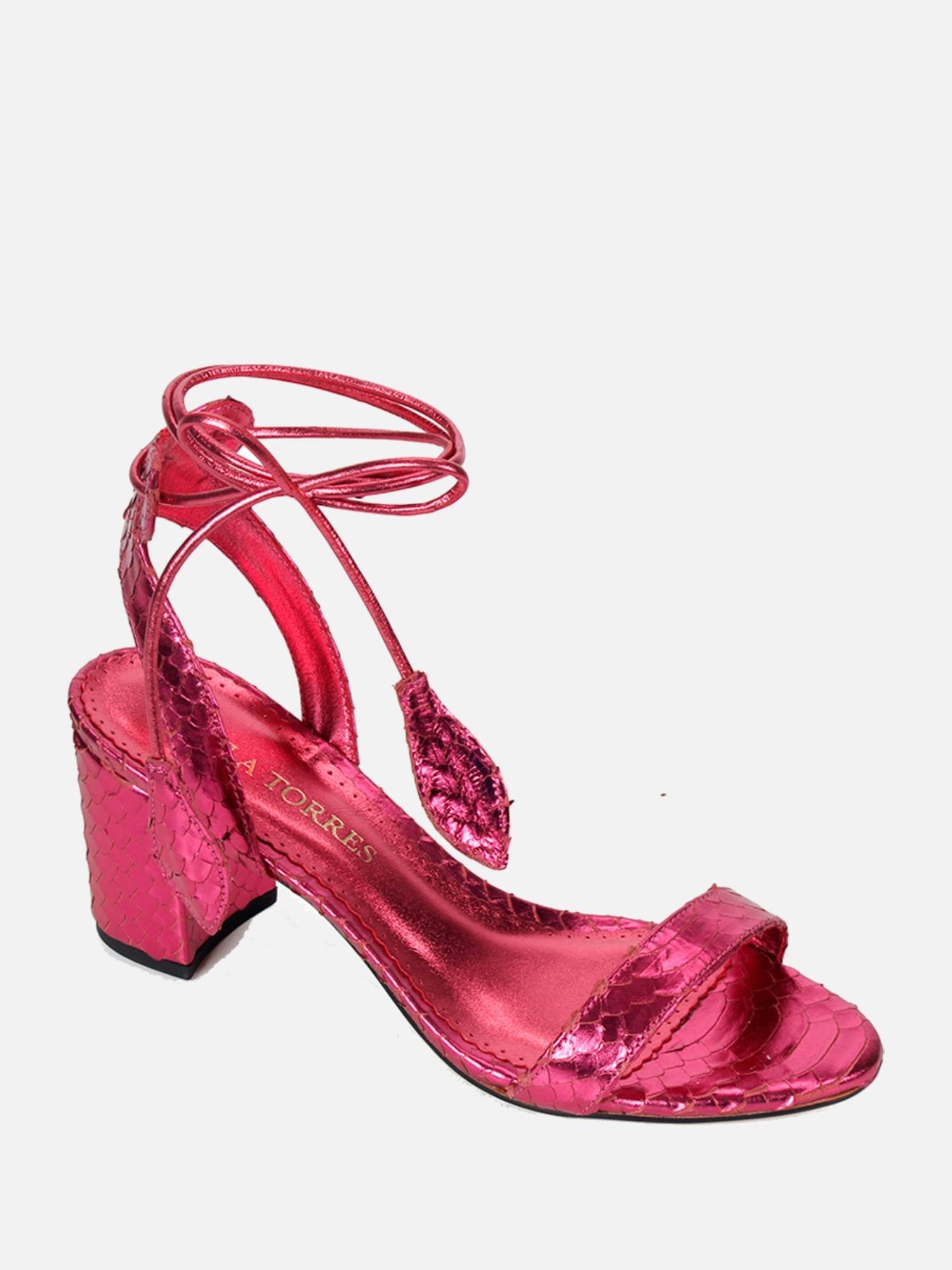 A Sandália Paula é confeccionada em couro com textura filetada e conta com acabamento metalizado conferindo sofisticação à peça. Sua modelagem clássica possui o bico levemente arredondado e salto bloco. O modelo é finalizado através de fechamento com amarração no tornozelo e sua ponteira em forma de folha dando romantismo a peça.