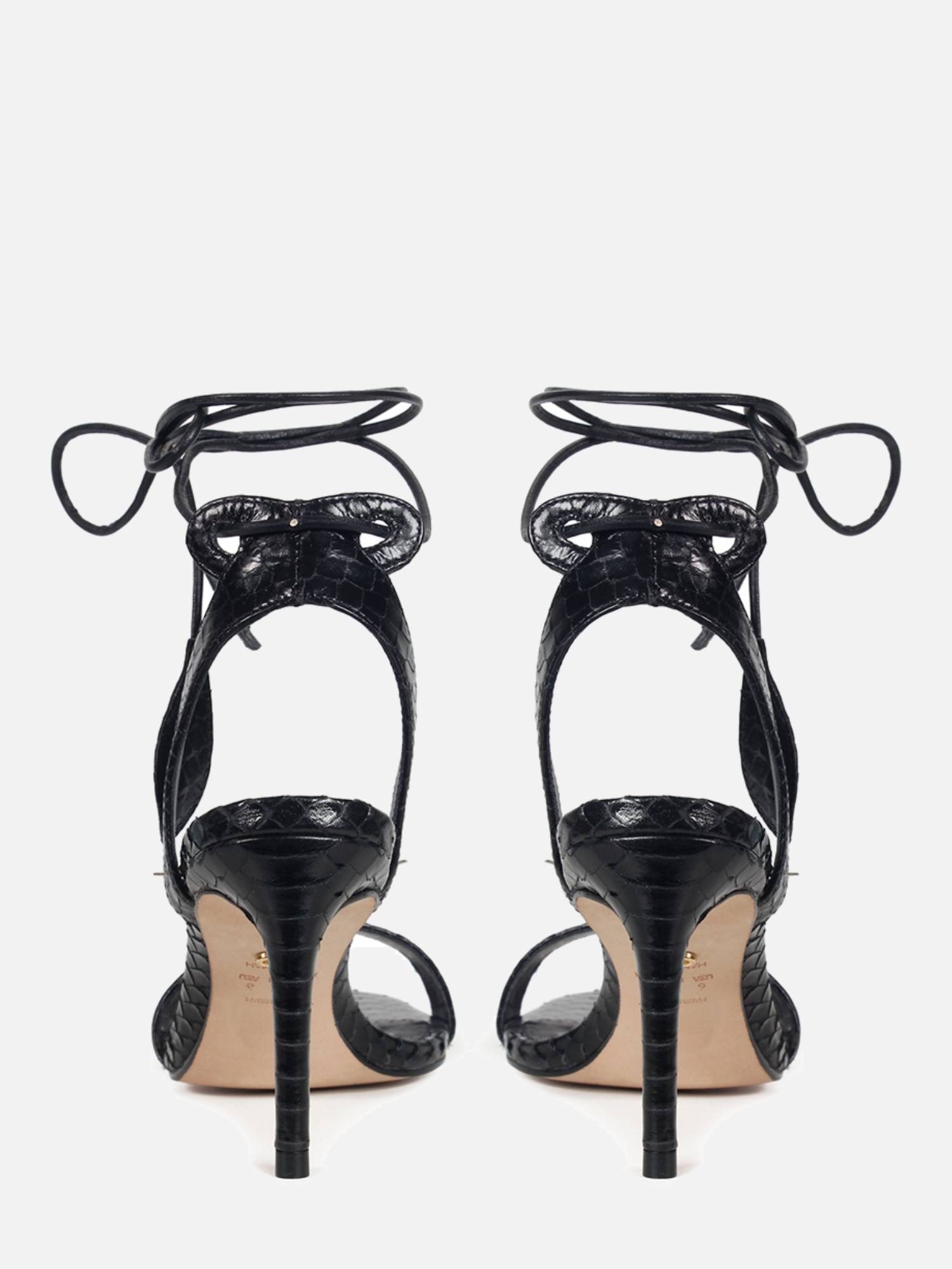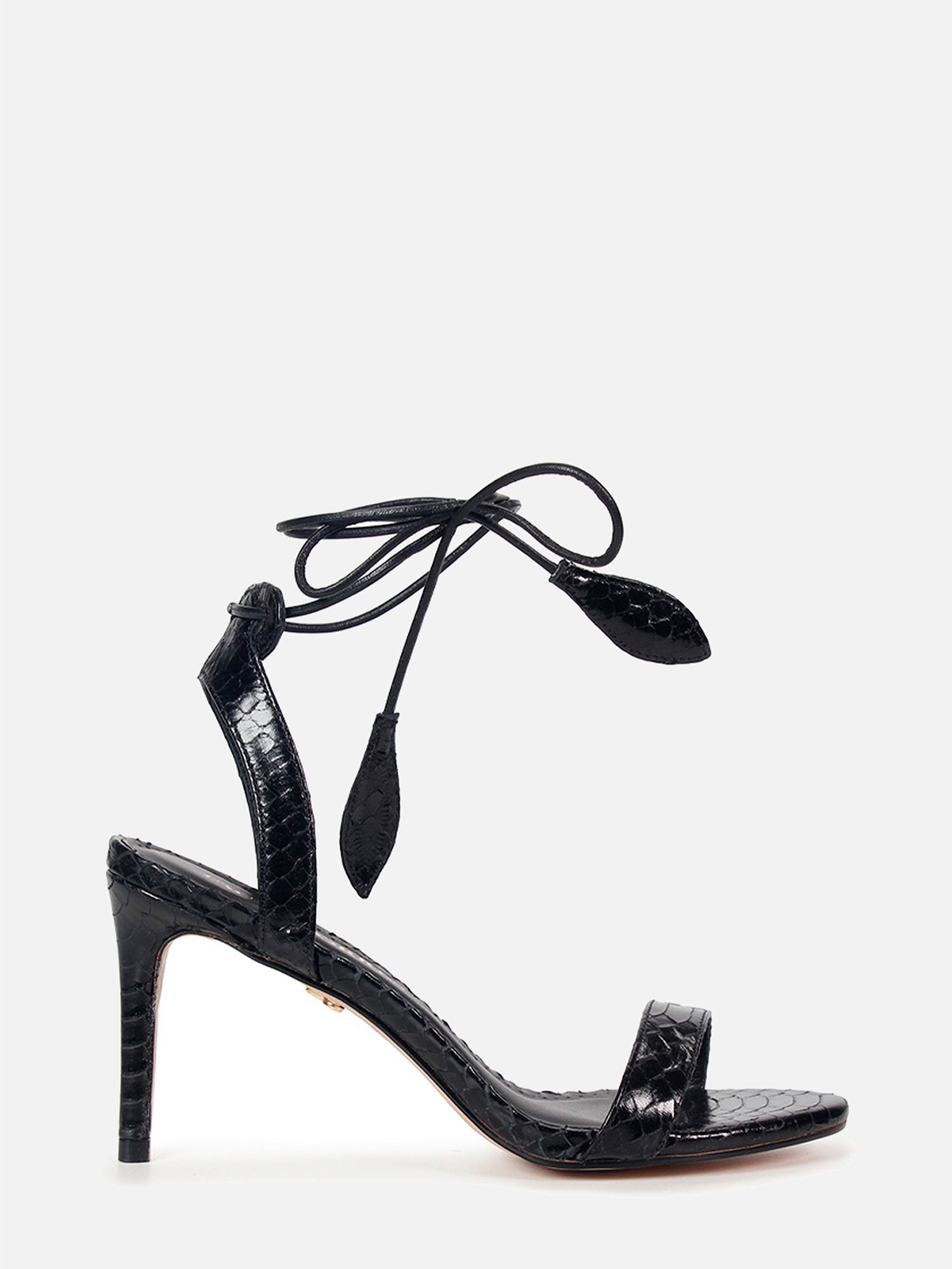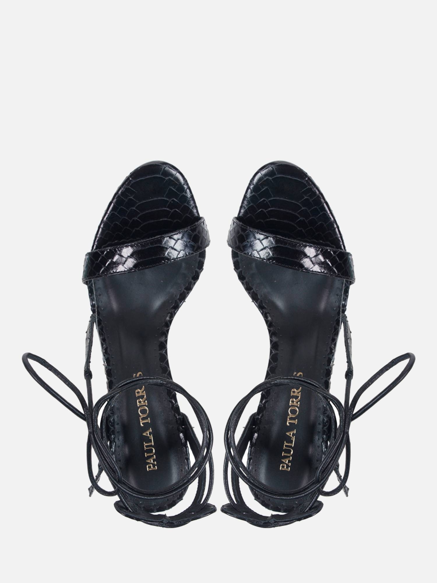 A Sandália Paula é confeccionada em couro com textura filetada e conta com acabamento envernizado conferindo sofisticação à peça. Sua modelagem clássica possui o bico levemente arredondado e salto fino. O modelo é finalizado através de fechamento com amarração no tornozelo e sua ponteira em forma de folha dando romantismo a peça.