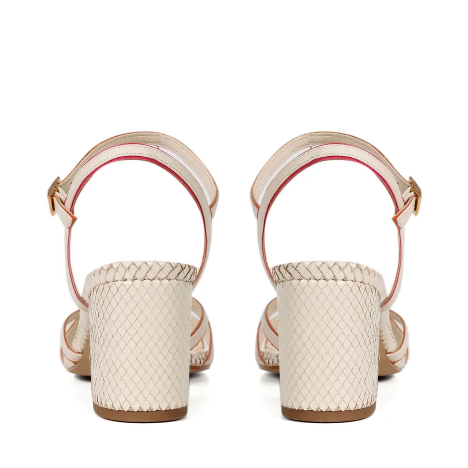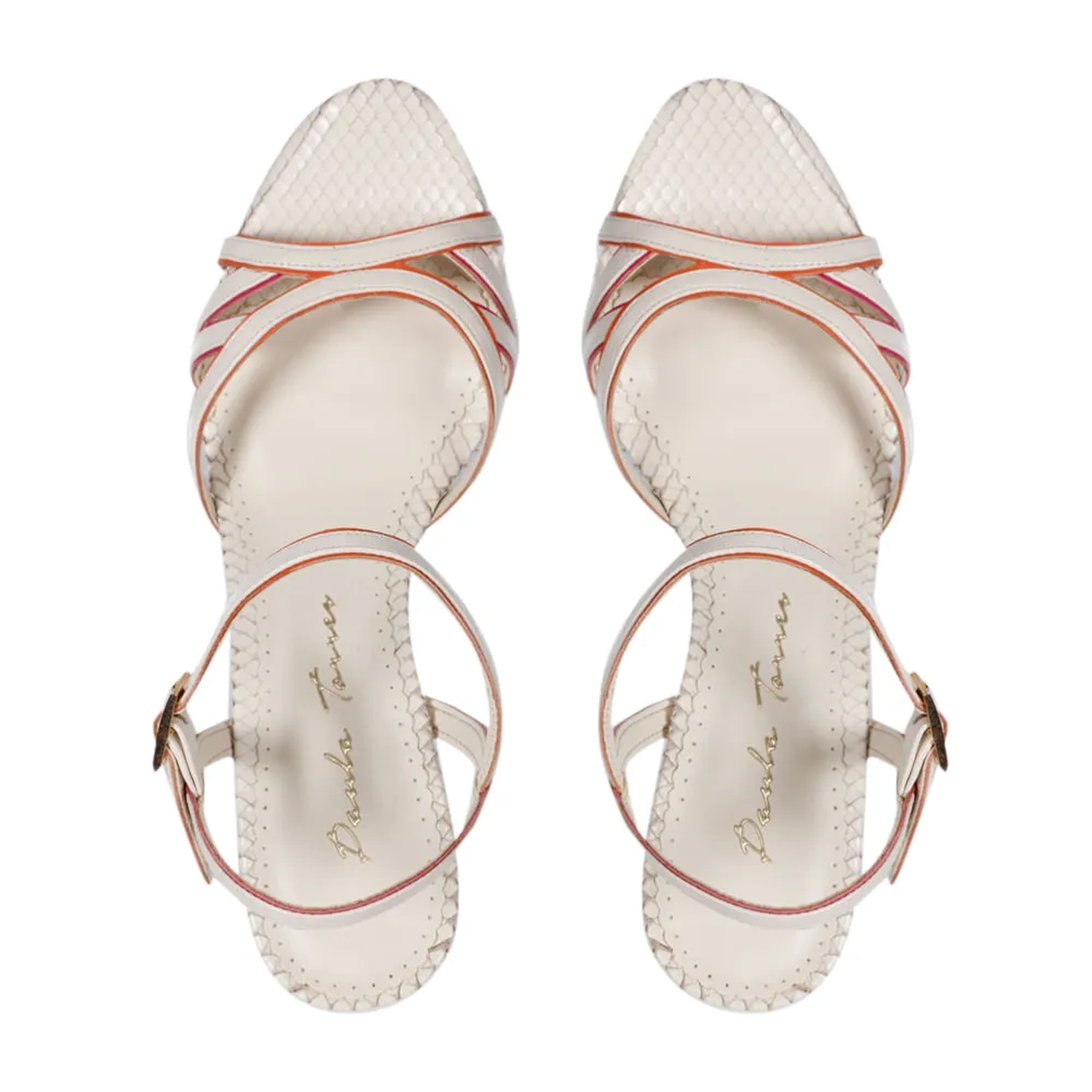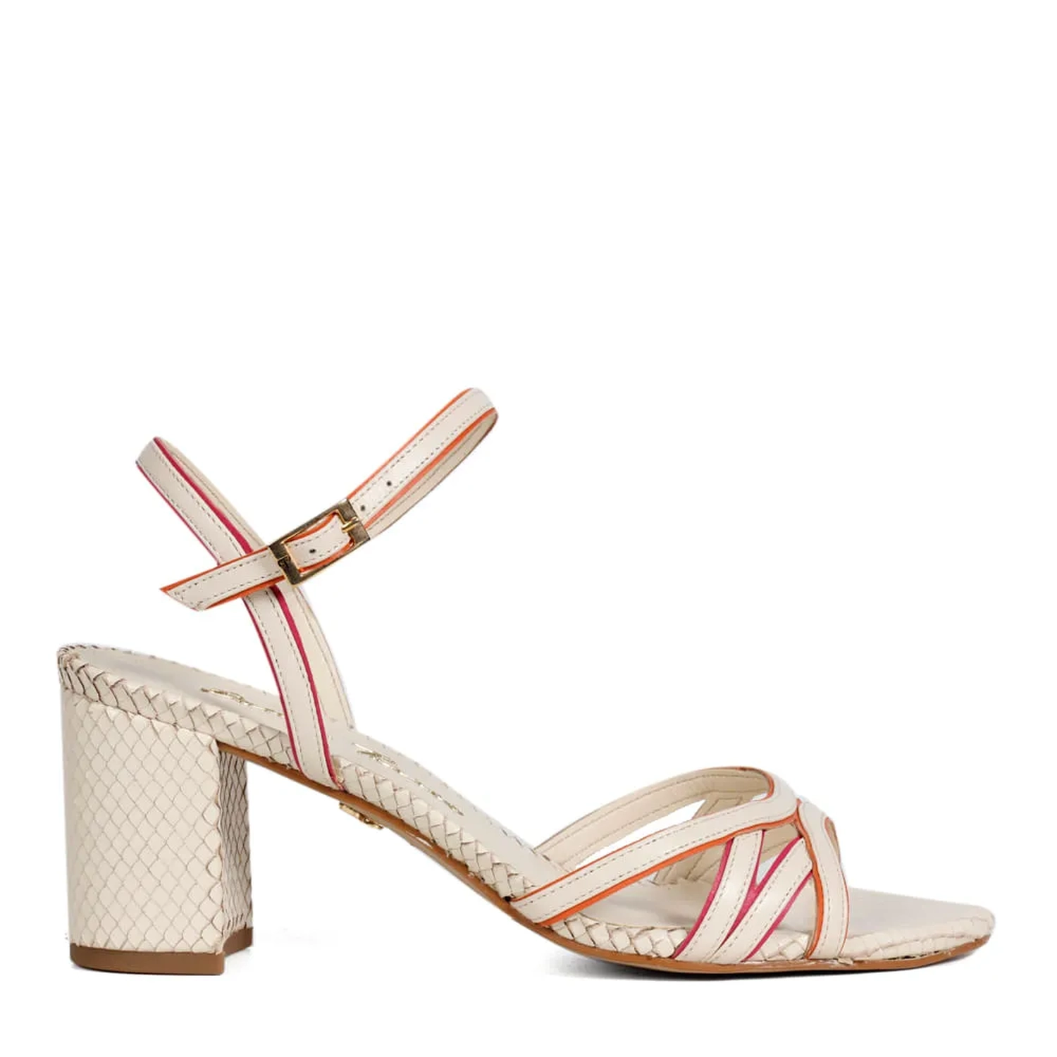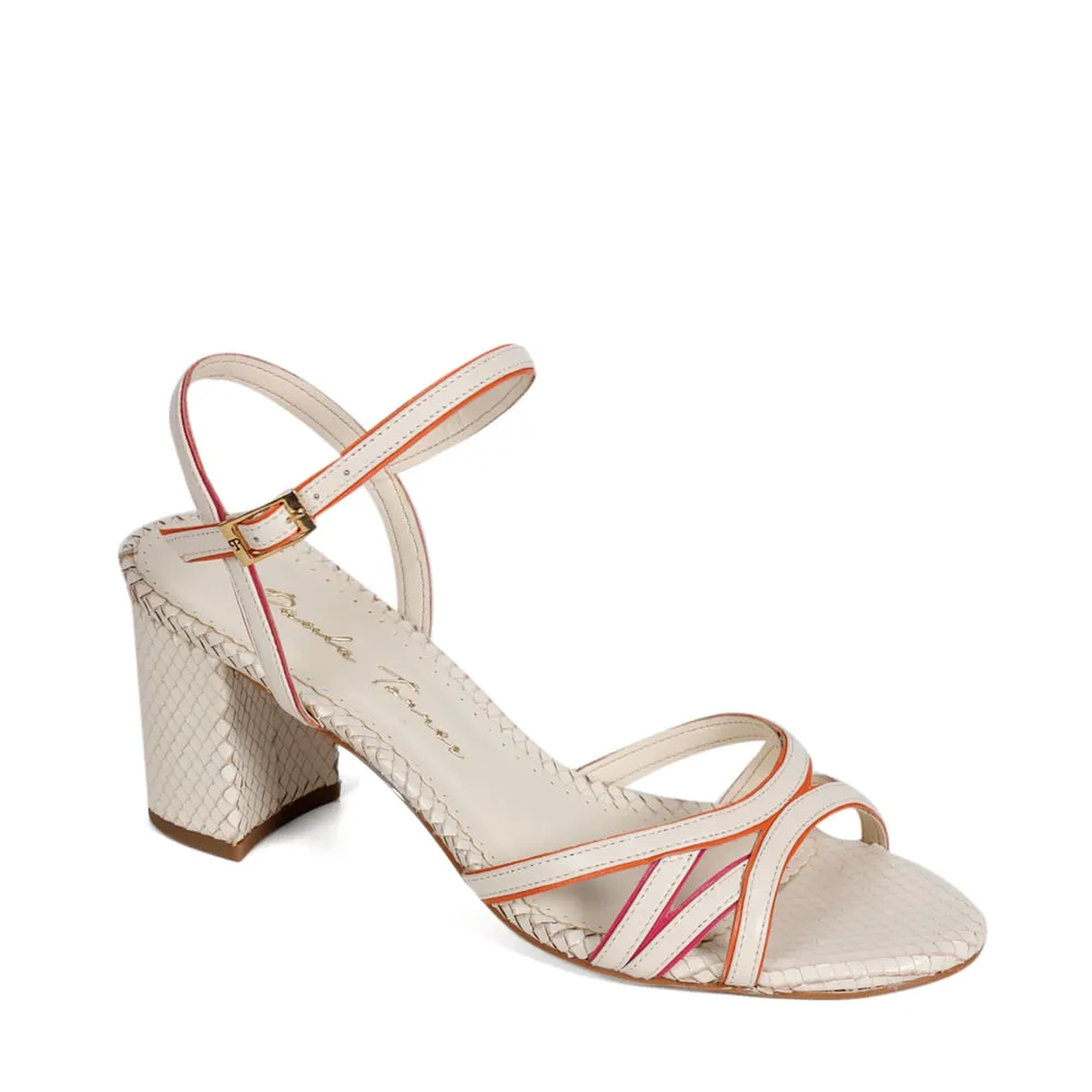 A Sandália Pietra é confeccionada em couro mini lezard. De modelagem clássica, a peça possui bico arredondado e tiras finas cruzadas com borda branca no cabedal e na tornozeleira. O fechamento lateral é realizado por fivela. O salto bloco traz mais estabilidade e contrasta com as finas tiras de couro. Modelo atemporal que possui a técnica handmade Paula Torres.