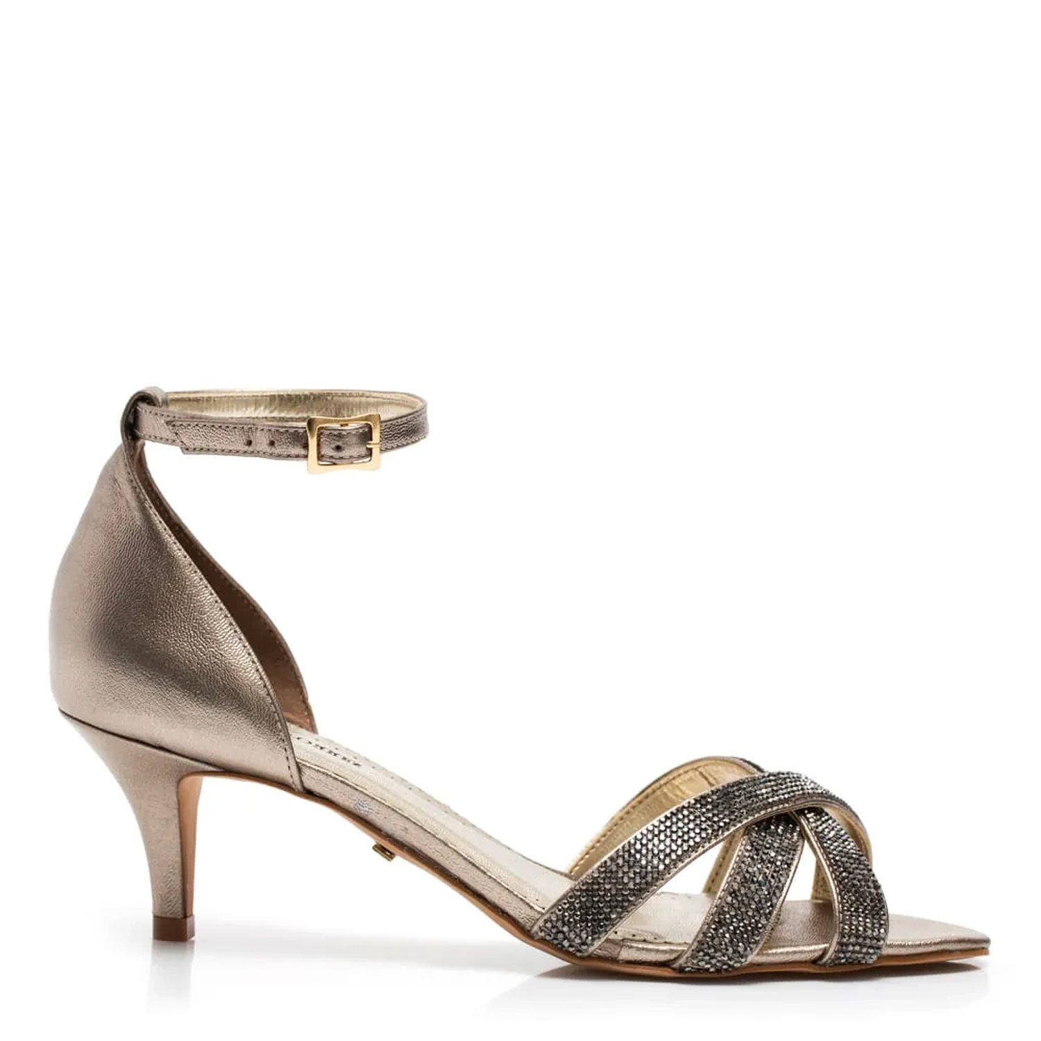 Sandália de couro metalizado com aplicação de strass nas tiras frontais, perfeita para festas à noite como casamentos, formaturas ou até um jantar especial. A cor é neutra e permite combinar com vários tons de vestuário. O tamanho do salto é perfeito para curtir toda a festa sem se incomodar, com o máximo conforto que nossos sapatos proporcionam.