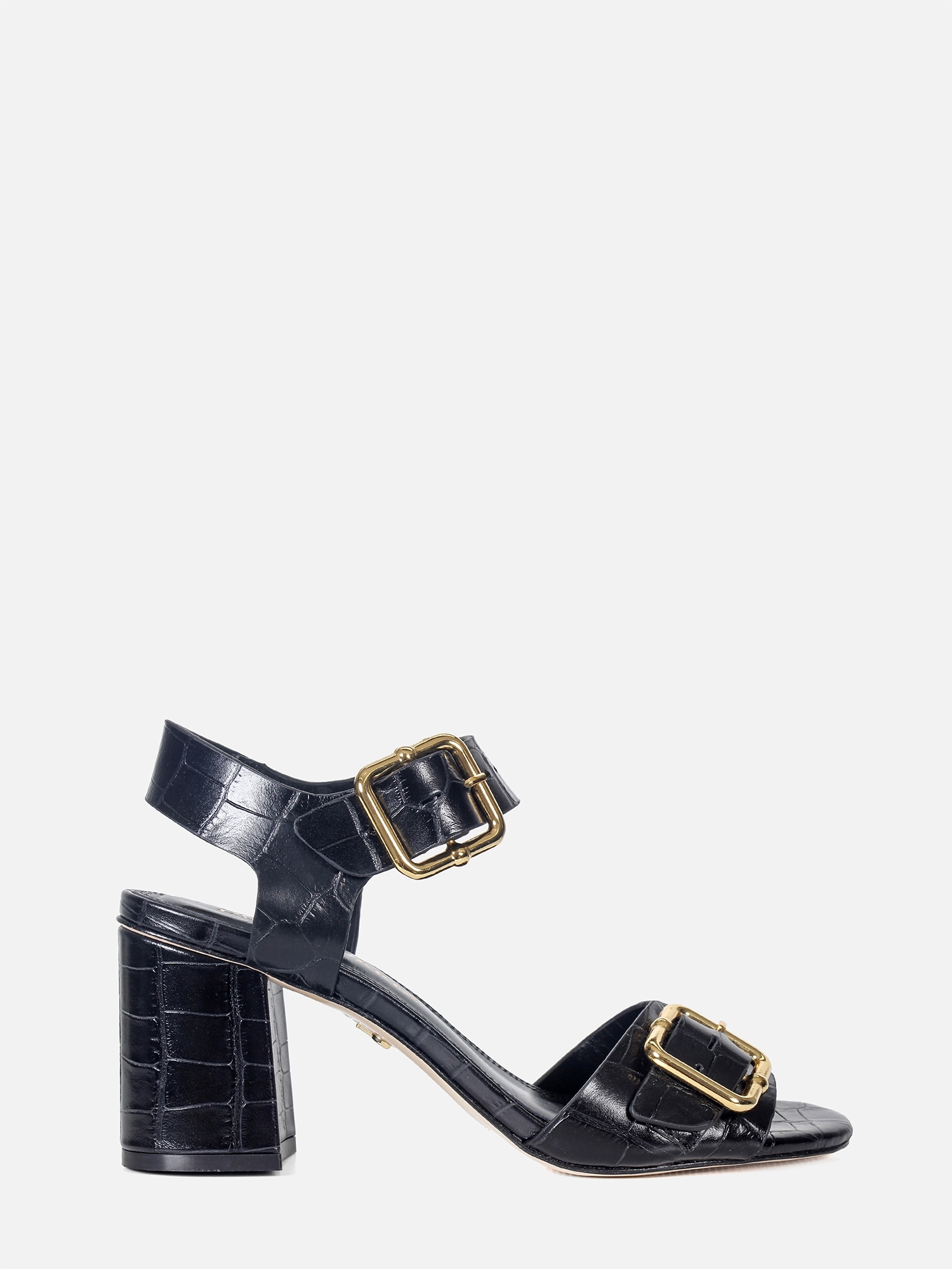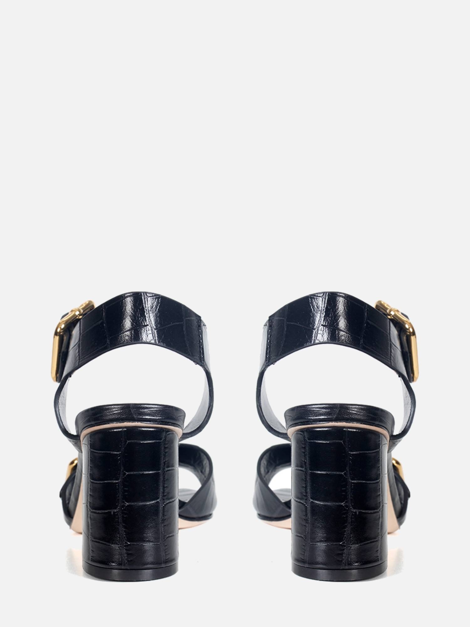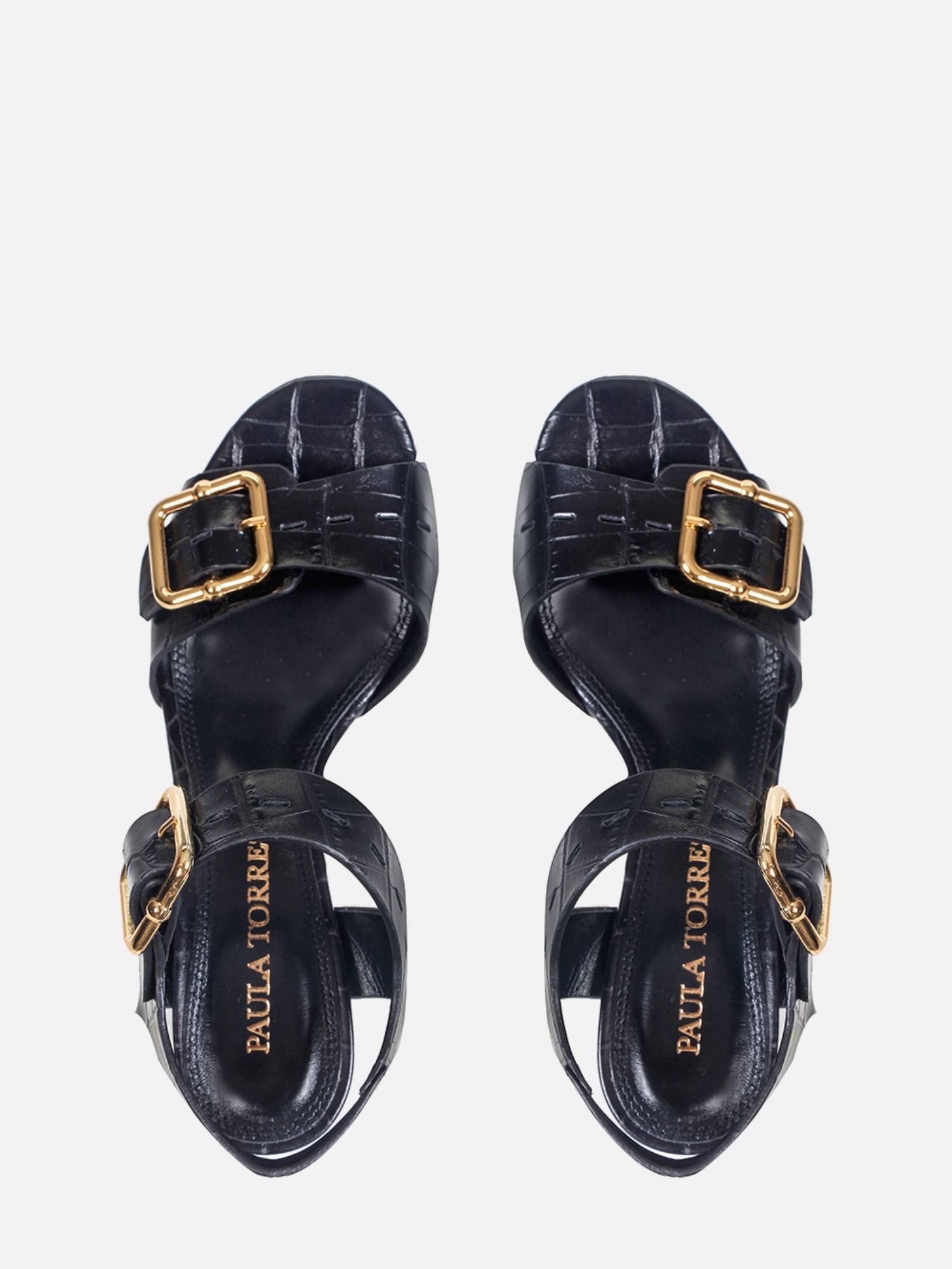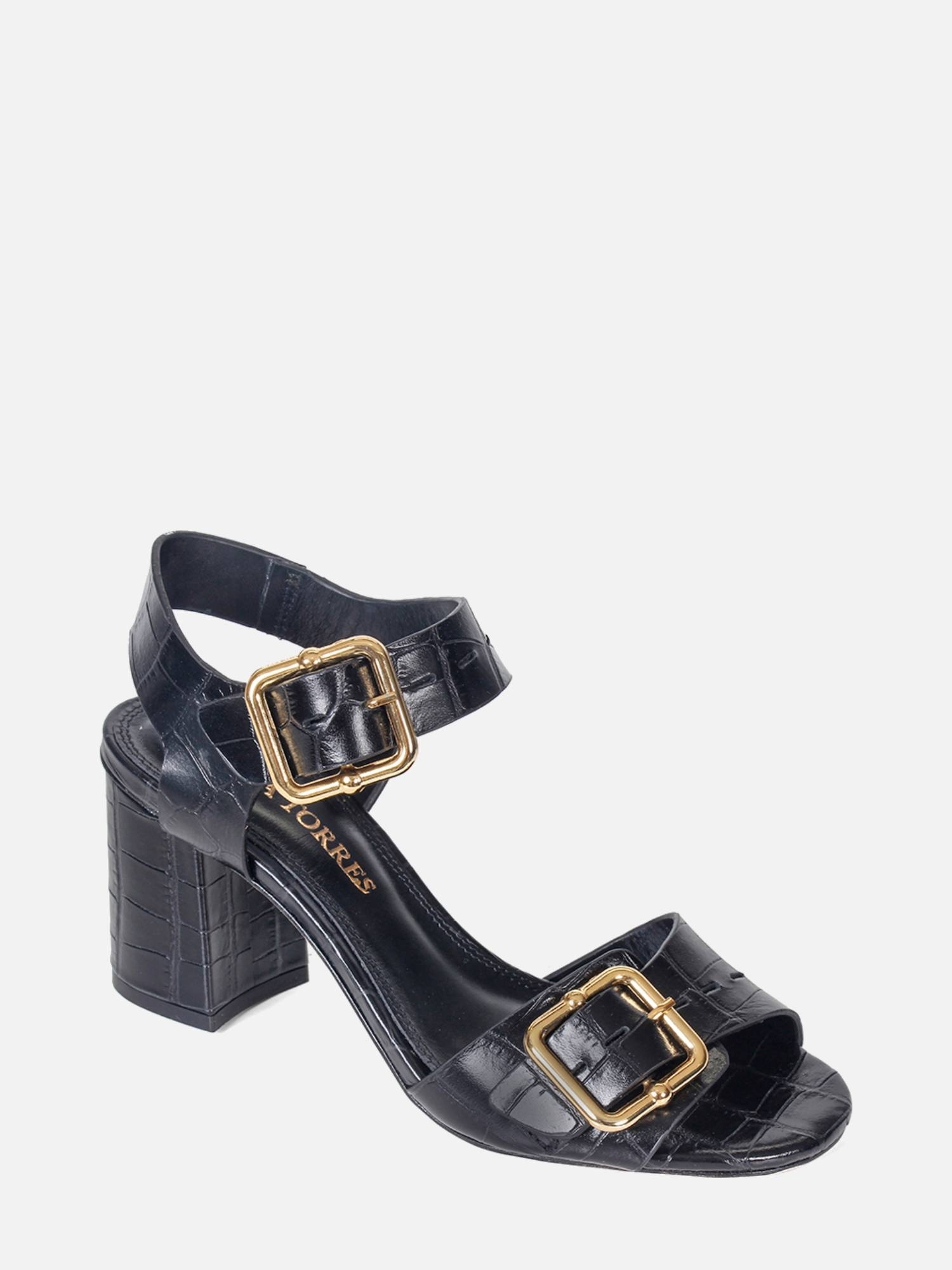 A Sandália Suri é confeccionada em couro com textura croco, que combina sofisticação e estilo. O modelo possui duas tiras largas, ajustáveis por uma elegante fivela metalizada dourada na lateral. O solado em couro oferece conforto e durabilidade, tornando a peça perfeita para diversas ocasiões.