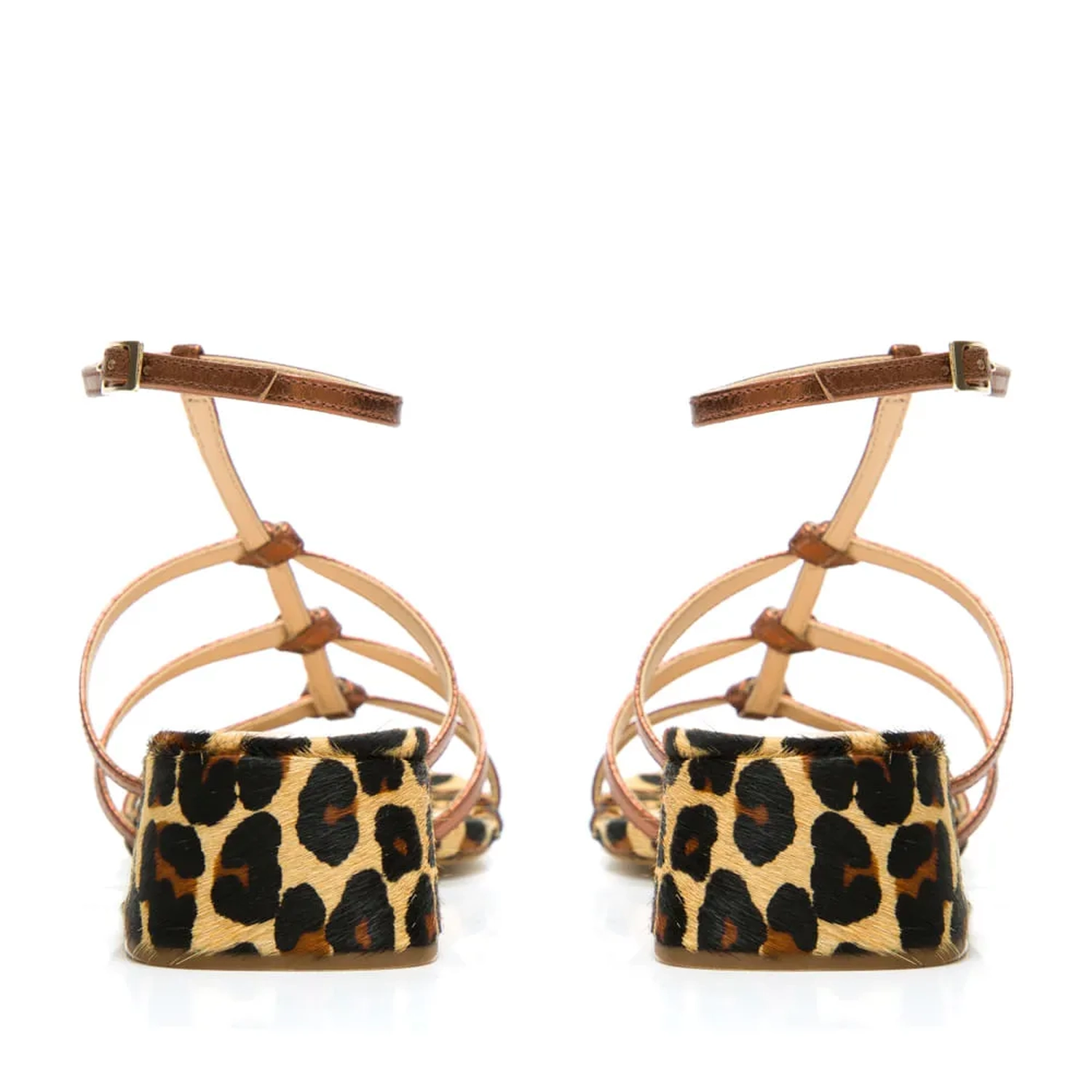 A Sandália Talín é produzida em couro metalizado e pelo com animal print. A peça possui bico quadrado, tiras finas frontais com acabamento pespontado e salto baixo quadrado. O fechamento é feito por fivela no tornozelo ajustável que traz praticidade a peça.