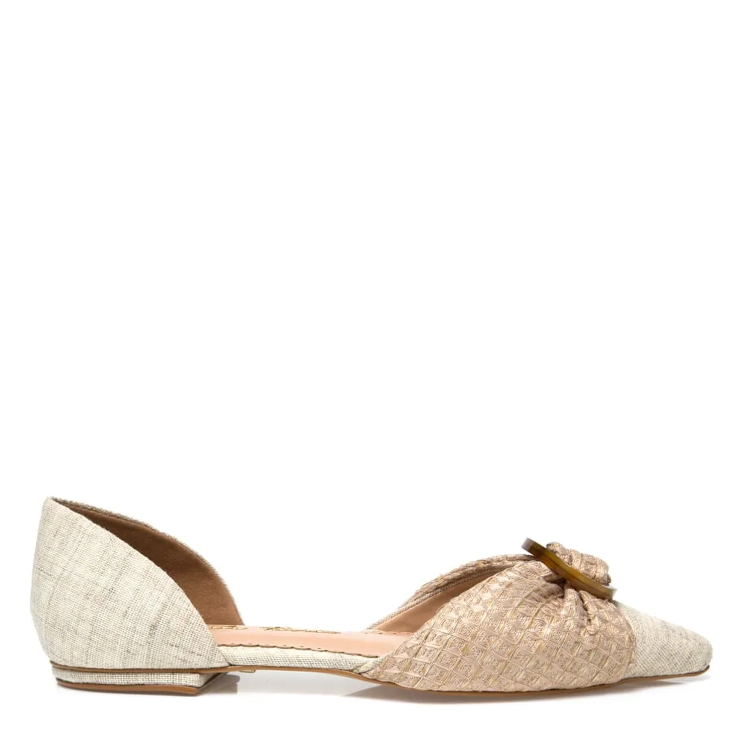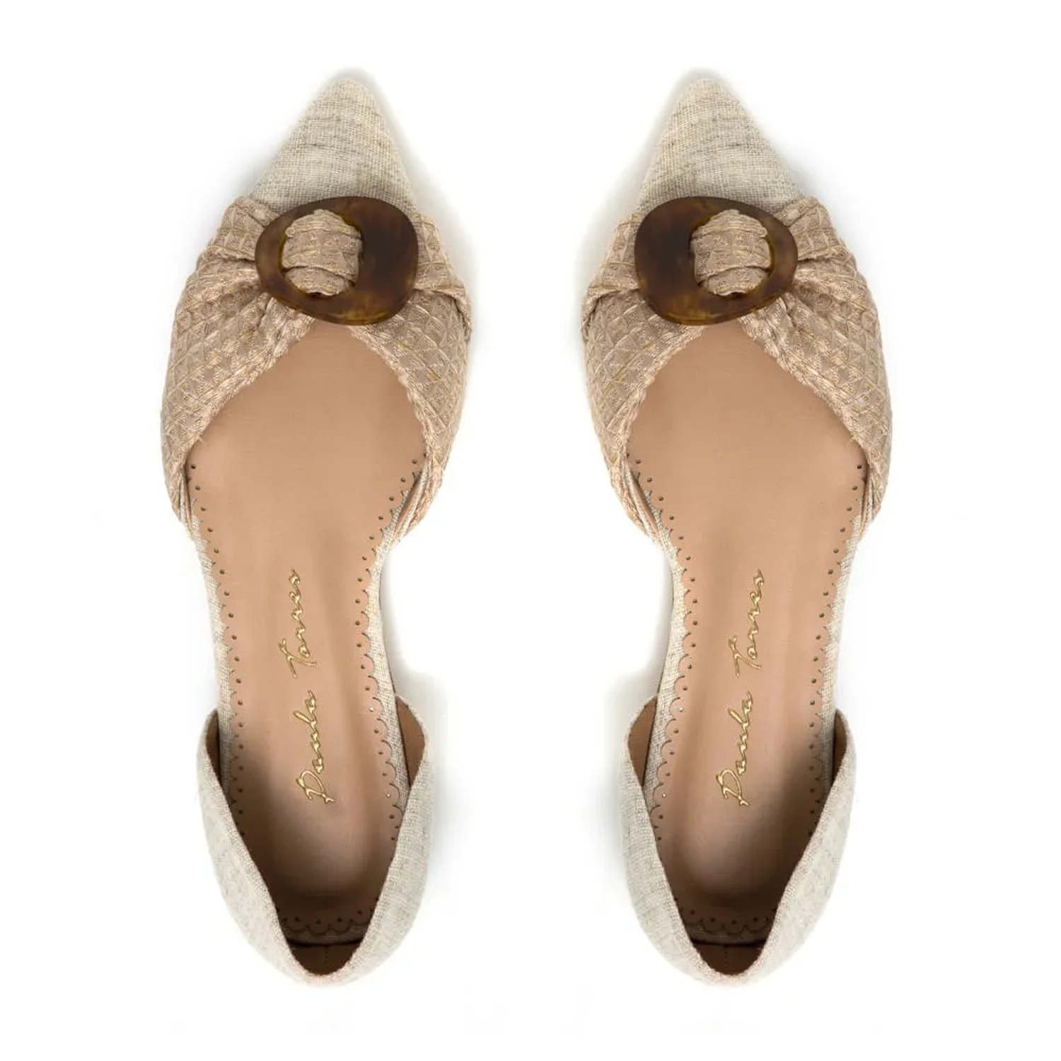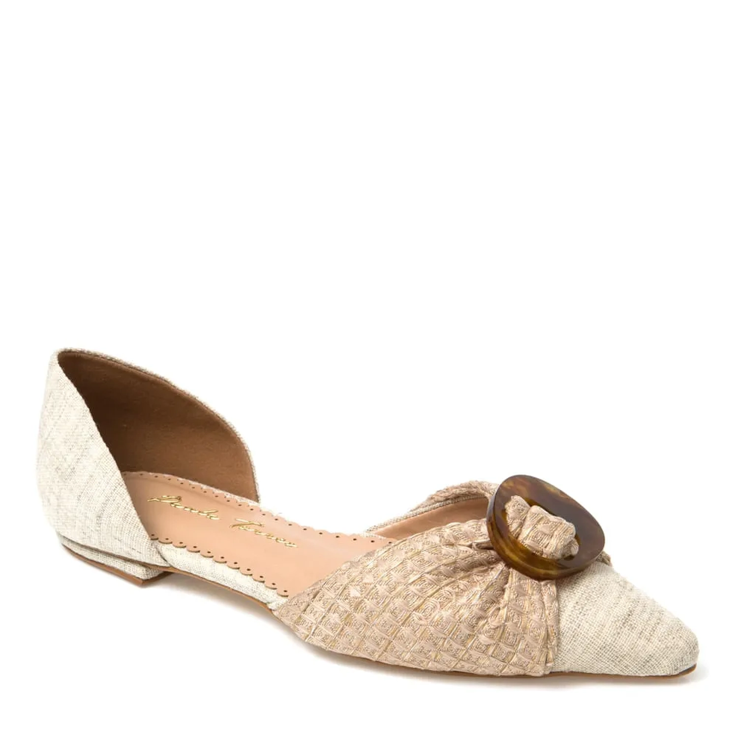 A Sapatilha Alyssa é confeccionada em tecido. Modelagem em bico fino, com o diferencial da aplicação na parte frontal. Completamente Paula Torres, o modelo reforça as origens hand made da marca.