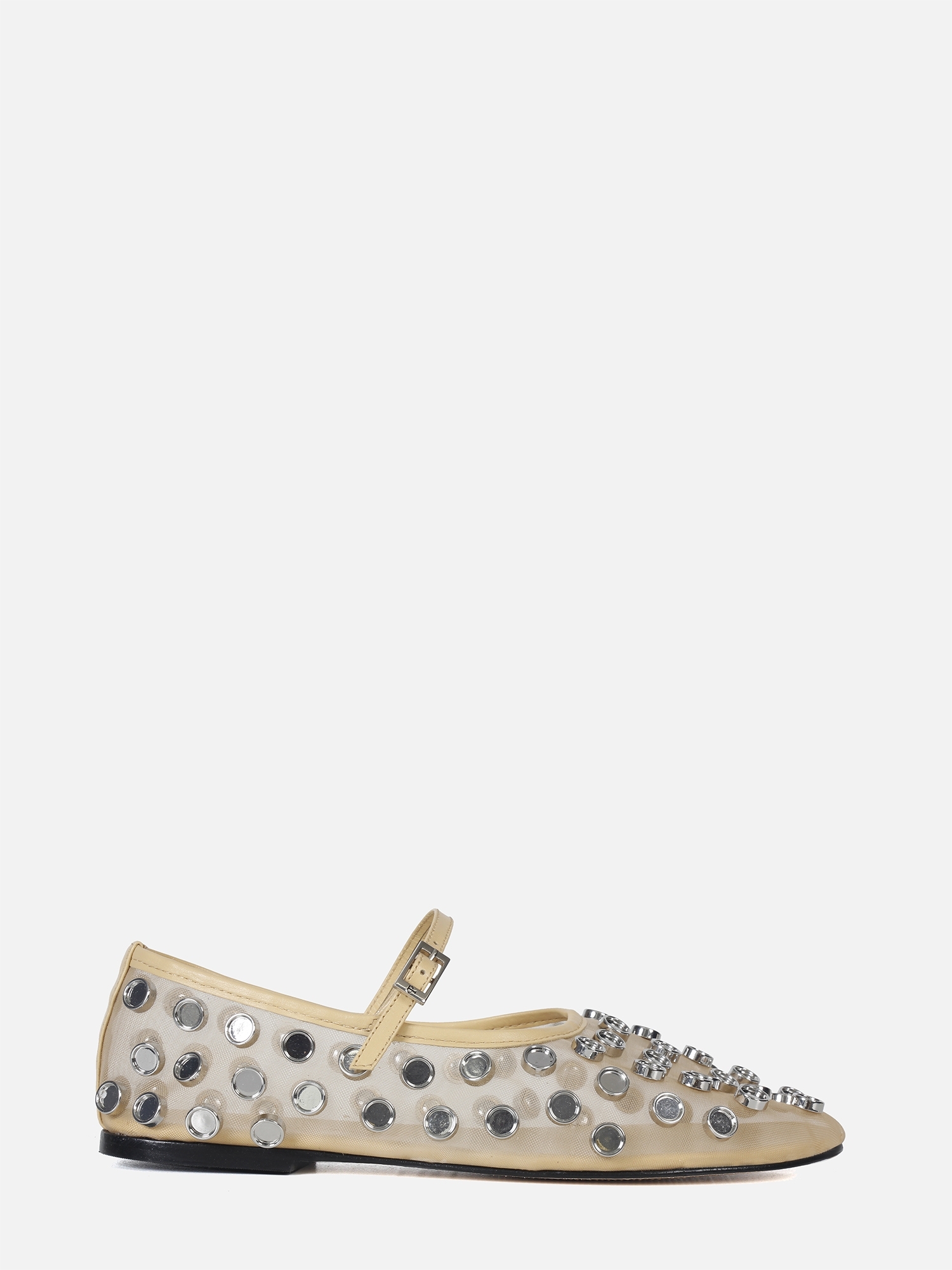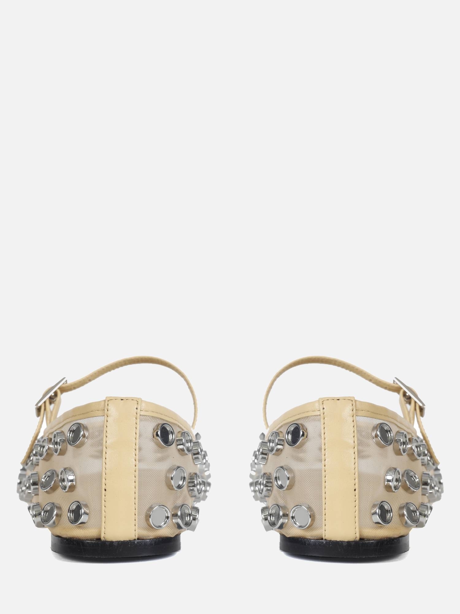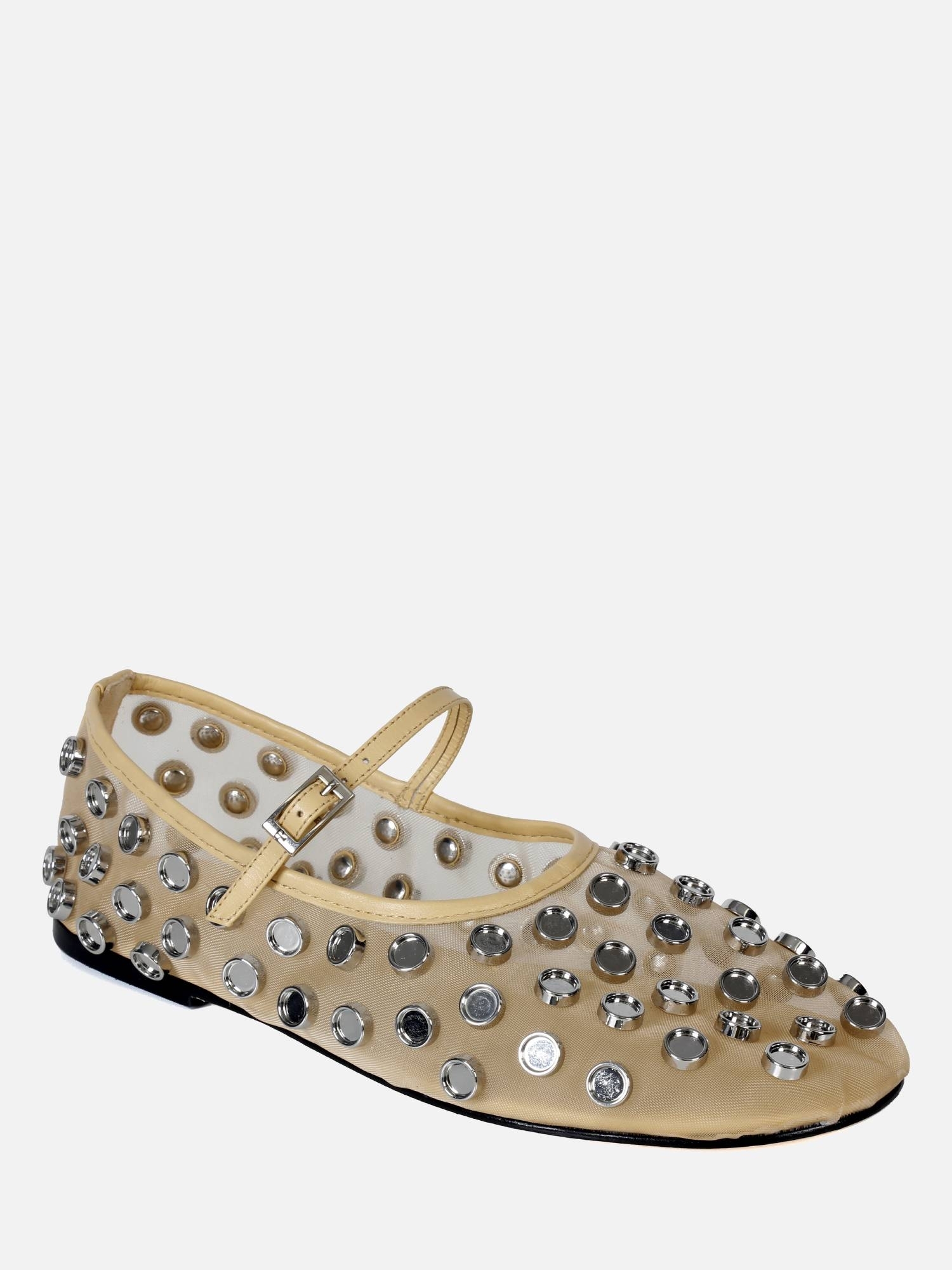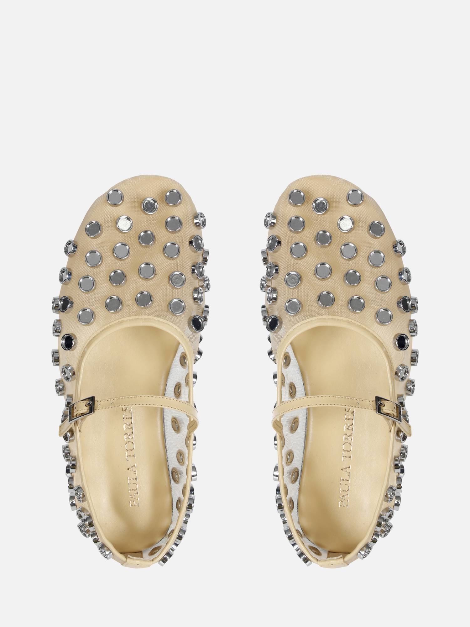 A sapatilha Aurora Tacha é produzida em uma combinação de tela e couro. O modelo possui um bico arredondado e uma tira fina com uma fivela de ajuste sobre o peito do pé. Ao longo de toda a extensão do cabedal, há a aplicação de metais feitos individualmente com um tratamento especial para protegê-los contra a corrosão. A tela do cabedal é finalizada com uma tira de couro, proporcionando maior conforto.