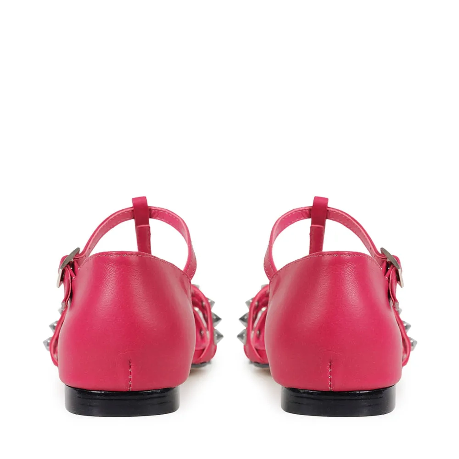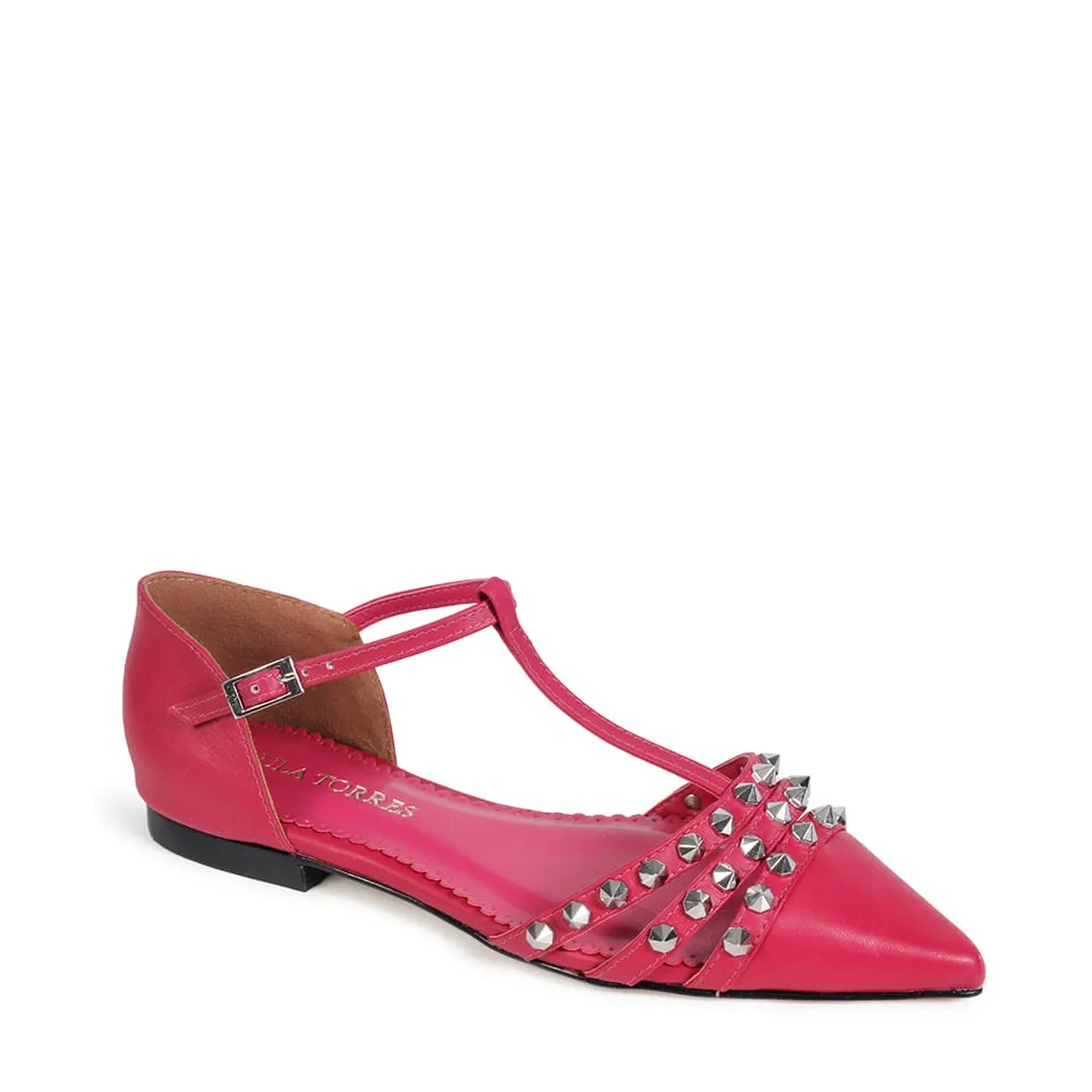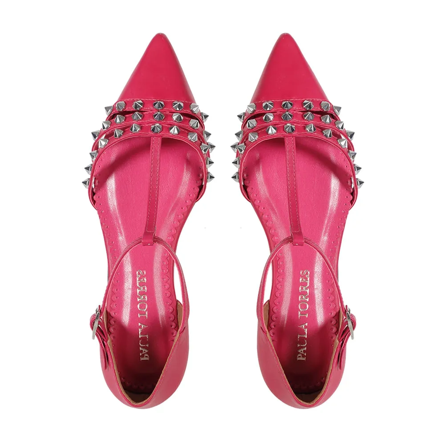 A Sapatilha Cleo é confeccionada em couro. Modelagem em bico fino e fechamento por fivela lateral. Cabedal composto por delicadas tiras de couro, que se contrapõem às spikes metalizadas, criando uma estética feminina e despojada. O contraforte fechado confere conforto ao calce, de maneira sofisticada, totalmente Paula Torres.