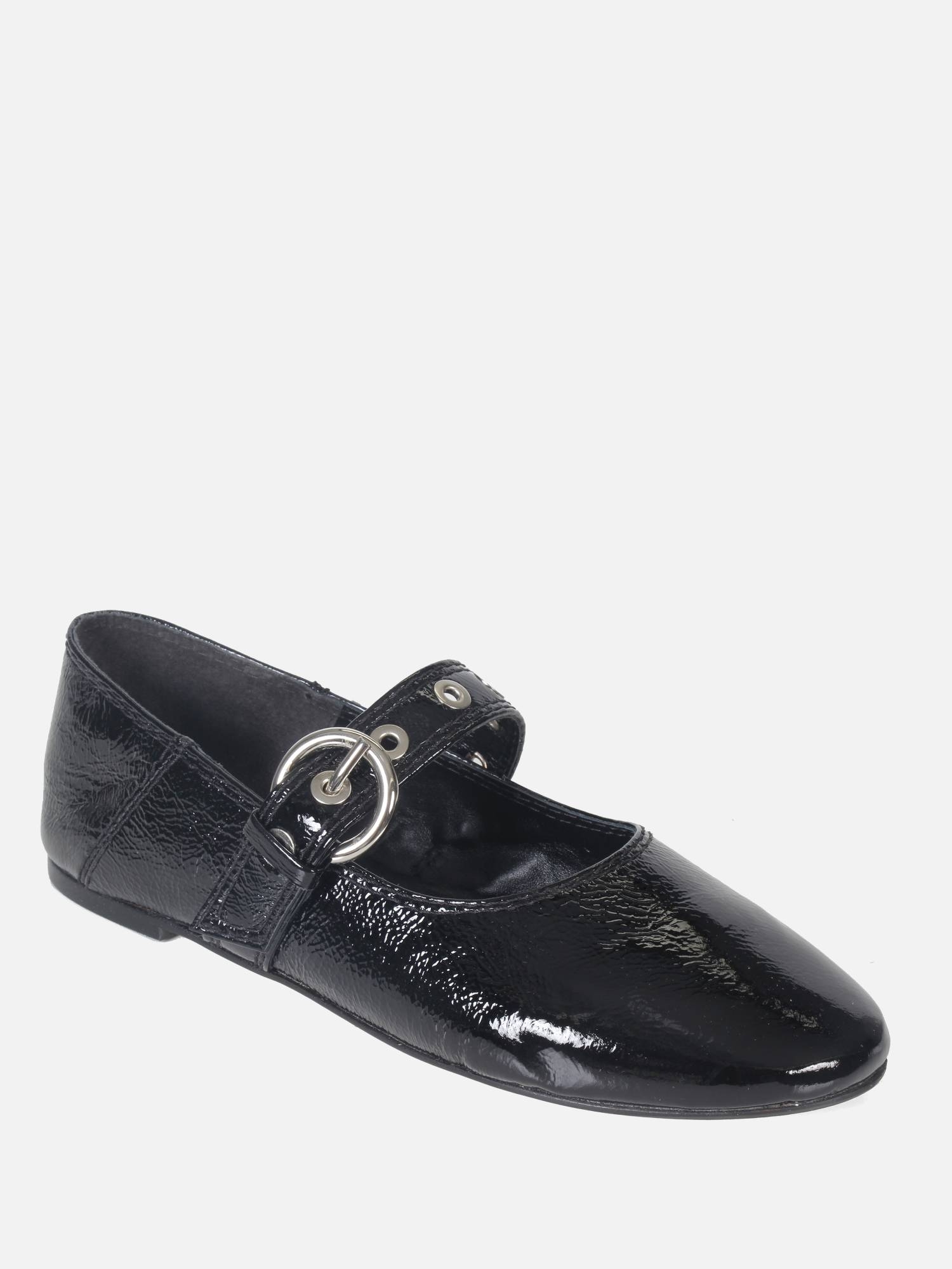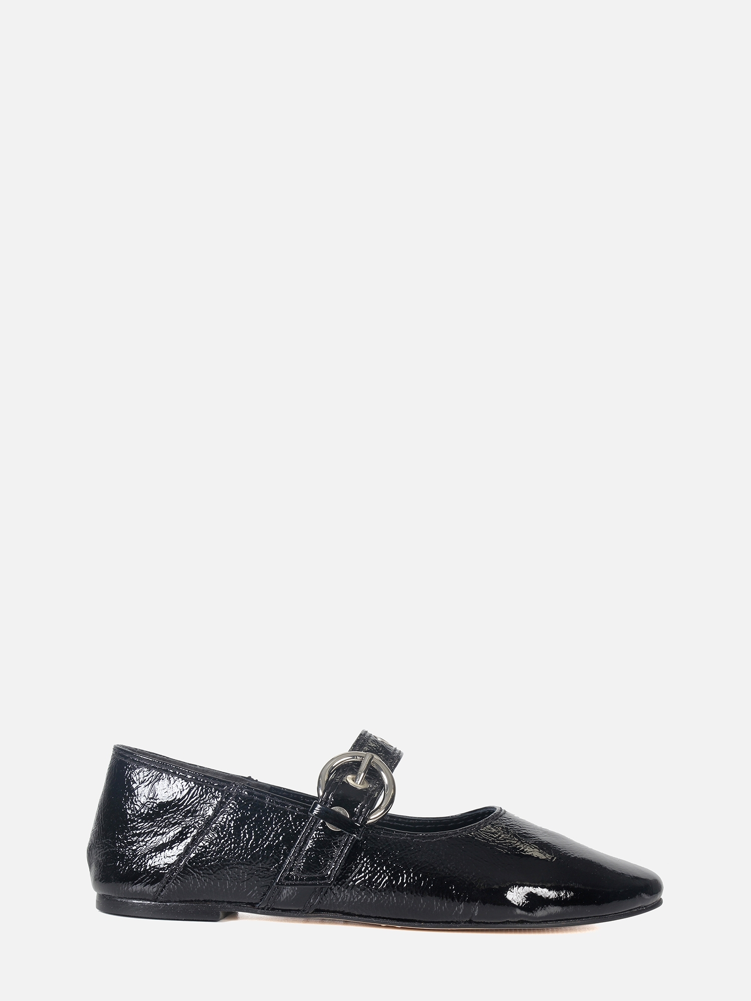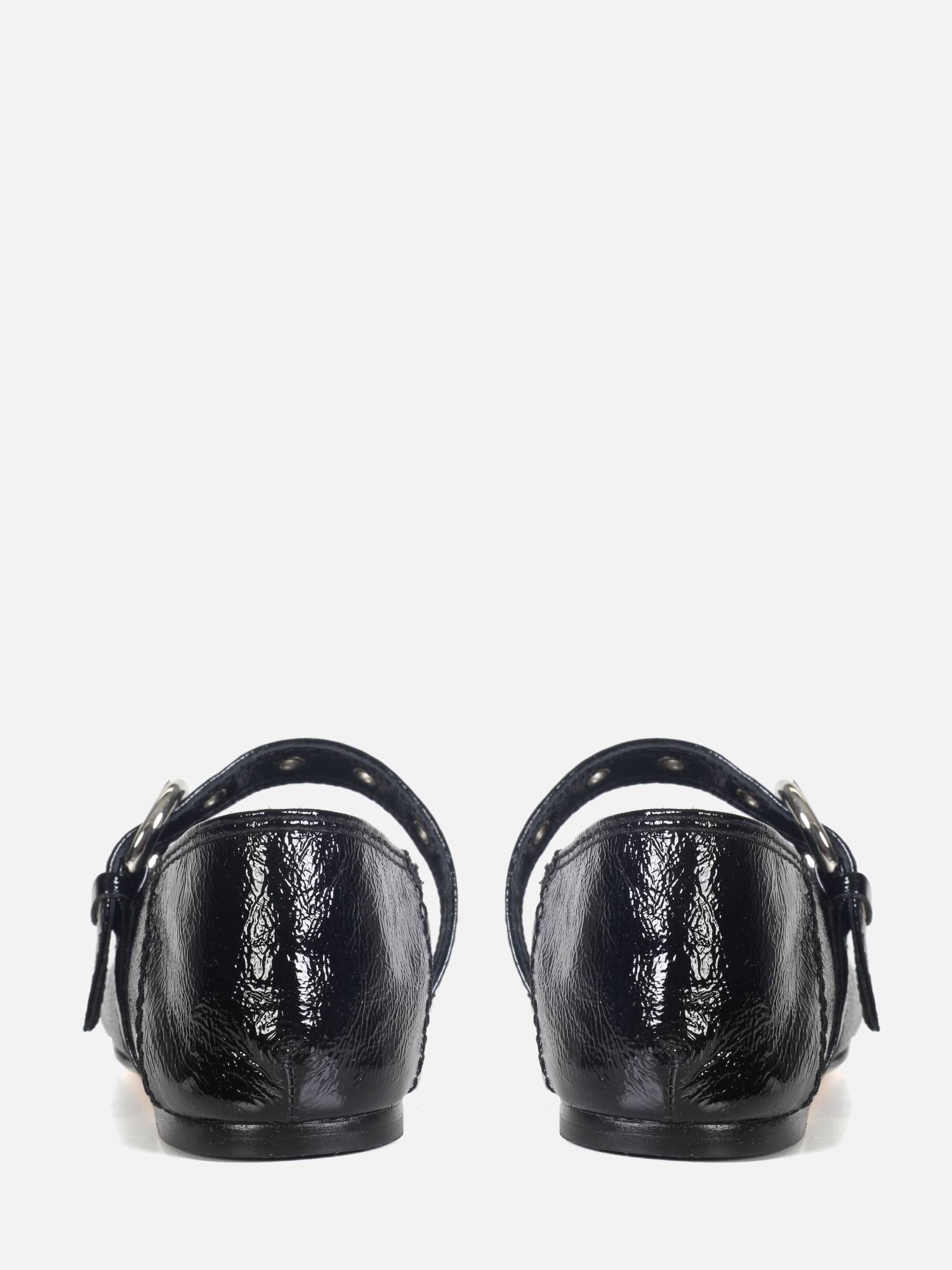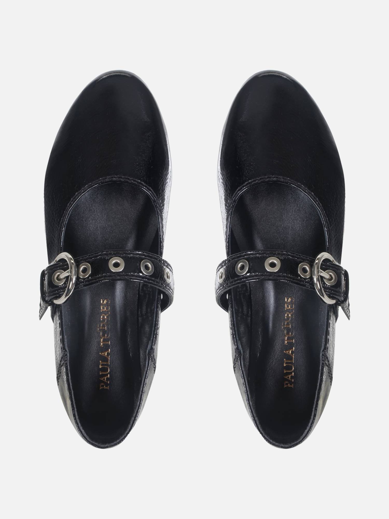 A Sapatilha Cloe é confeccionada em couro verniz show com acabamento amassado, que adiciona textura e estilo. O modelo de bico arredondado conta com uma tira ajustável sobre o peito do pé, decorada com ilhoses em níquel e uma sofisticada fivela lateral. O solado em couro reforça a qualidade e a durabilidade do design.